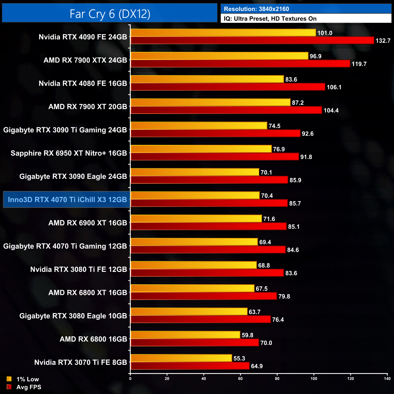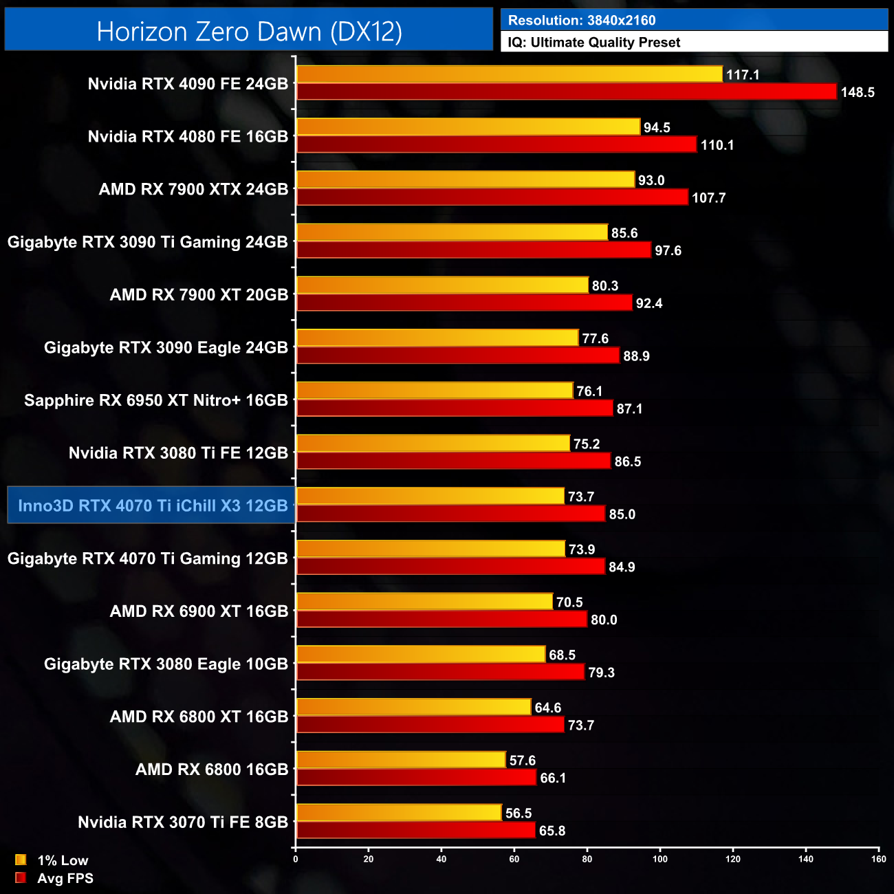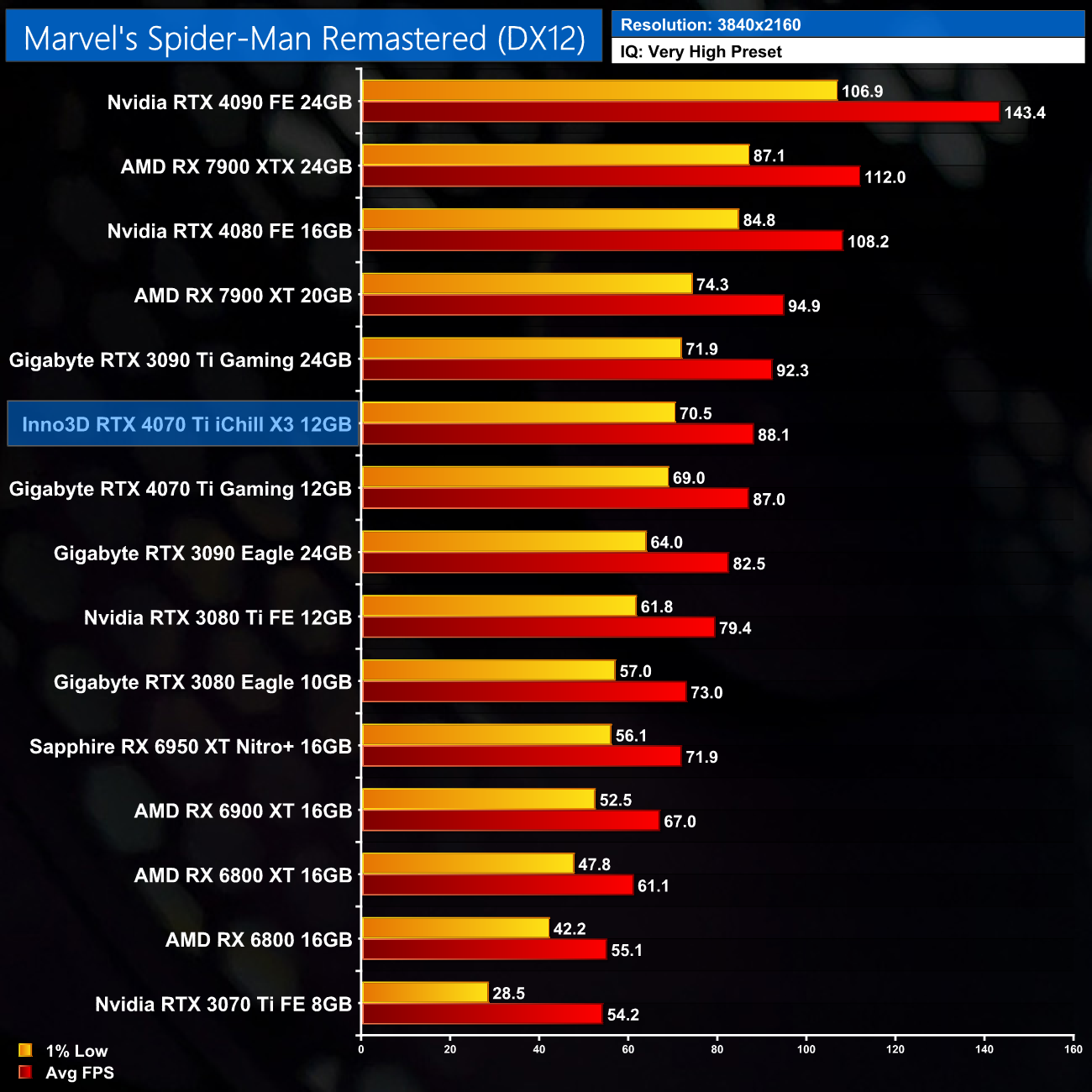 There's very little to split the two RTX 4070 Ti cards in terms of gaming benchmarks however. Over the five games we tested, the iChill X3 was never more than 1% faster than the Gigabyte Gaming OC, so they are as fast as each other. That's not a bad thing, but it explains why we never recommend buying one particular card over another based on its factory overclock, as it means very little these days.