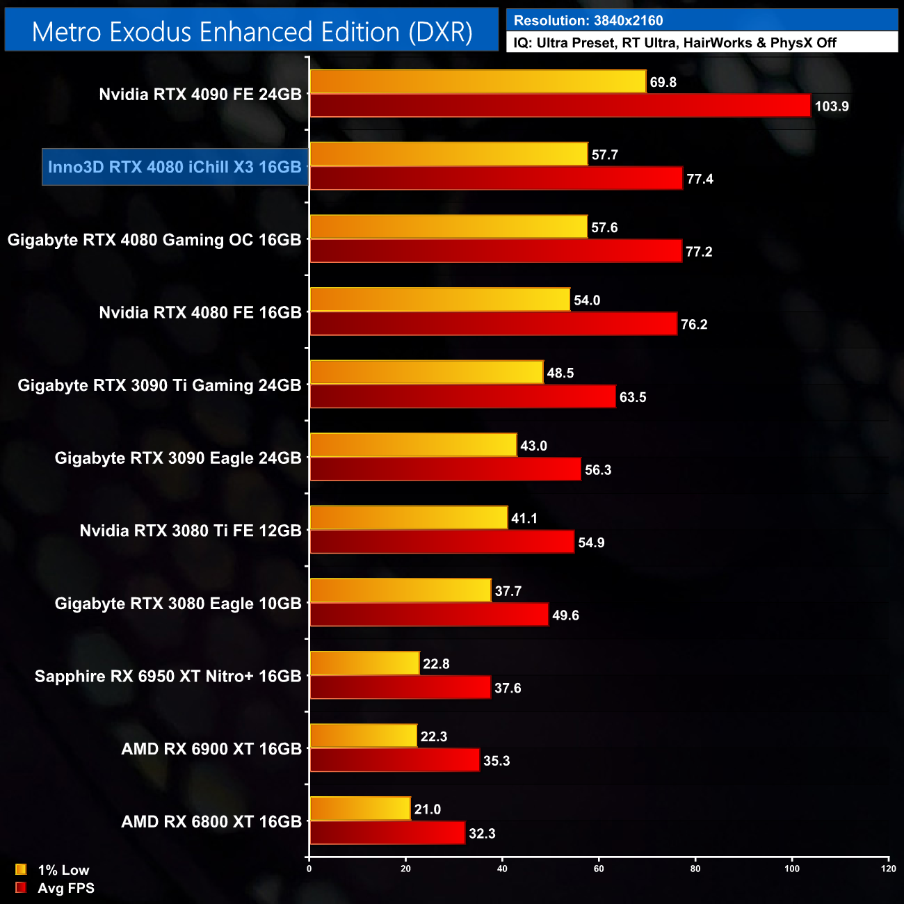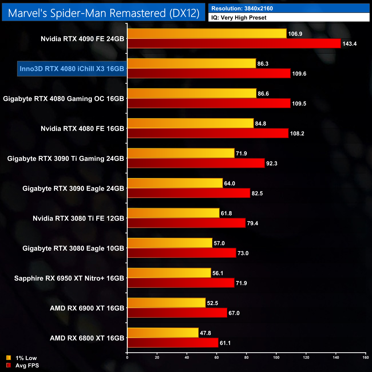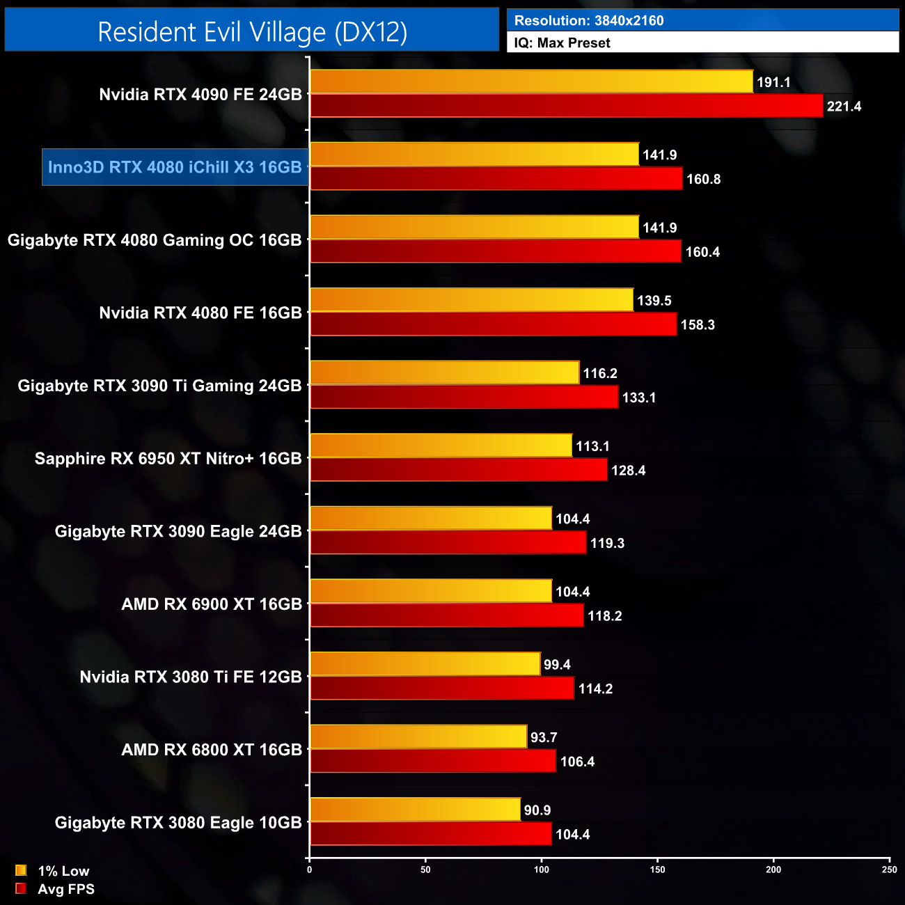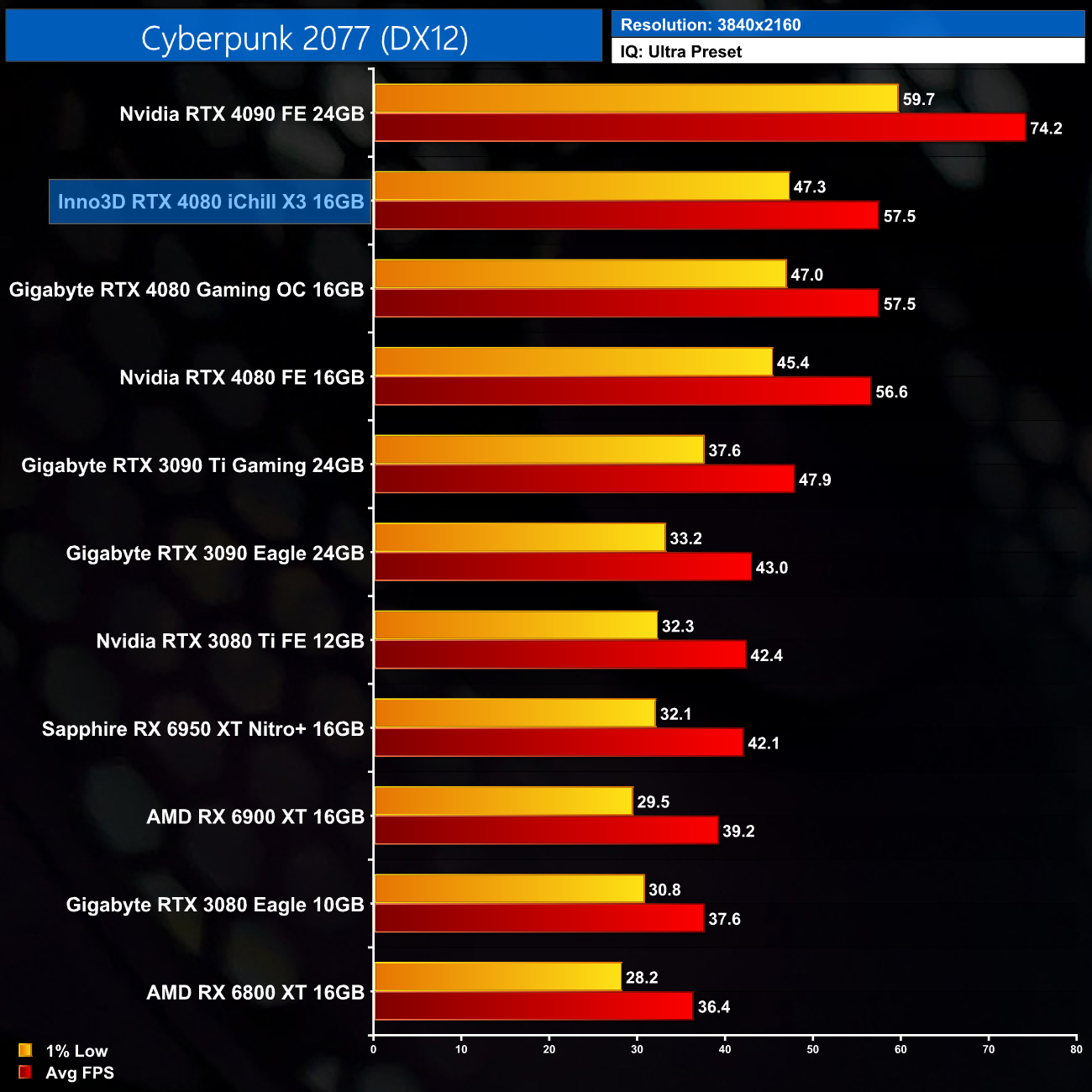 As expected, gaming performance is very close to the other RTX 4080s we have tested. In fact, we never saw the iChill X3 come in more than 2% faster than the Founders Edition, so there’s really no tangible difference in terms of actual frame rates, which is why we never recommend buying a card based on the factory overclock.