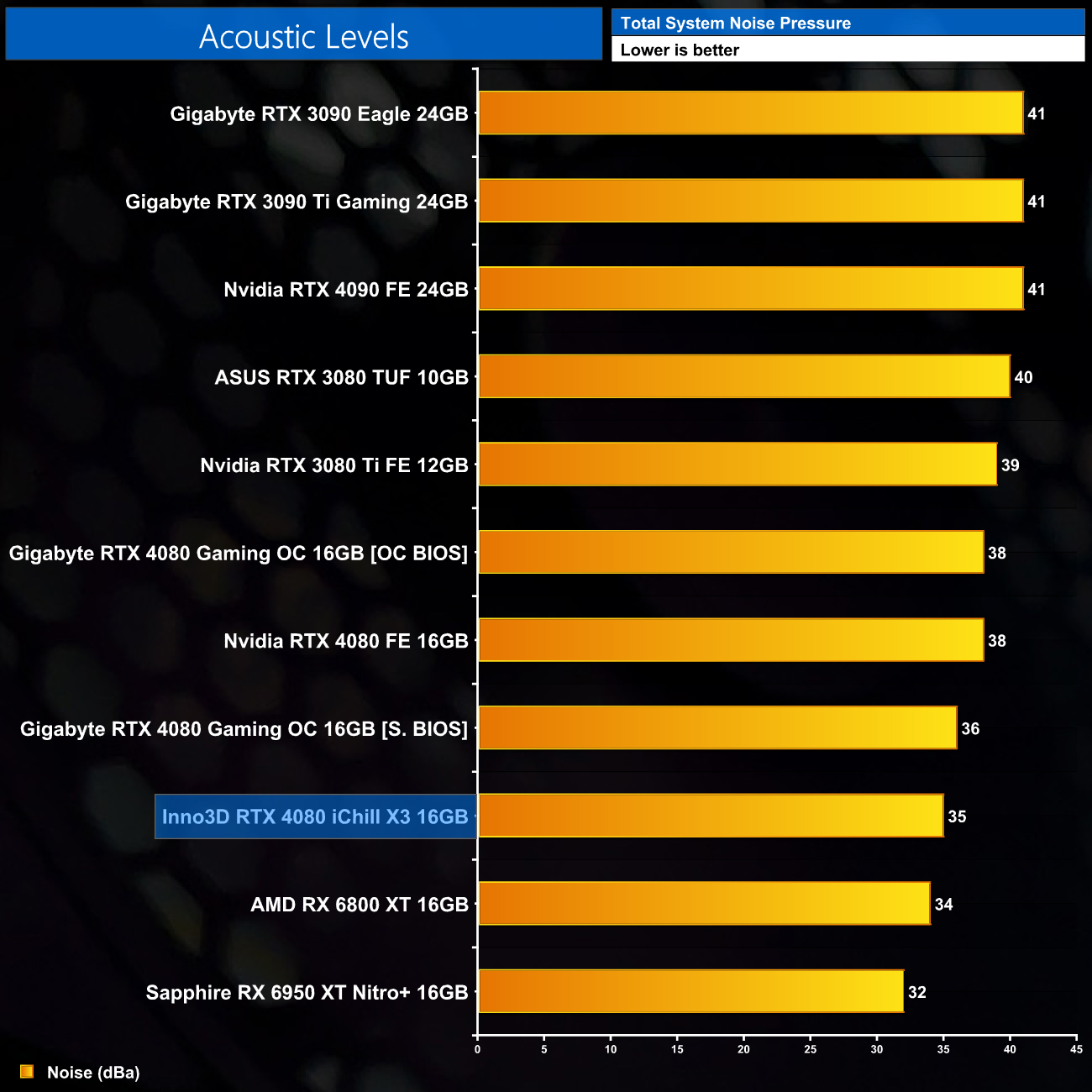 The Inno3D iChill X3 is the quietest 4080 we’ve tested, producing just 35 dBa of noise – making it quieter than the Gigabyte Gaming OC, even when using the Silent BIOS. We saw the fans spin at just 1250rpm, or 39% speed.