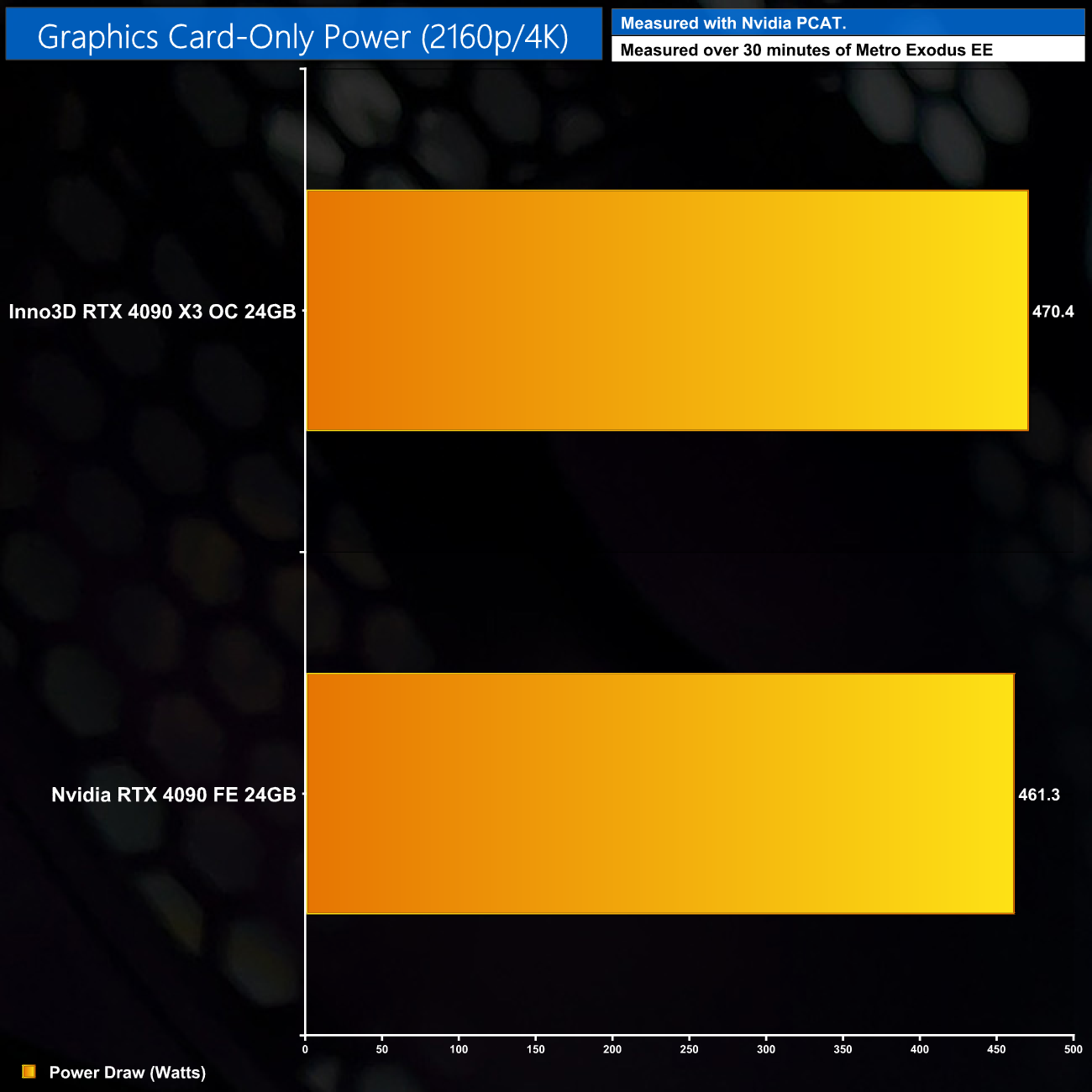 We measure power draw of the graphics card-only, using Nvidia's PCAT tool. A reading under load comes from running Metro Exodus Enhanced Edition for 30 minutes.