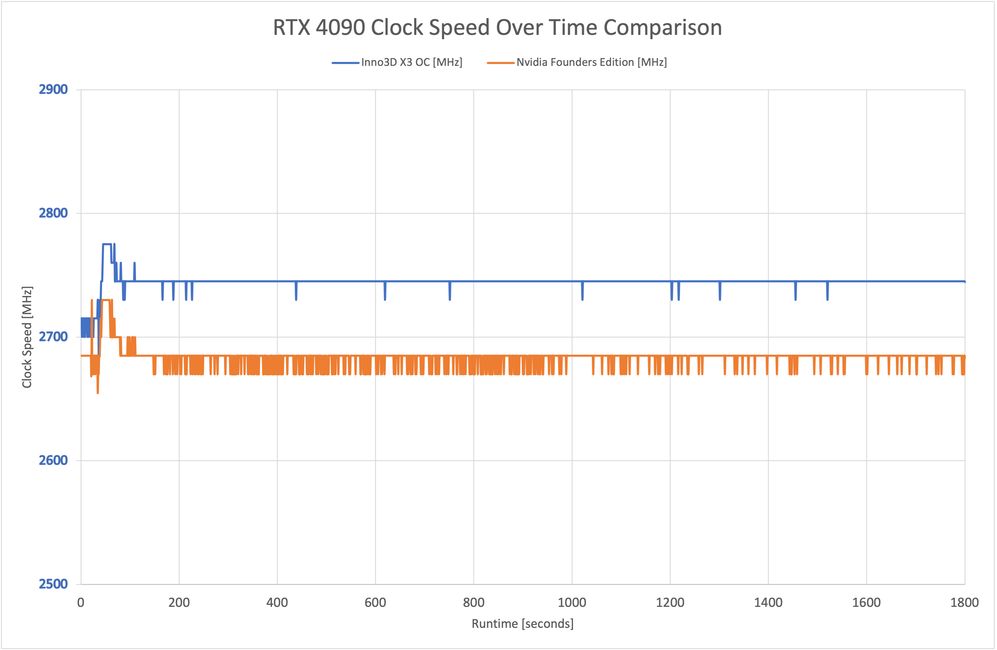 With just a small factory overclock, the Inno3D X3 OC doesn't run much faster than the Founders Edition at all. There is some difference, but it is tiny – with the X3 OC averaging 2744MHz over our 30-minute stress test, compared to 2683MHz for the Founders Edition.