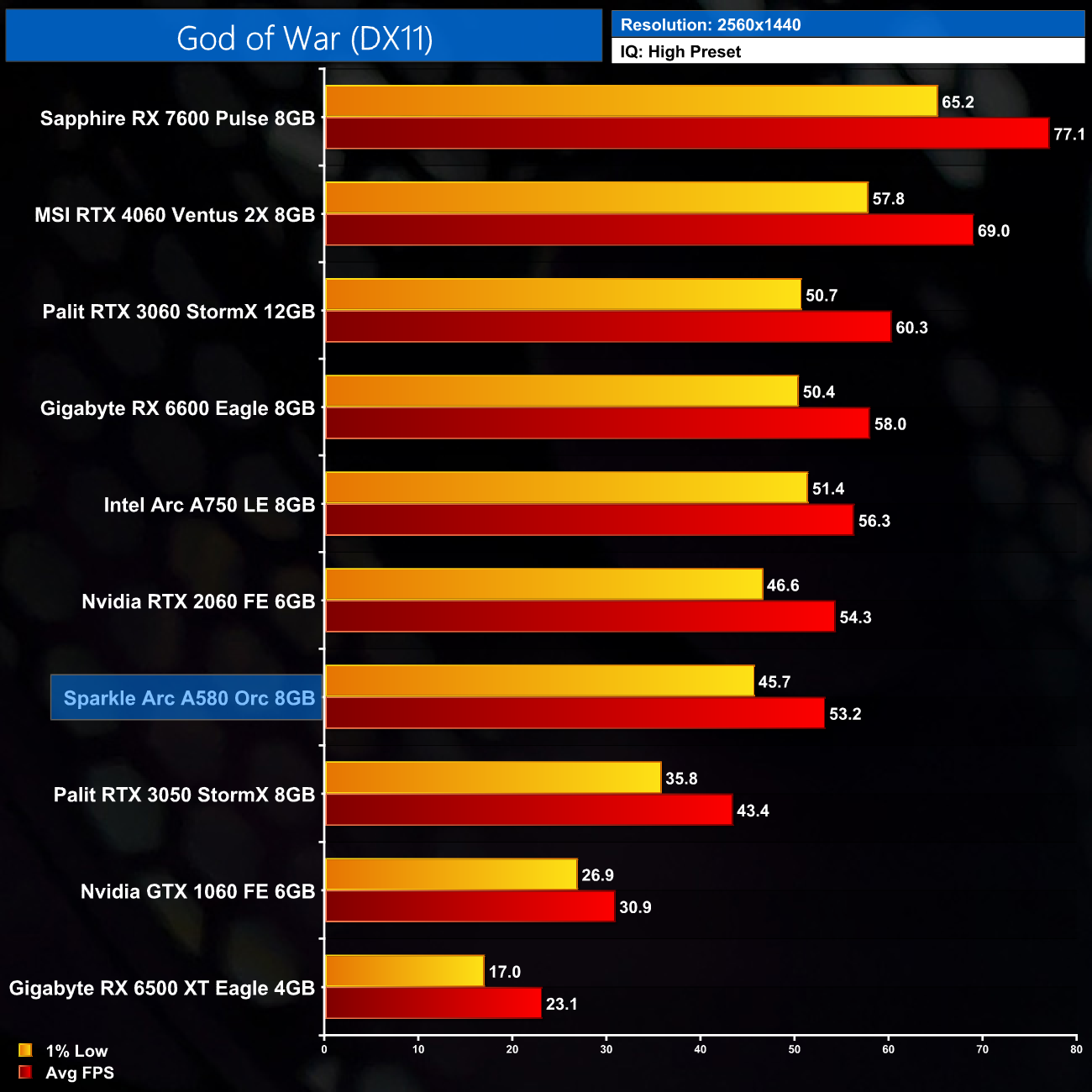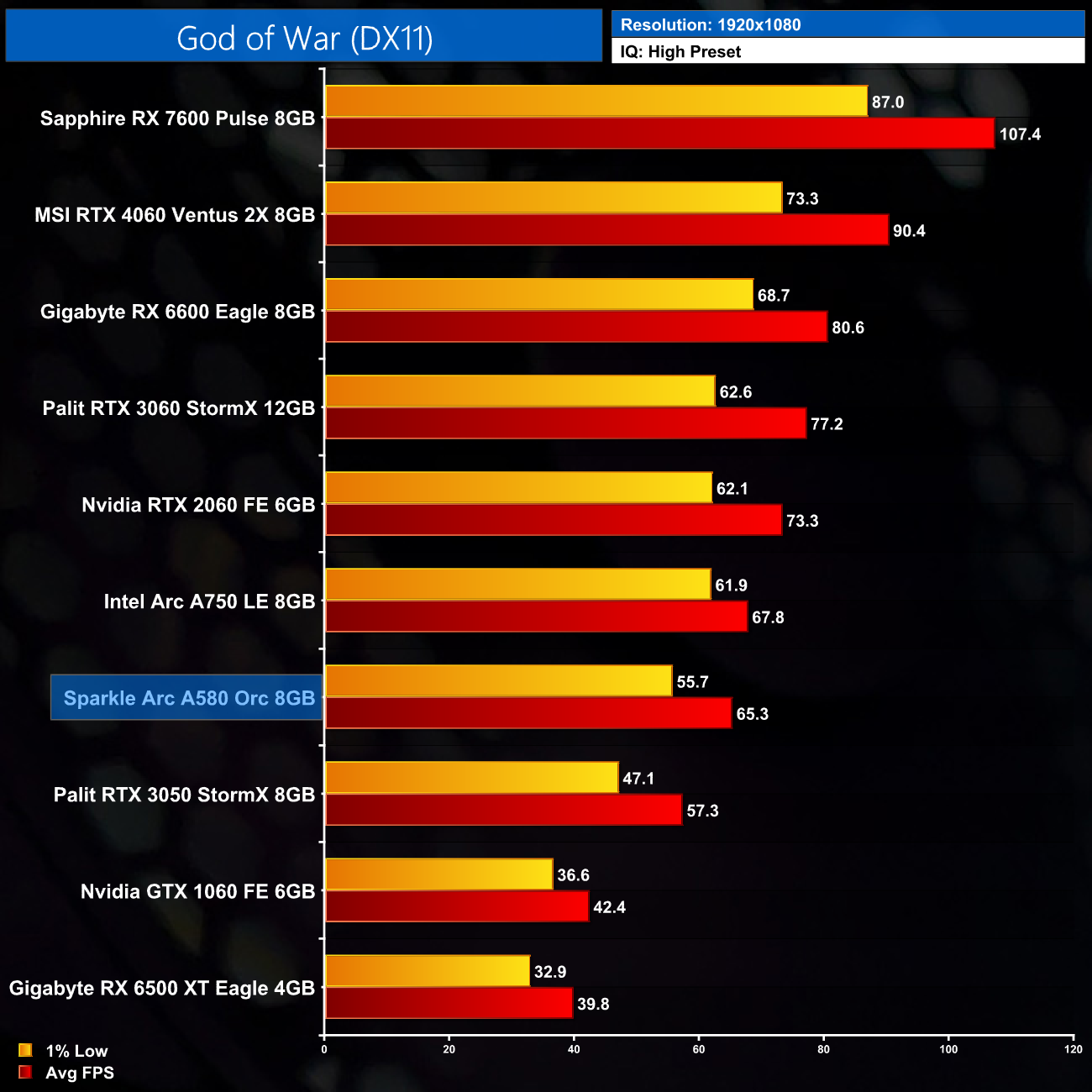 God of War shows particularly narrow scaling for the A580 versus the A750, as there's just a 4% gap between the two GPUs at 1080p. The A580 is 19% slower than the RX 6600, but 14% faster than the RTX 3050.