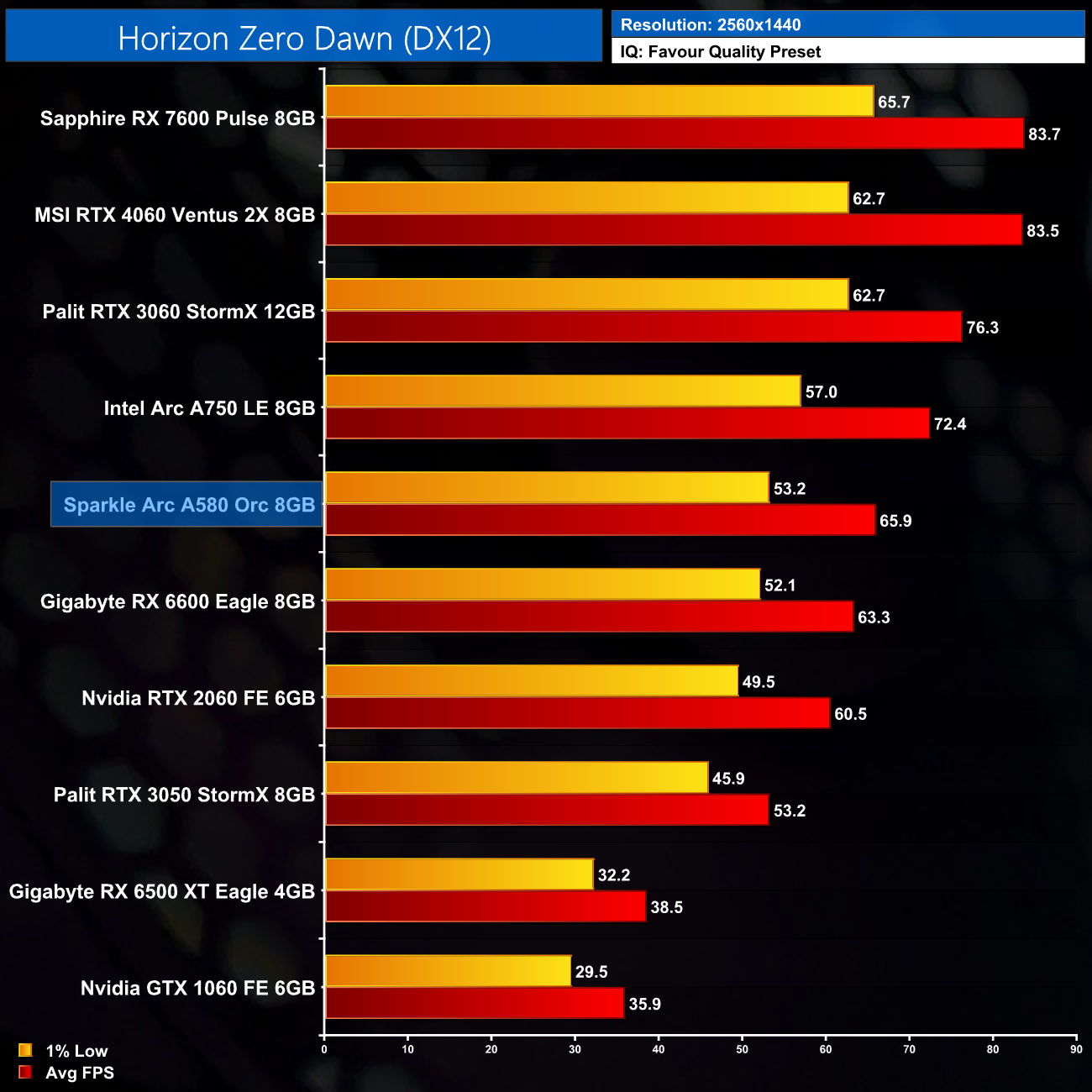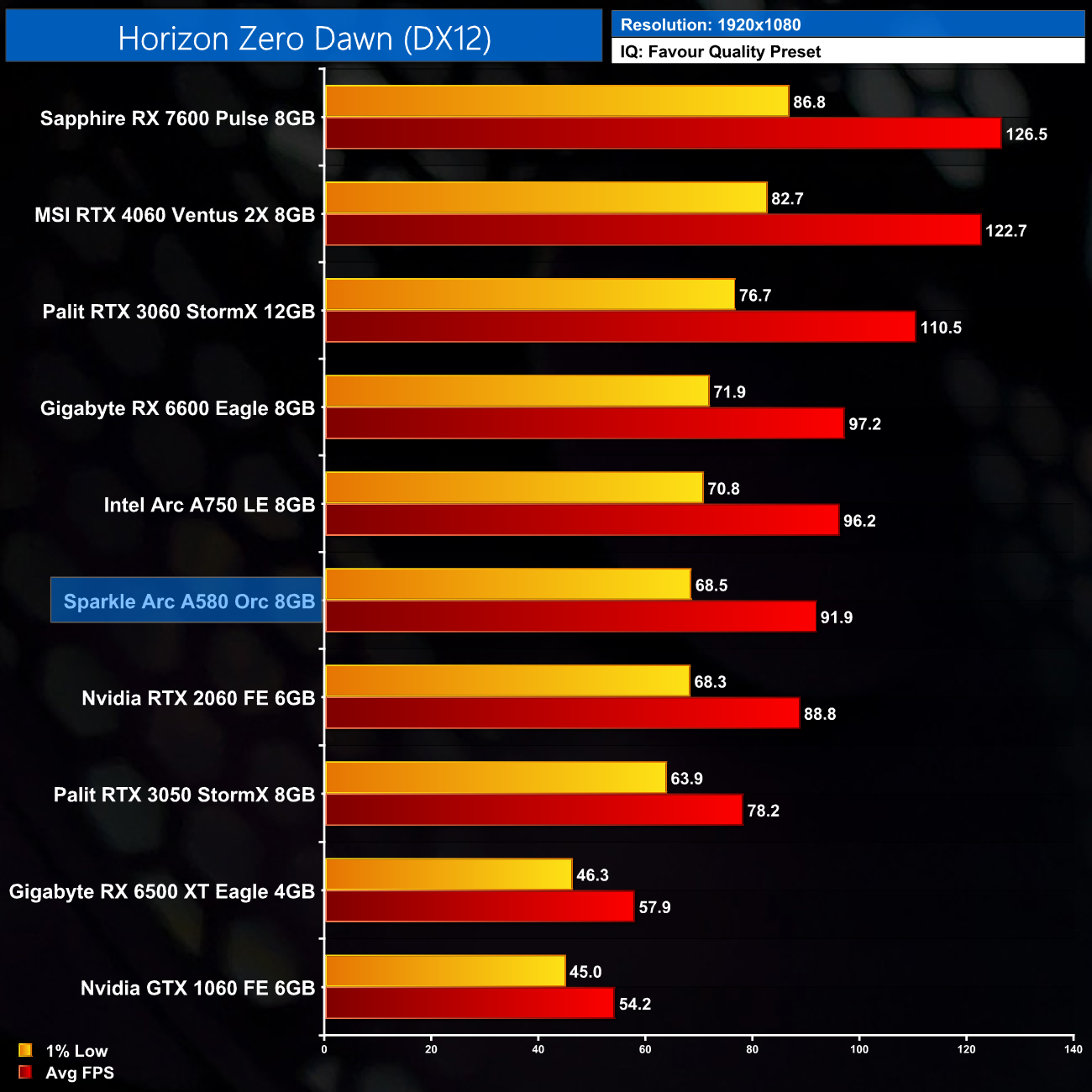 Next up is Horizon Zero Dawn, where at 1080p the A580 is delivering very similar performance to the RTX 2060. It's still only 5% slower than the A750, but it's also only 6% behind the RX 6600 which isn't too bad considering what we saw in Forza and God of War.