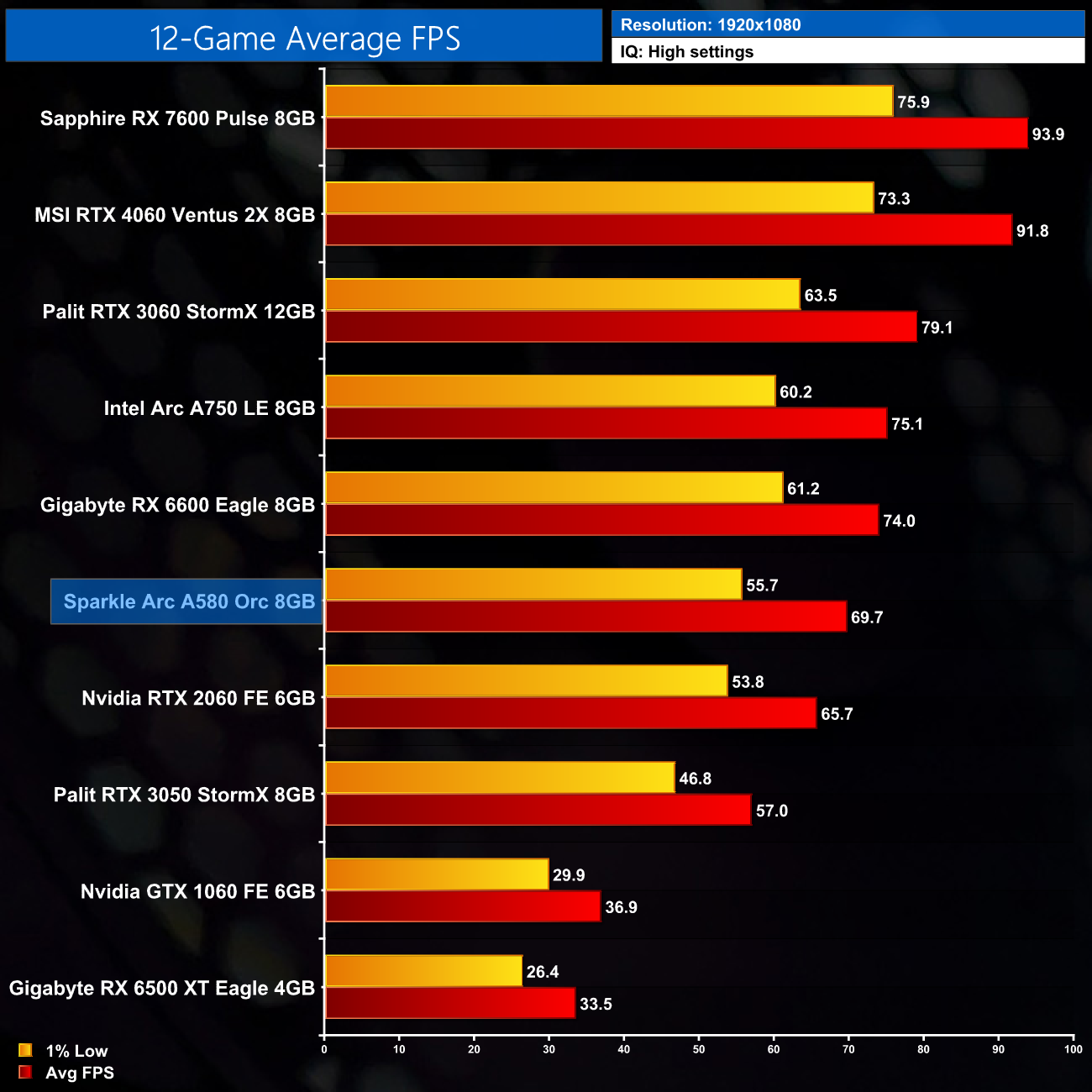Overall then, across the 12 games tested, the A580 delivered an average of 70FPS at 1080p. That makes it 6% slower than the RX 6600 looking at the average frame rate, but it's actually 9% slower in terms of the 1% lows. It's also 6% ahead of the RTX 2060, but just 7% behind the Arc A750.