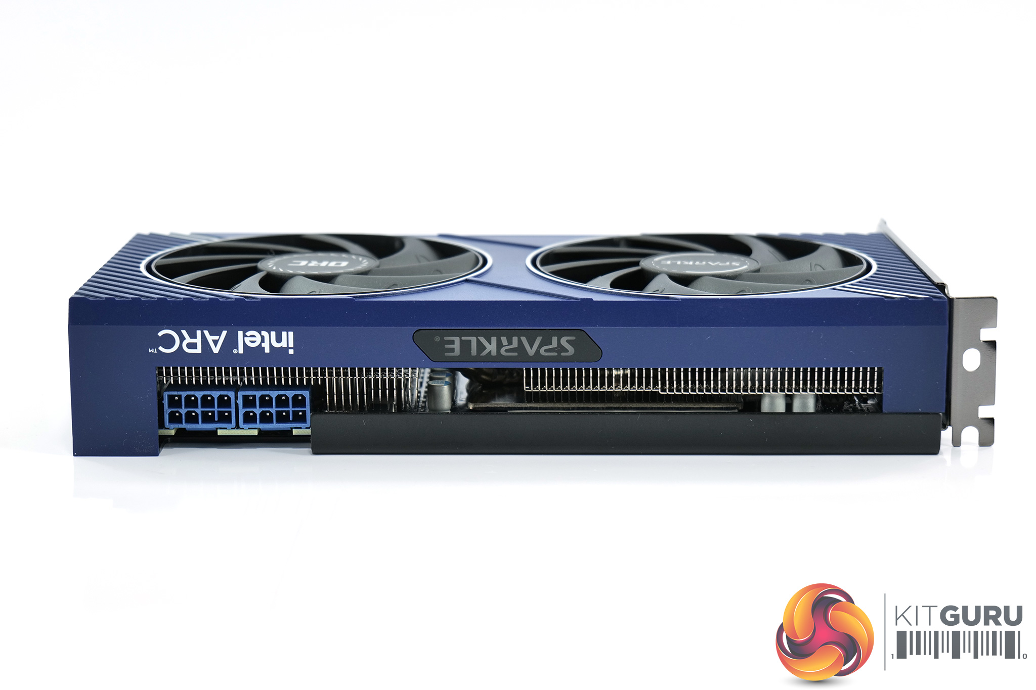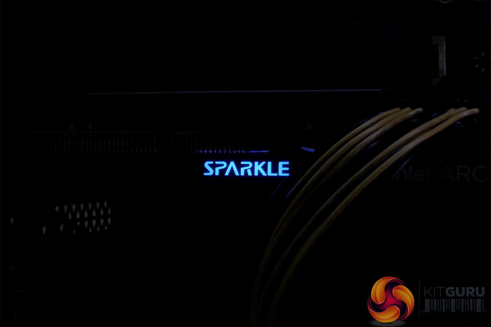 The front side is home to the Sparkle logo (the only LED lighting zone on the card) and the Intel Arc branding printed in white text.