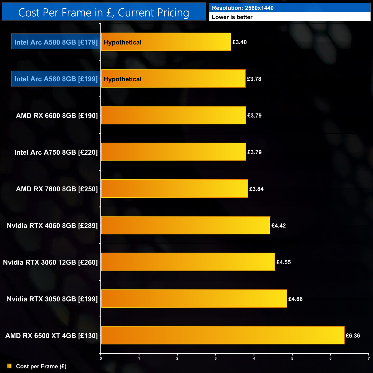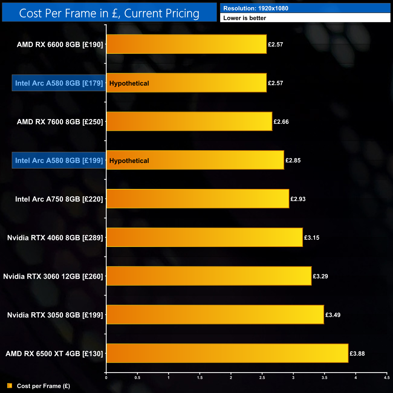 Using the average frame rate data presented earlier in the review, here we look at the cost per frame using the current UK retail prices for each GPU. Please note, UK pricing for the A580 is unconfirmed at the time of publication. The below data is based on two hypothetical price-points for this GPU (£179 and £199).