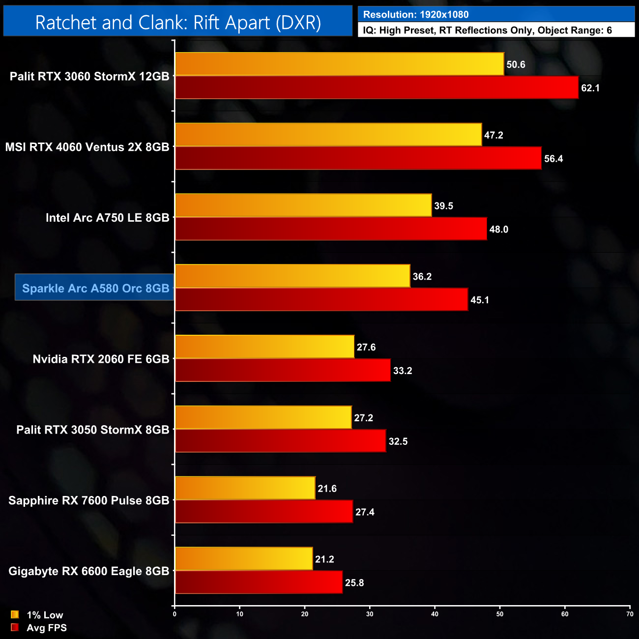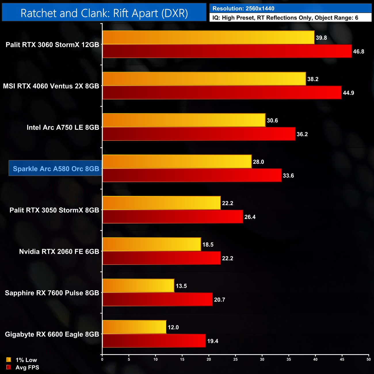 Ratchet and Clank is next and even with just RT Reflections, we're down to just 45FPS for the A580, and 36FPS for the 1% lows. It's considerably faster than the RTX 2060 and RTX 3050, but the fact the RTX 3060 12GB is actually faster than the RTX 4060 shows us that VRAM is the main limiting factor here, even at these settings.