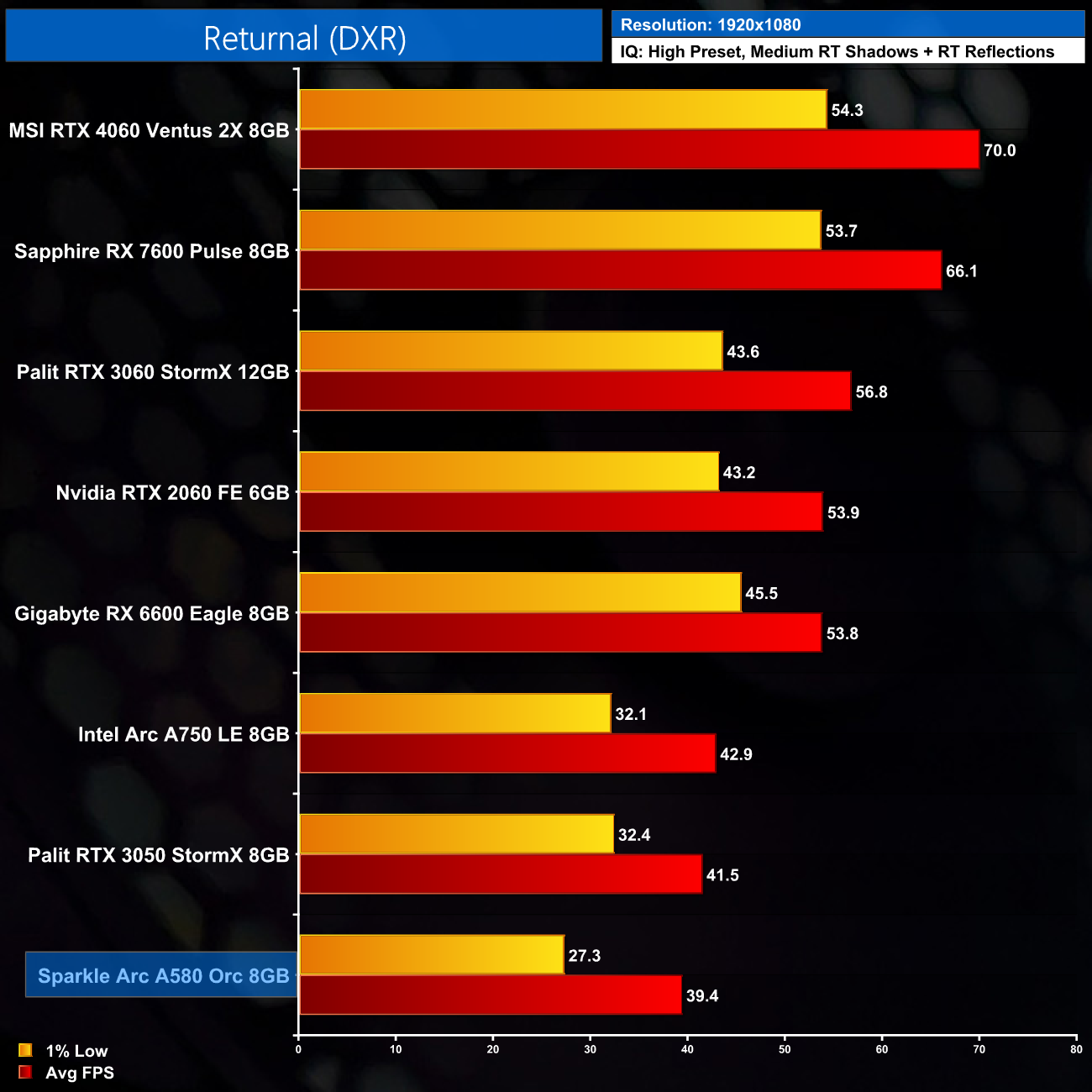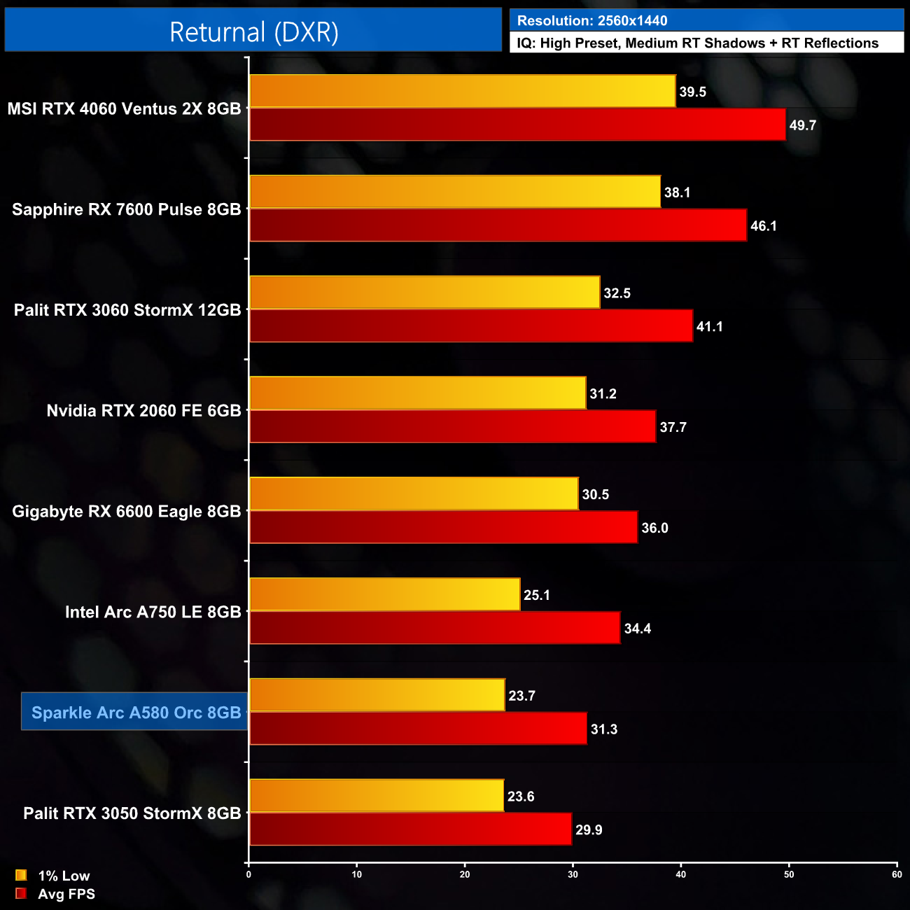 Next we come to Returnal and there's clearly some sort of driver issue with RT enabled in this one, the A580 drops like a stone to the bottom of the chart, and even the A750 does very poorly which goes against everything else we've seen today.