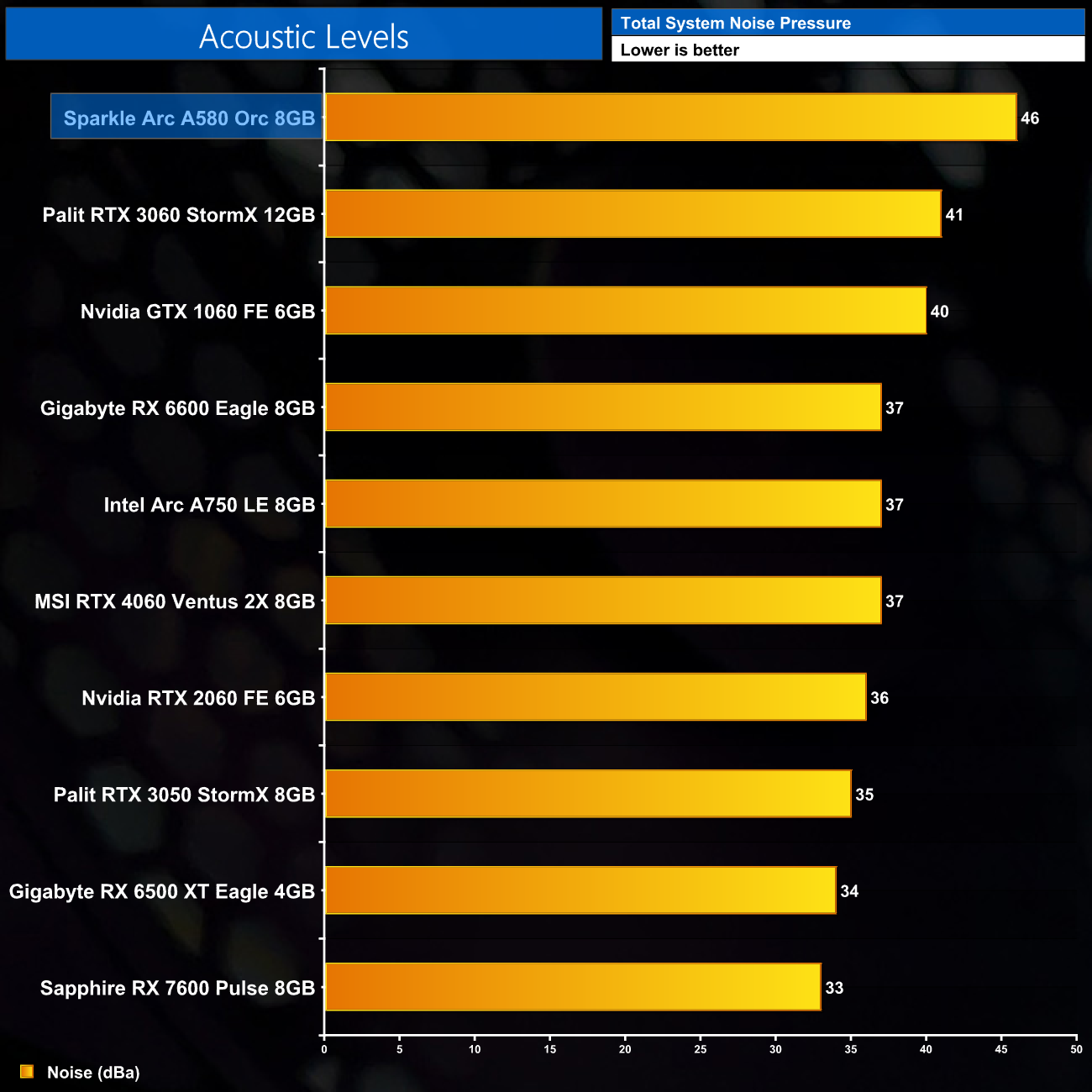 Unfortunately, the Orc is a loud graphics card. I saw the fans hit upwards of 2300RPM during a 30-minute stress test, and that resulted in a noise reading of 46dBa – it is noticeably louder than the A750 Limited Edition and will be clearly audible over your case fans. I didn't notice any coil whine, but the fan noise alone is fairly unpleasant.