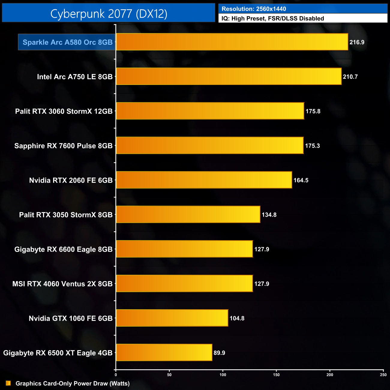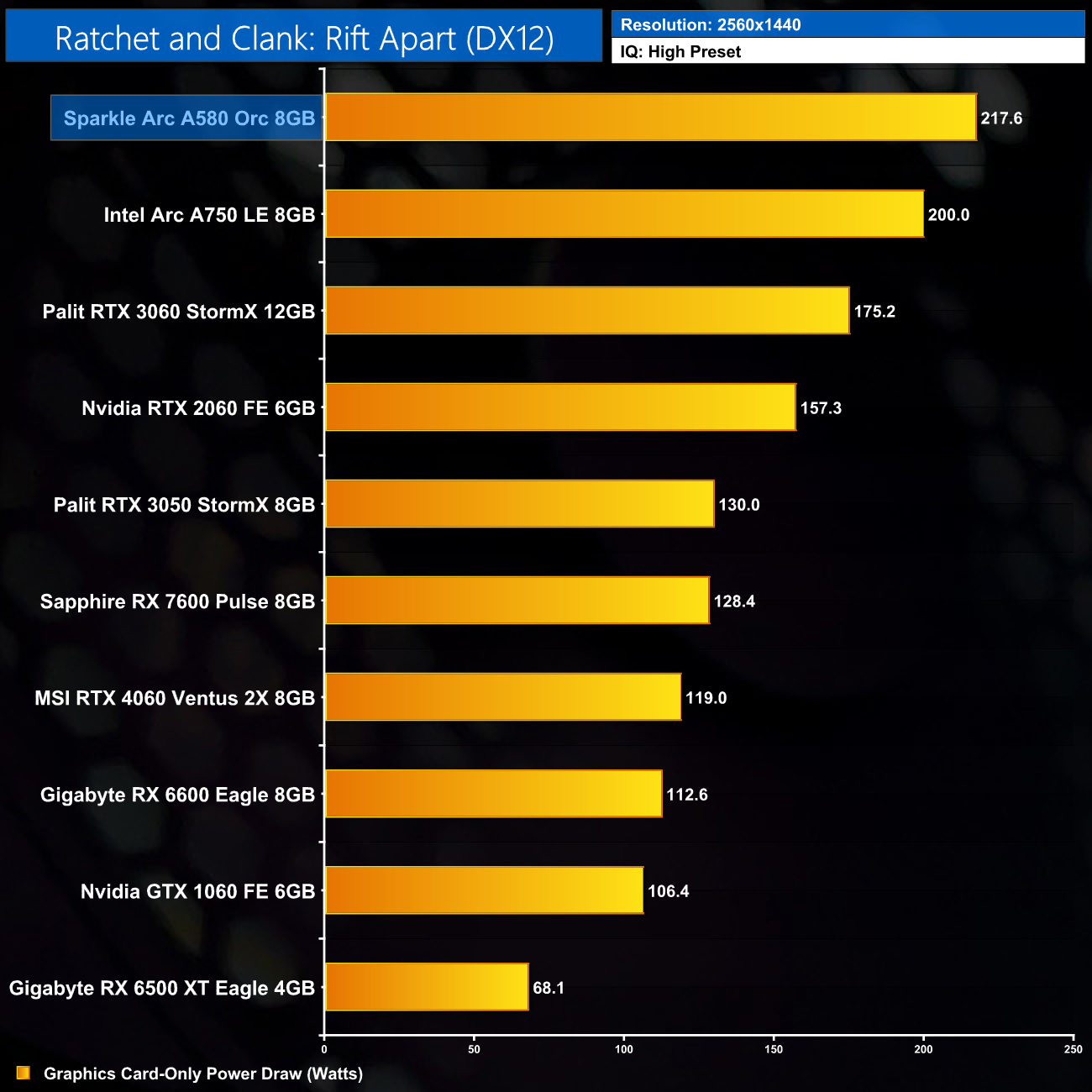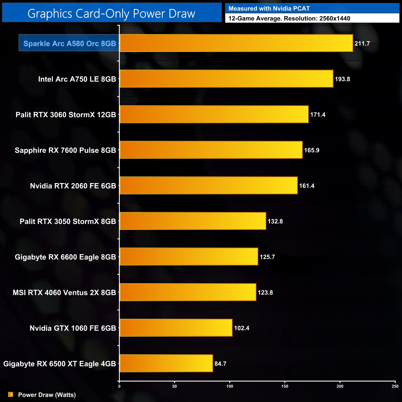 At 1440p, power draw is increased for the A580, this time averaging 211.7W. That's still a sizeable increase over the A750 Limited Edition and an eye-watering 68% increase versus the RX 6600.