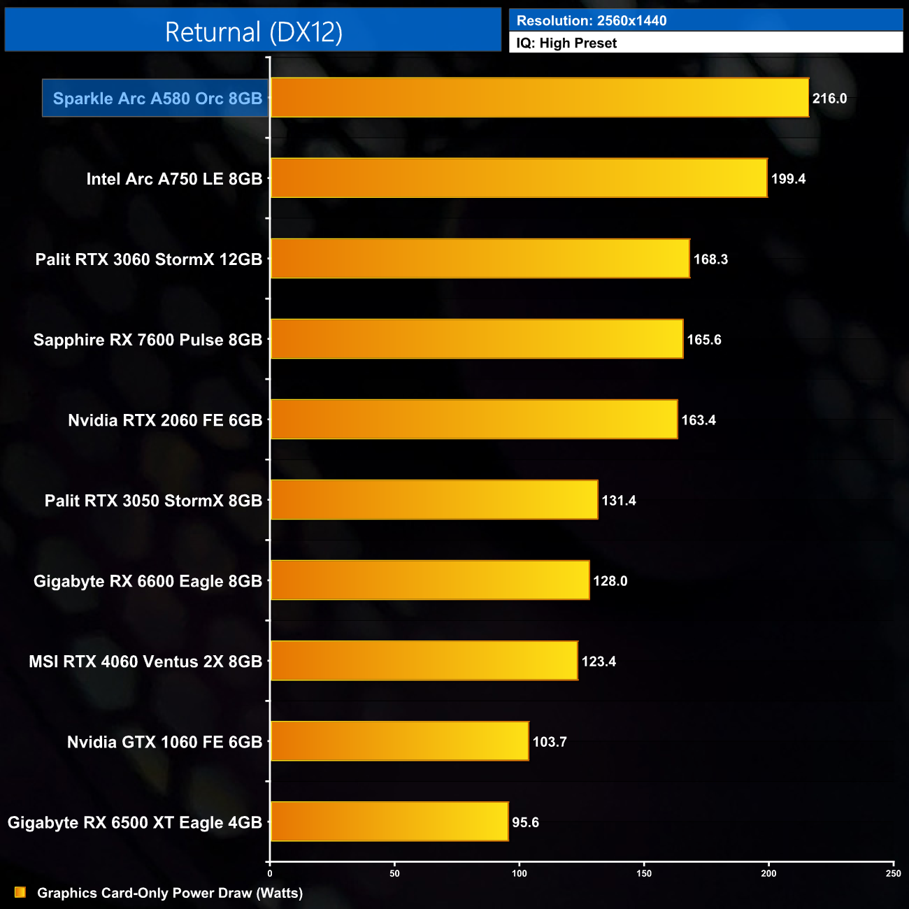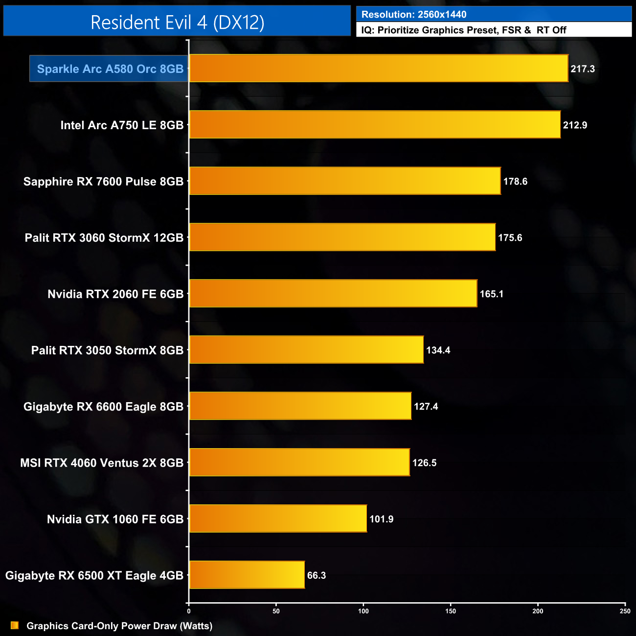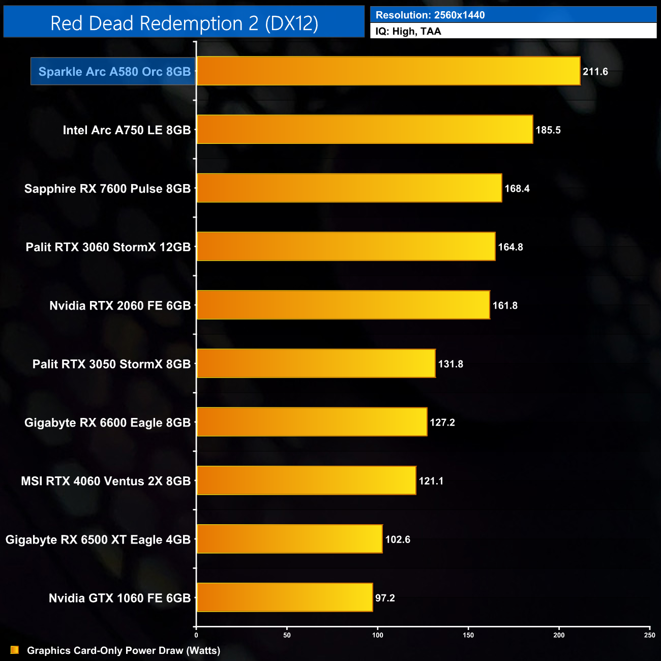 At 1440p, power draw is increased for the A580, this time averaging 211.7W. That's still a sizeable increase over the A750 Limited Edition and an eye-watering 68% increase versus the RX 6600.
