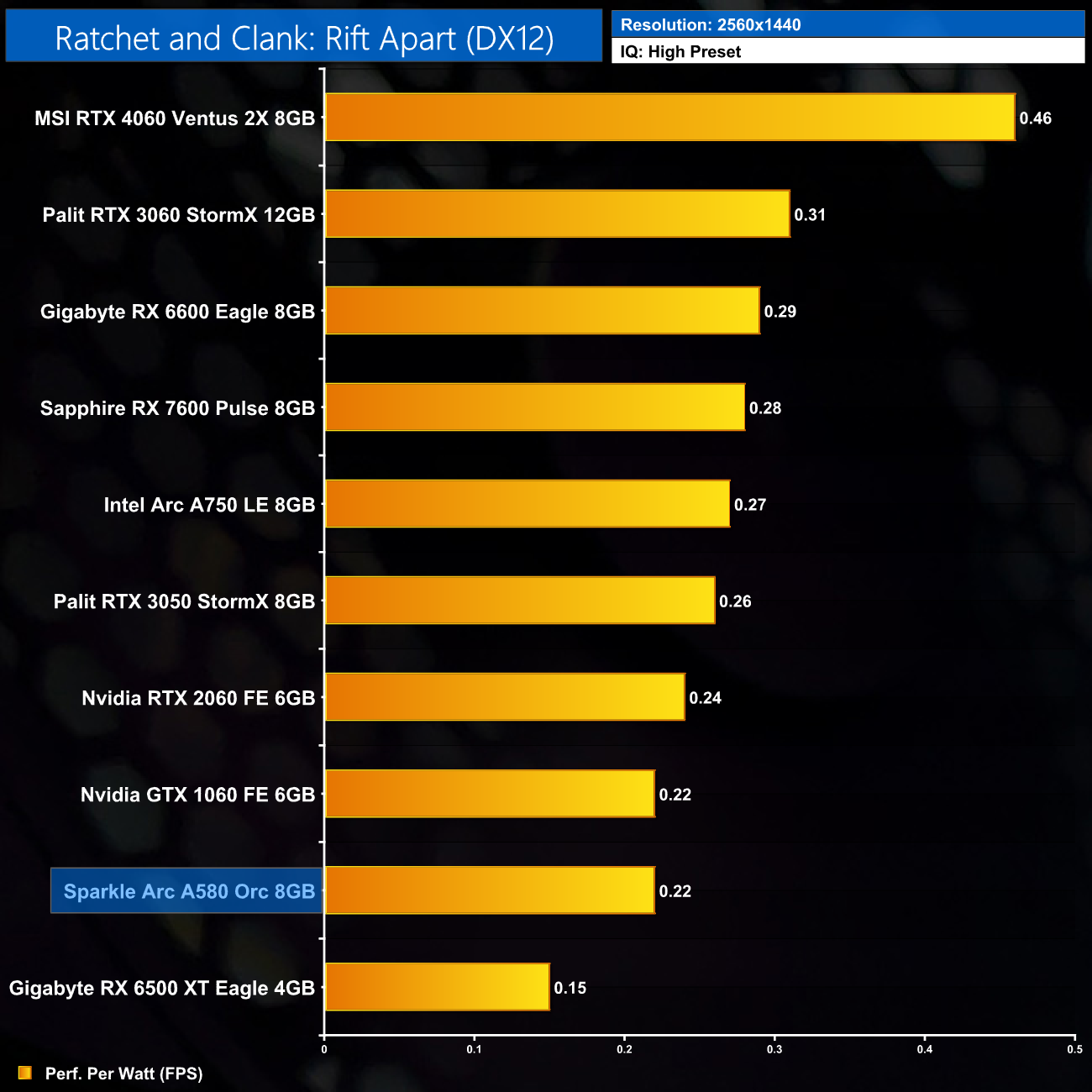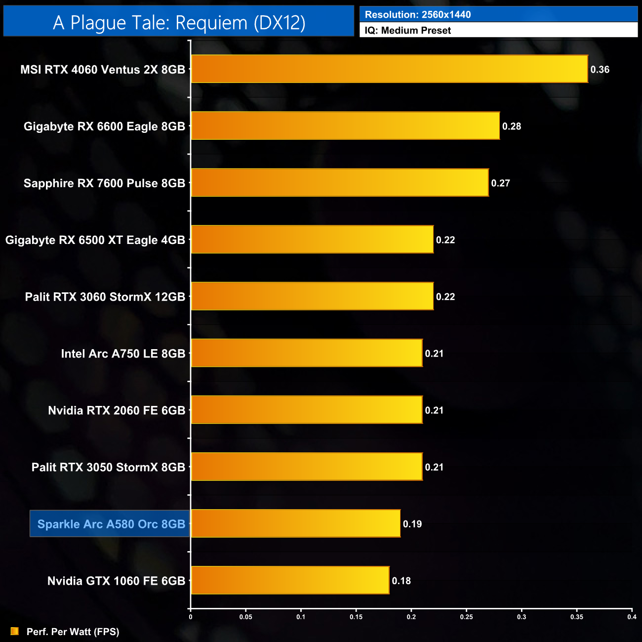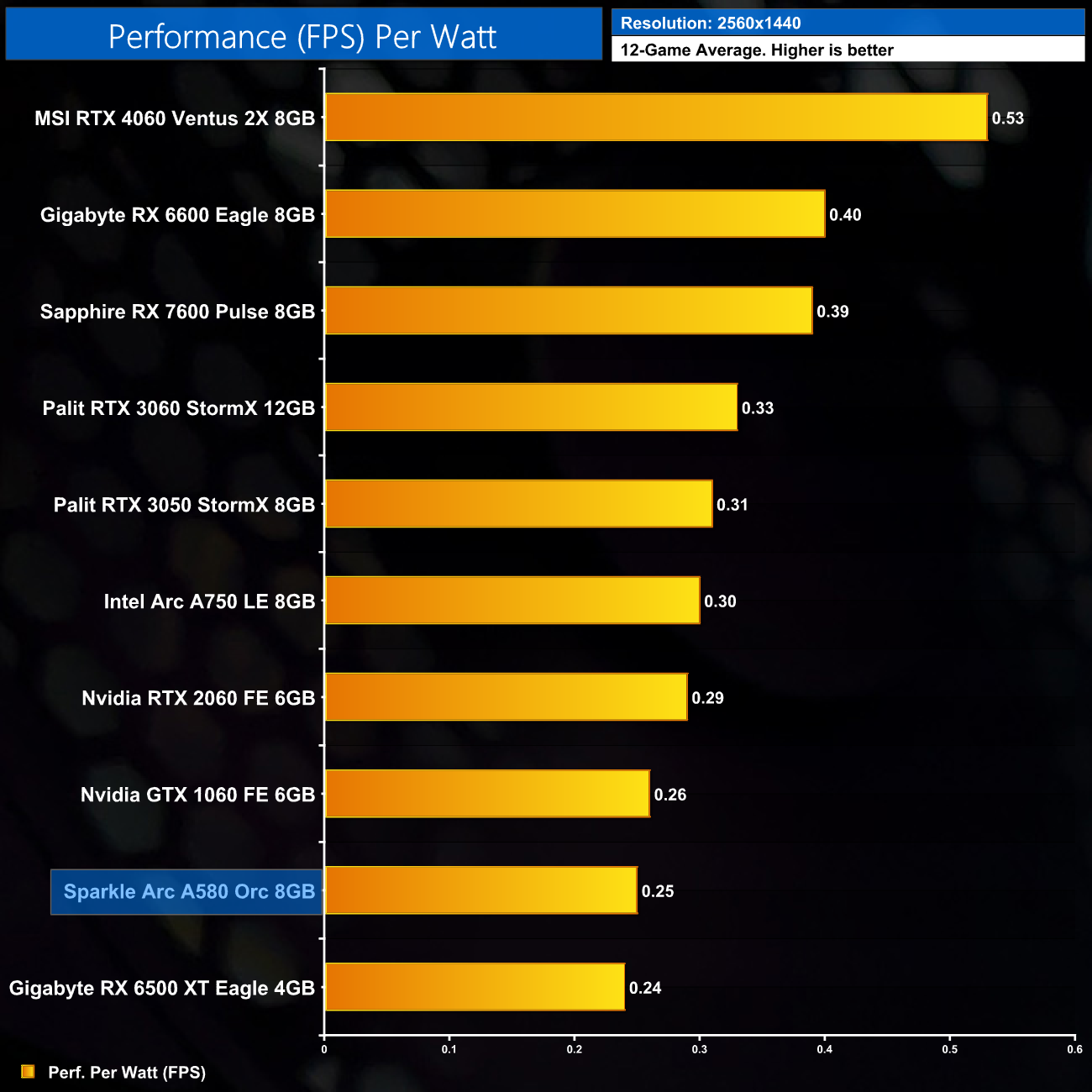 The same goes for 1440p, too. At this resolution it is now a touch more efficient than the RX 6500 XT, but it's still behind the 1060 6GB, and is miles off the pace when compared to the RX 6600.