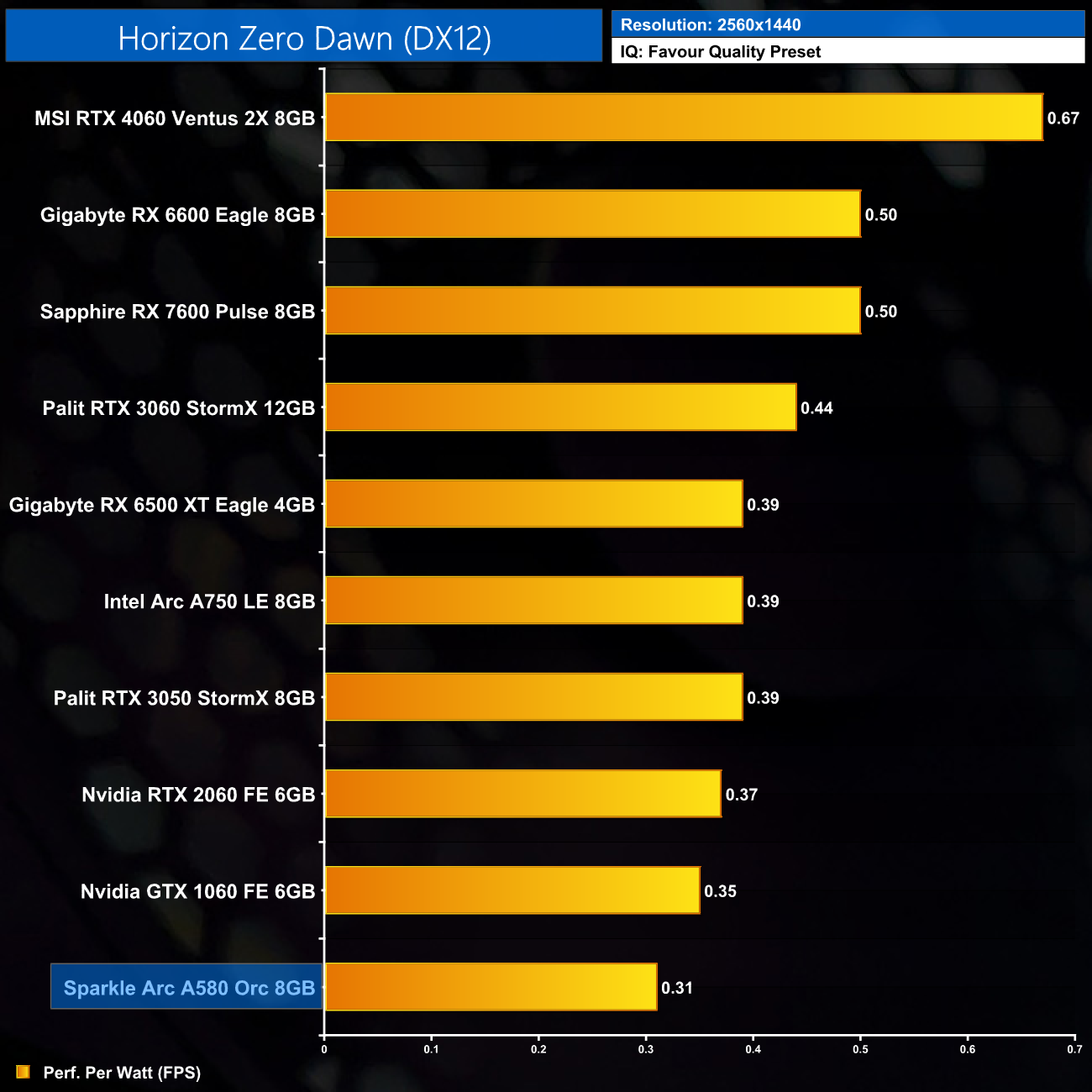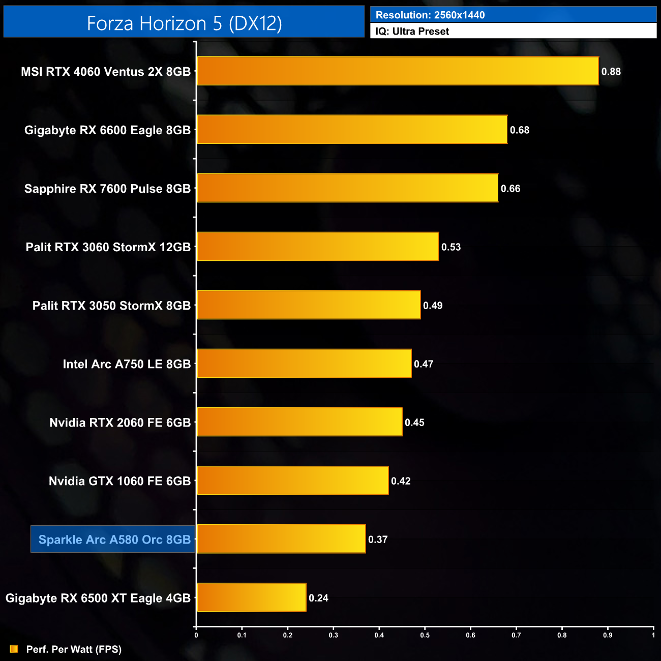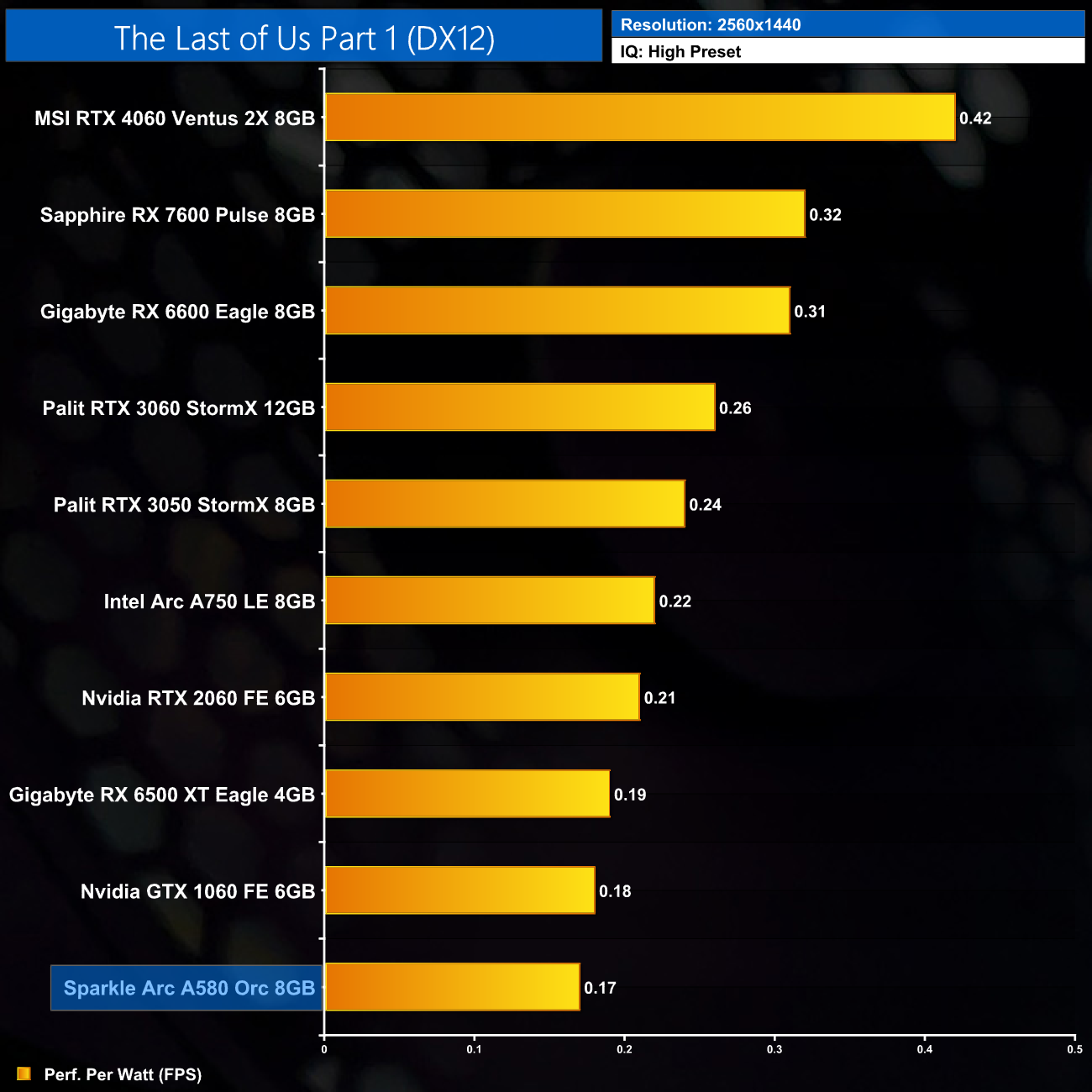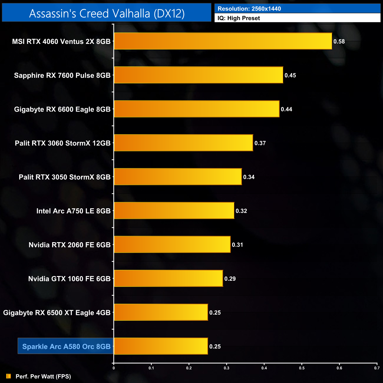 The same goes for 1440p, too. At this resolution it is now a touch more efficient than the RX 6500 XT, but it's still behind the 1060 6GB, and is miles off the pace when compared to the RX 6600.