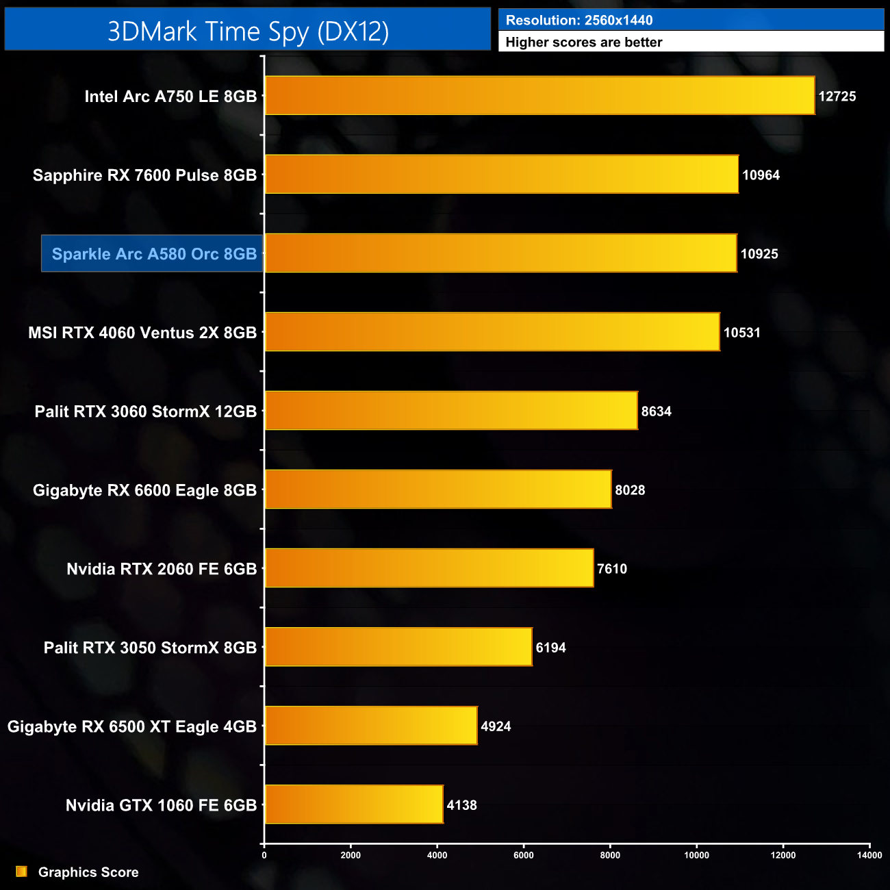 We get our first look at performance indicators in 3DMark, where the A580 scales very well – it's 20% faster than the RX 6600 in Fire Strike, but we'll have to see if that plays out in our game benchmarks.