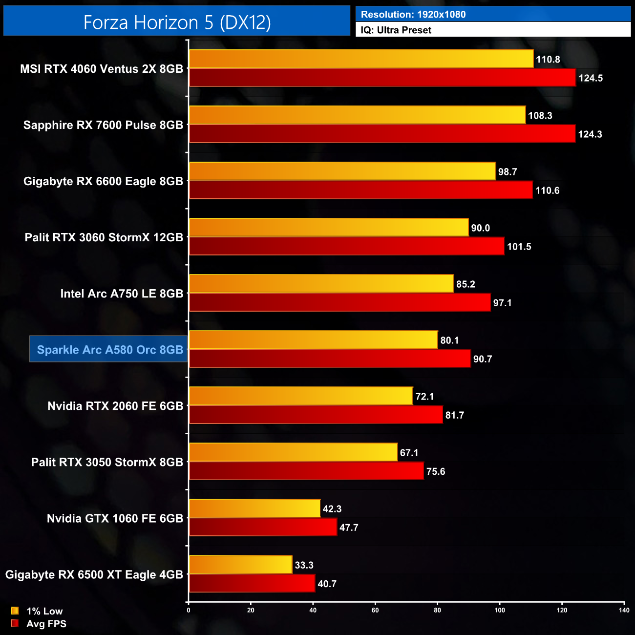 Forza Horizon 5 sees the A580 take a backward step, relatively speaking. It's still very playable, hitting 91FPS at 1080p, but it's 18% slower than the RX 6600. Versus Nvidia though, the A580 is 20% faster than the RTX 3050 and only 11% behind the RTX 3060.