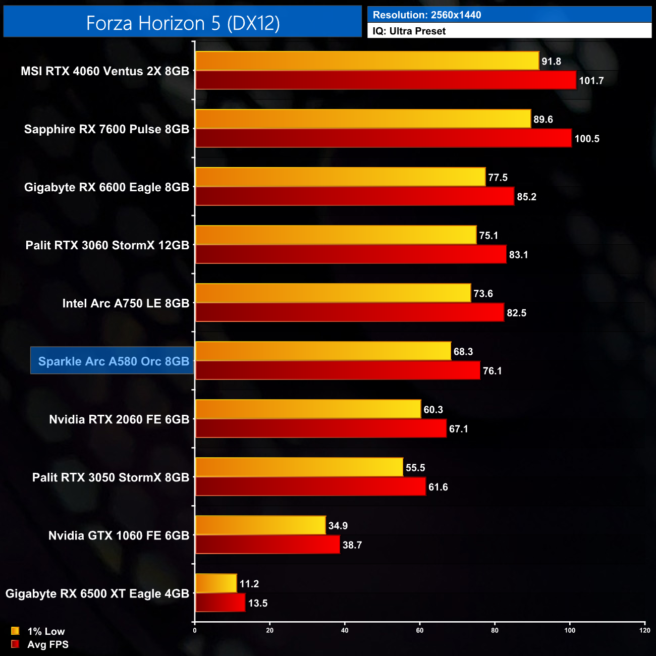 1440p is still a smooth experience too, hitting 76FPS, though that's only just behind the A750 – but do remember the A580 is factory overclocked.