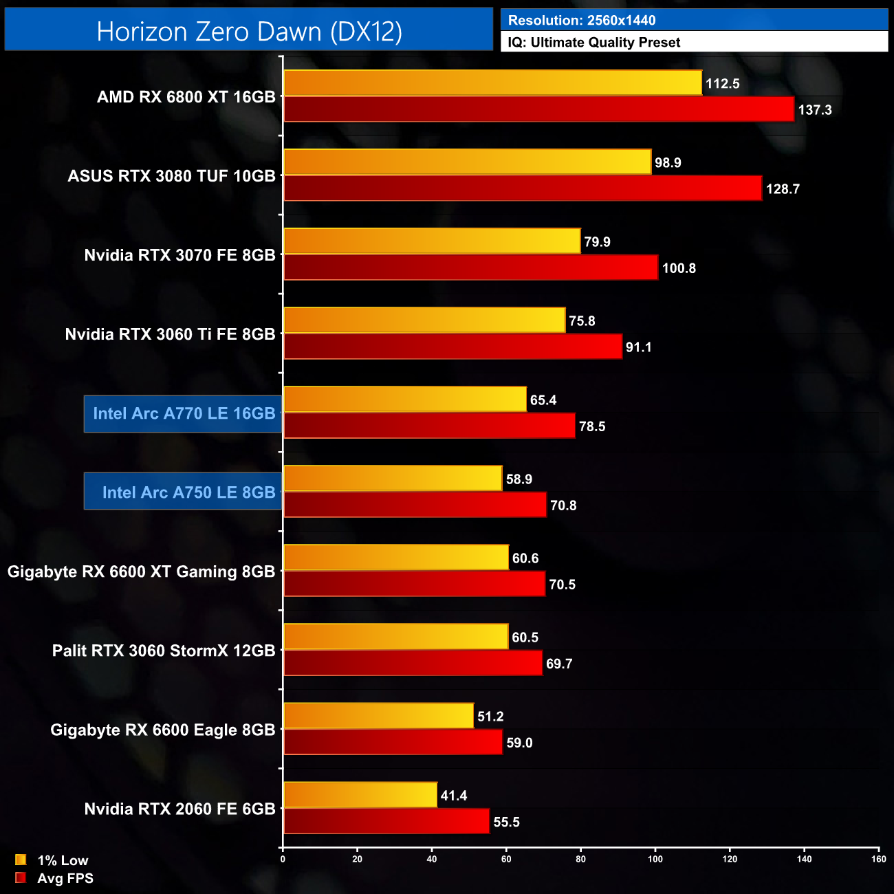 Horizon Zero Dawn is another solid performer for the A770. At 1080p, Intel's fastest GPU delivers 105FPS on average, putting it 13% ahead of the RTX 3060, though it's much closer to the RX 6600 – but still faster. At 1440p it extends its lead over the AMD GPU too, this time with an 11% margin between the two.