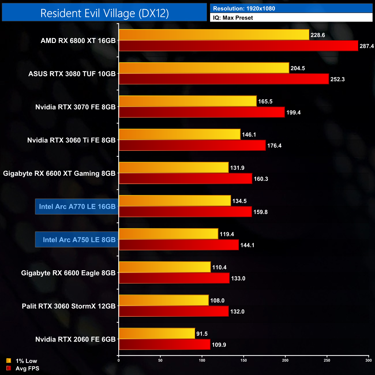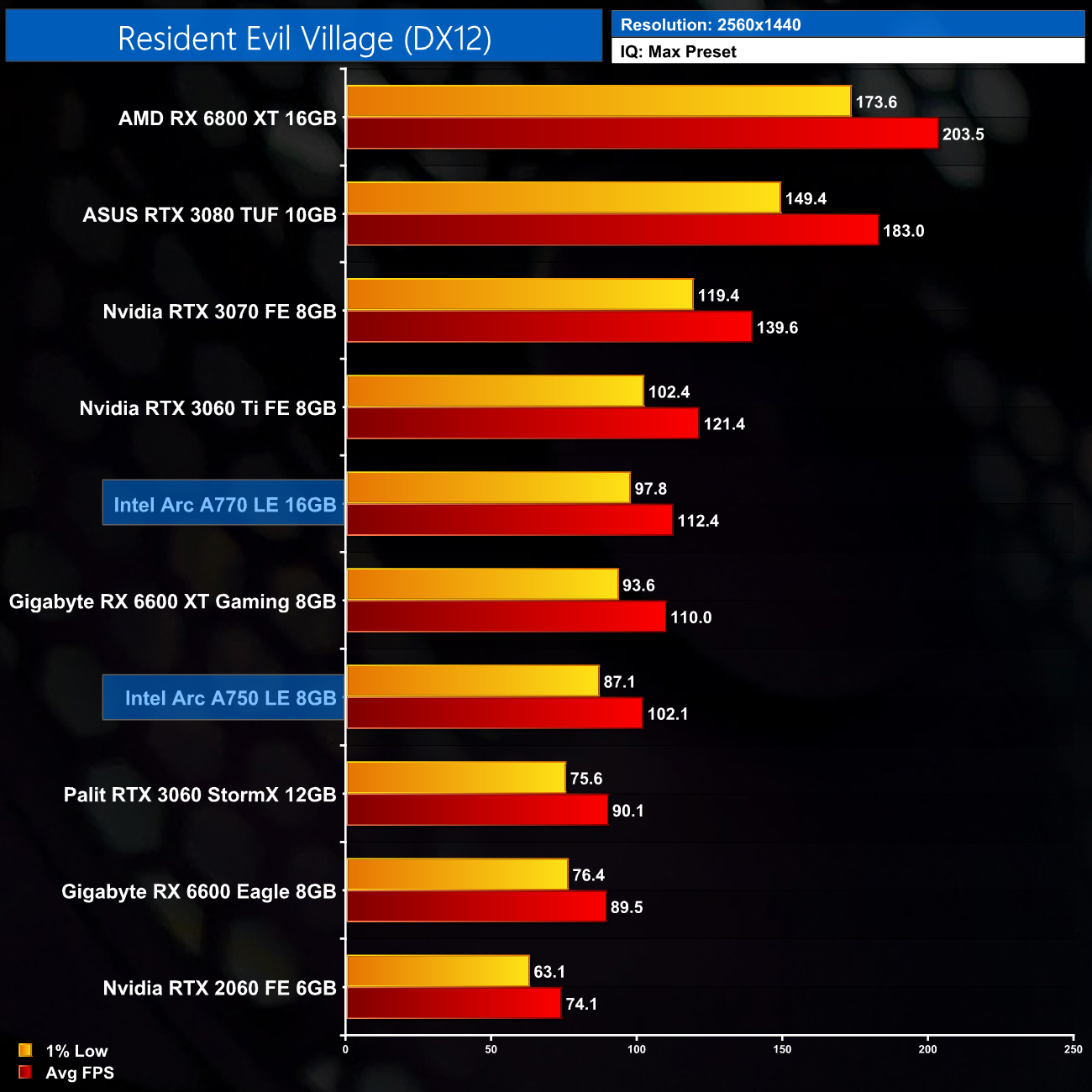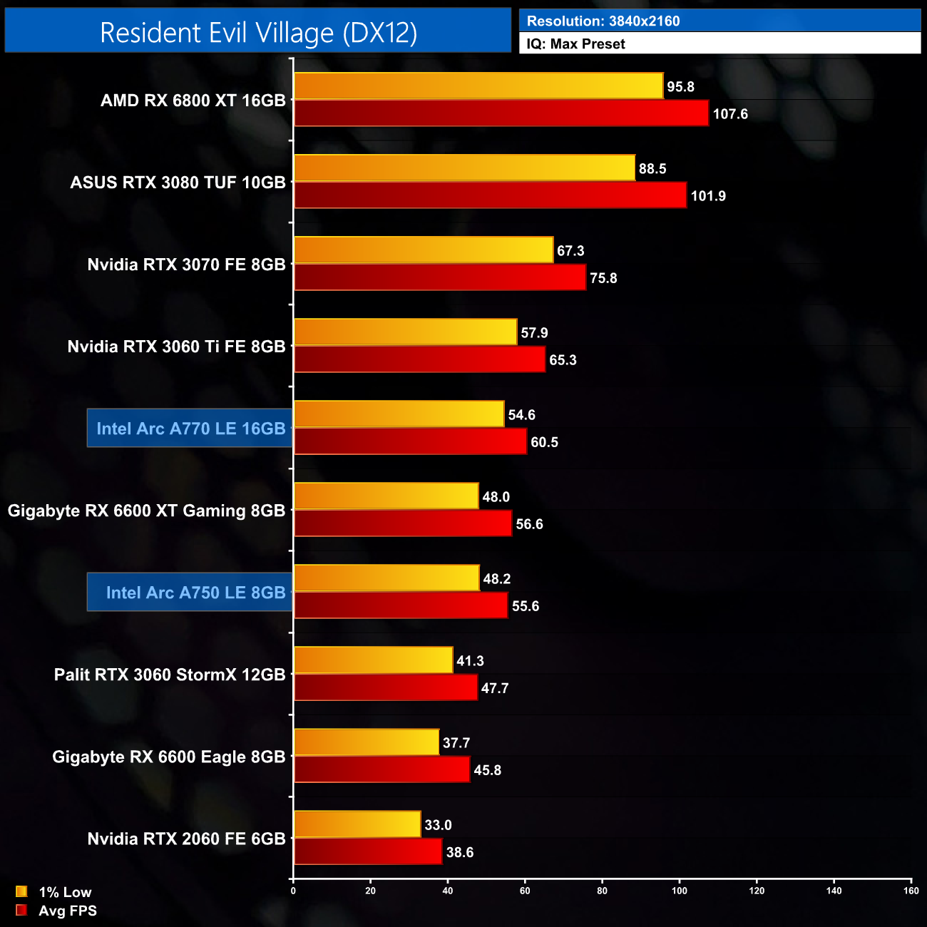 Resident Evil Village also delivers the goods for the Arc A770. Hitting just shy of 160FPS at 1080p, it's a very solid 21% faster than the RTX 3060, but dead level with the RX 6600 XT – though that's still impressive considering this is an AMD-sponsored title. It also improves, relatively speaking, at 1440p, coming in 25% ahead of the 3060, though it's only a couple of frames ahead of the 6600 XT.