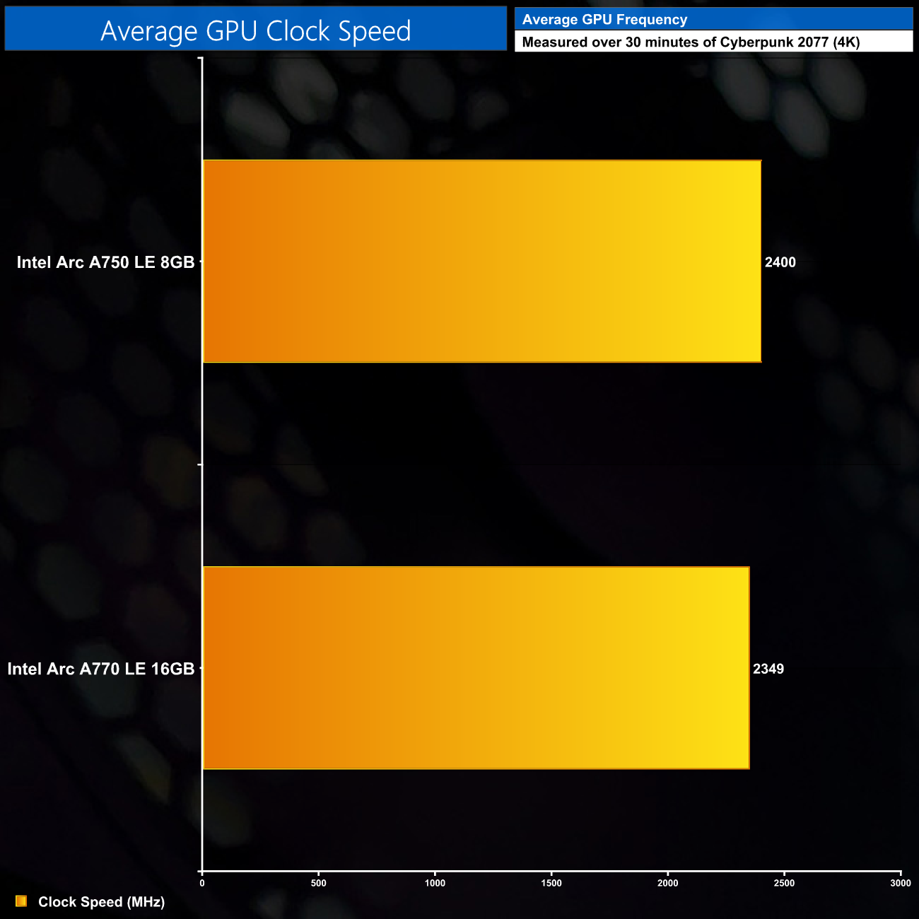 With only two Arc cards to test, operating clock speeds don't mean much just yet, but over our 30-minute 4K workload, the A770 hits 2349MHz, putting it about 50MHz slower than the A750, which hit exactly 2400MHz. These figures are a fair bit higher than Intel's rated graphics clock speeds, but the exact frequency will vary depending on the workload in question.