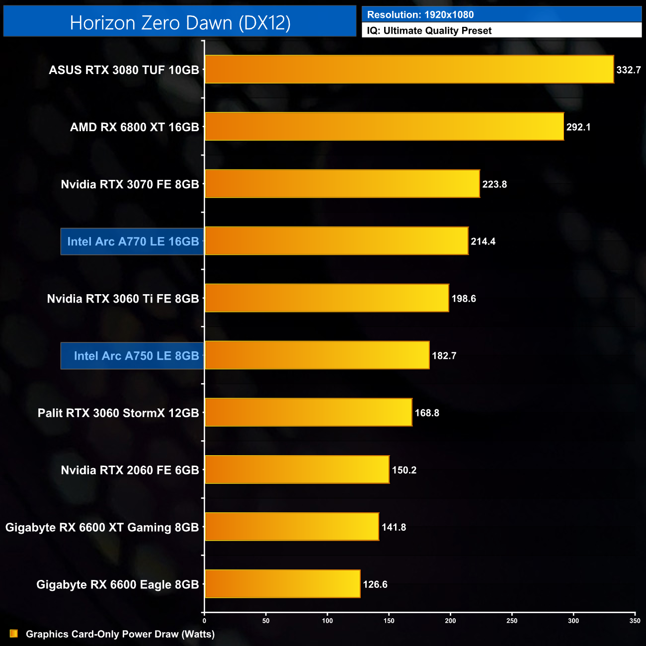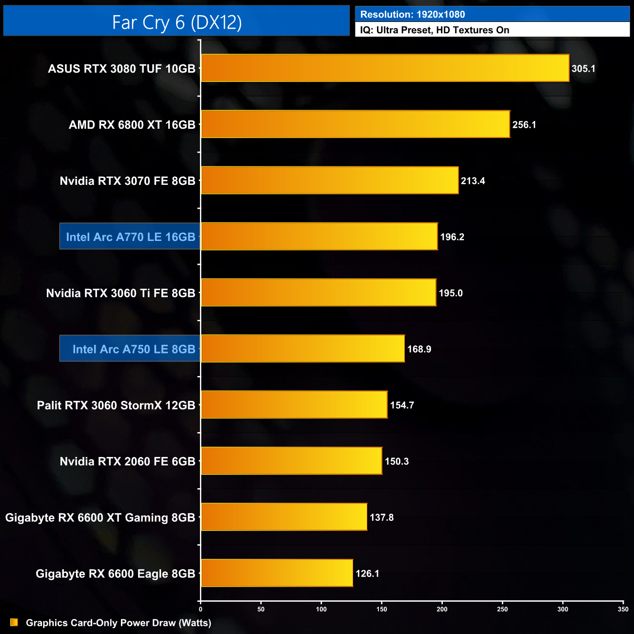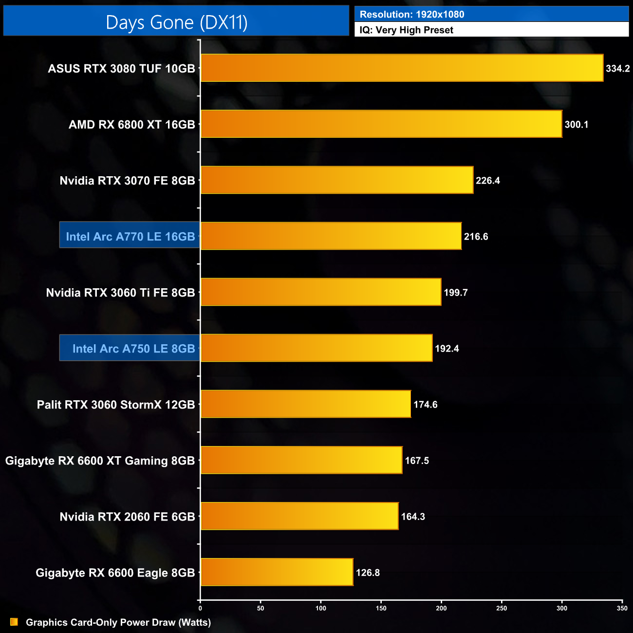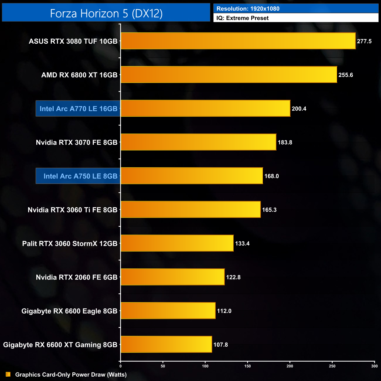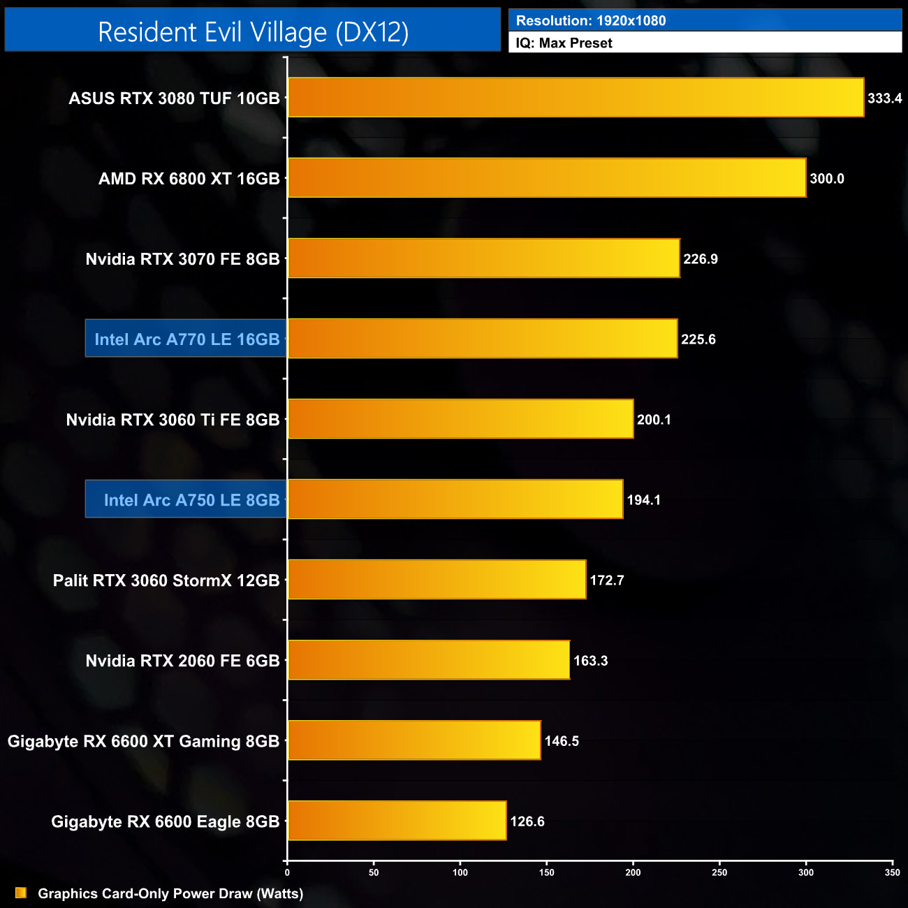 Power draw for the A770 isn't far off the rated 225W figure. It does vary from game to game, as you can see above, but we see an average power draw of 208.2W at 1080p.