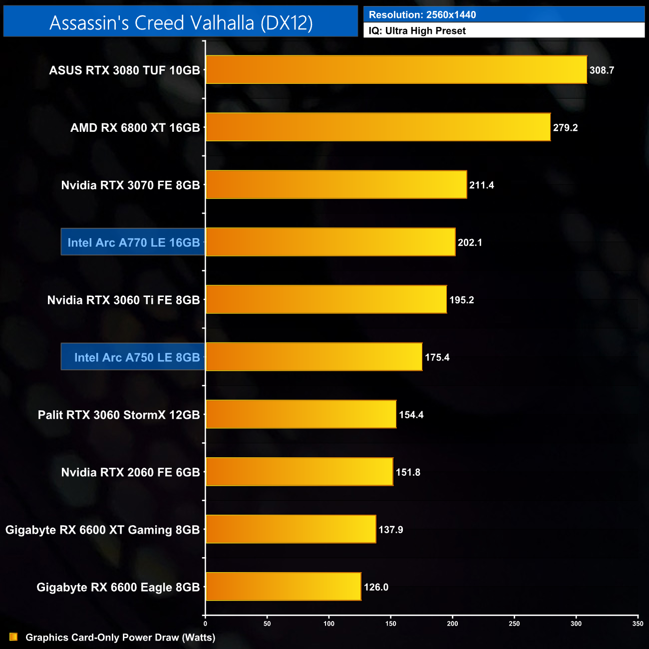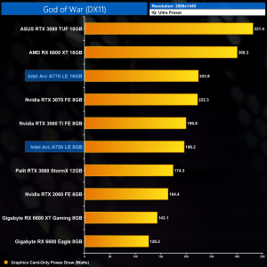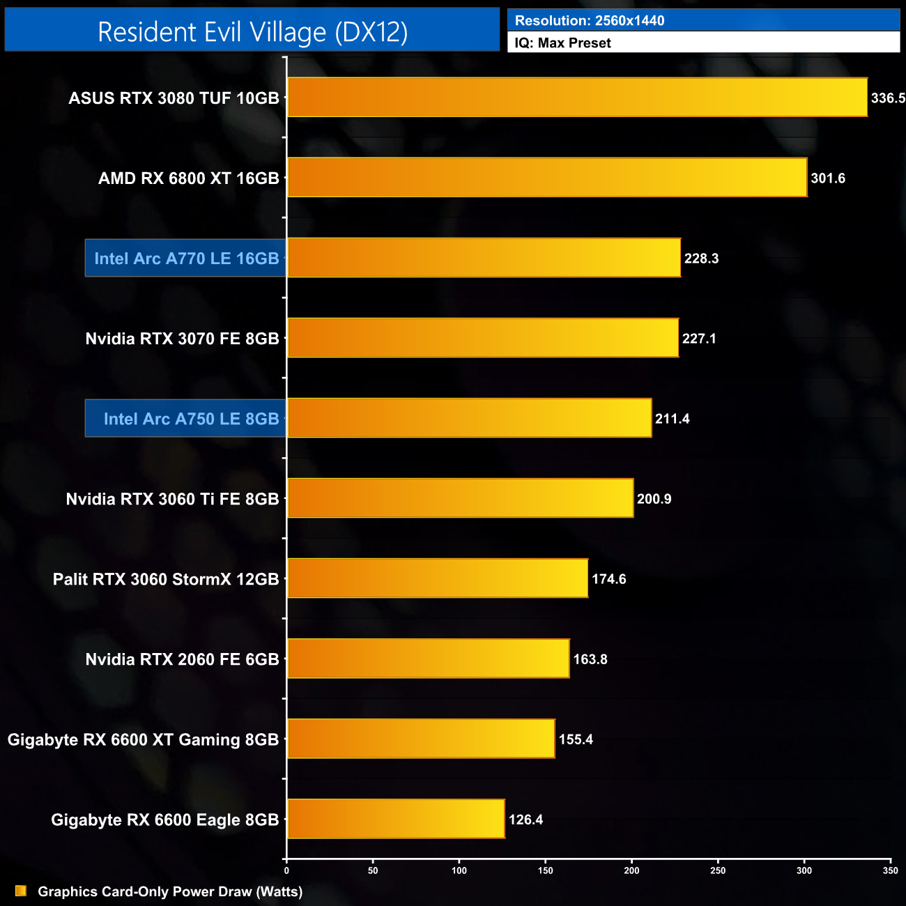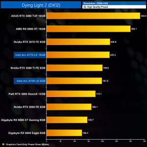 Power draw does increase across the board at 1440p, now averaging 220.4W across the 10 titles we tested. Certain games – like Assassin's Creed Valhalla – come in under that figure, while others including Resident Evil Village, draw slightly more.