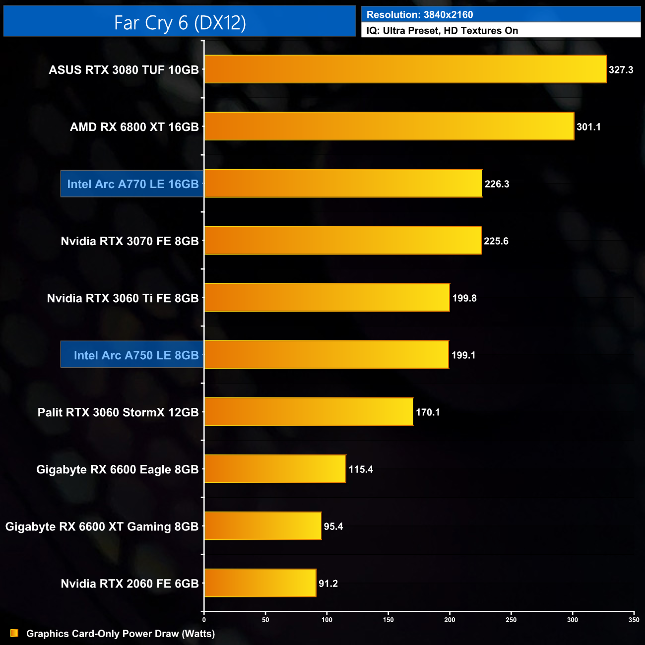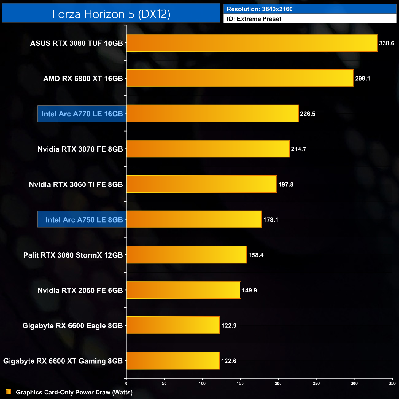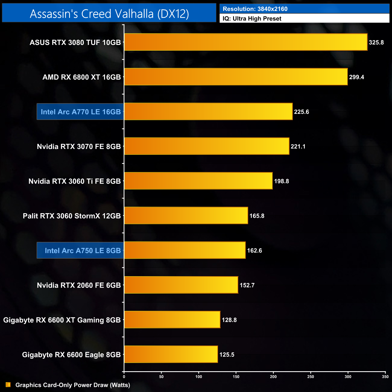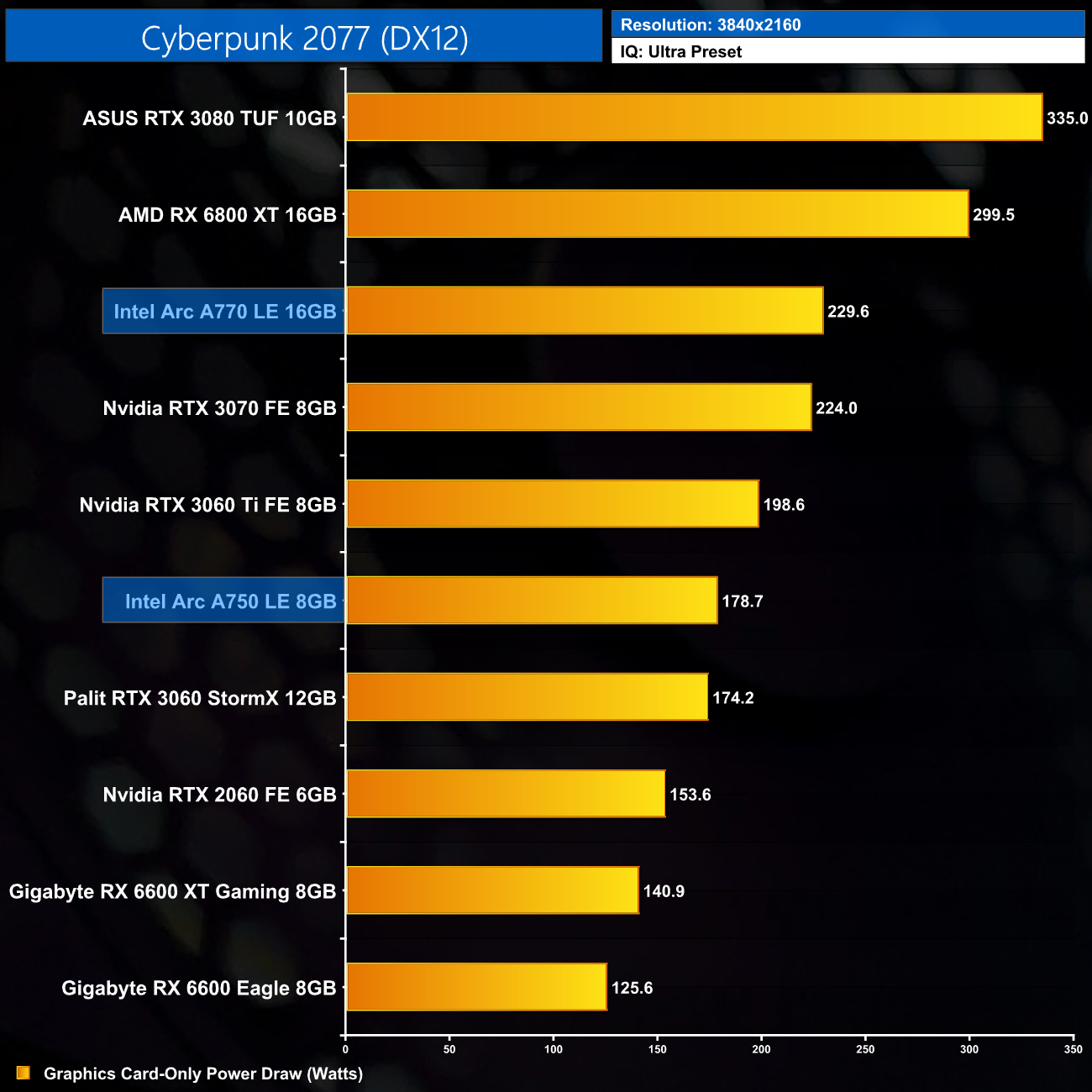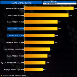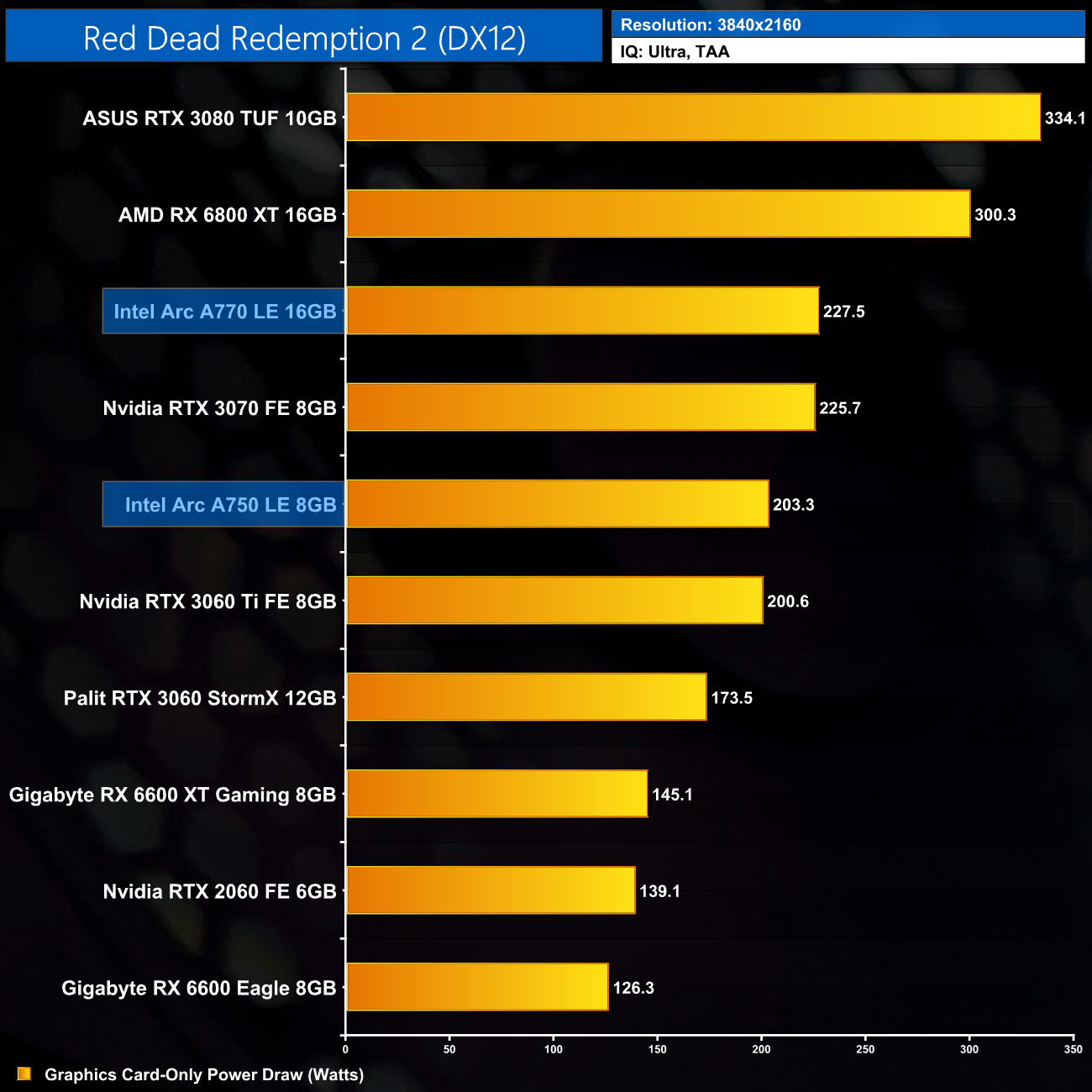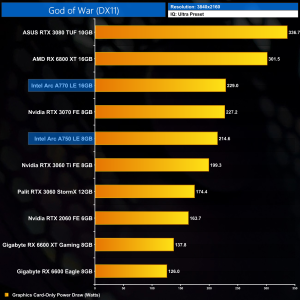 Lastly, 4K power draw is fairly consistent across the board, with the A770 drawing an average of 227.6W over the ten games we tested.