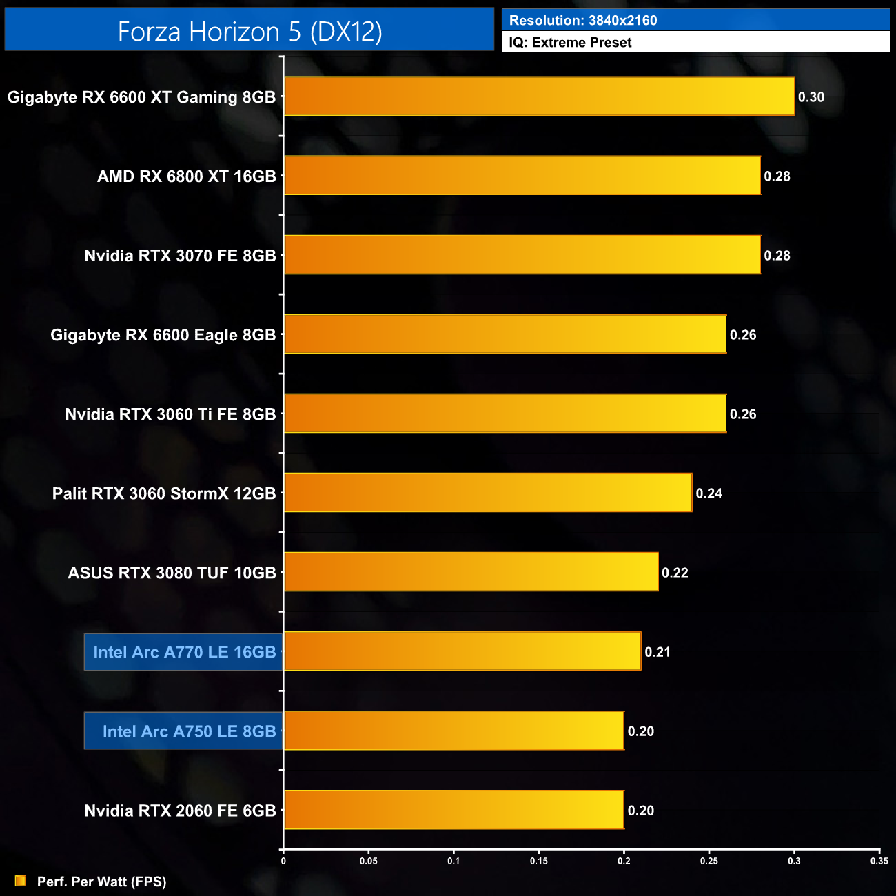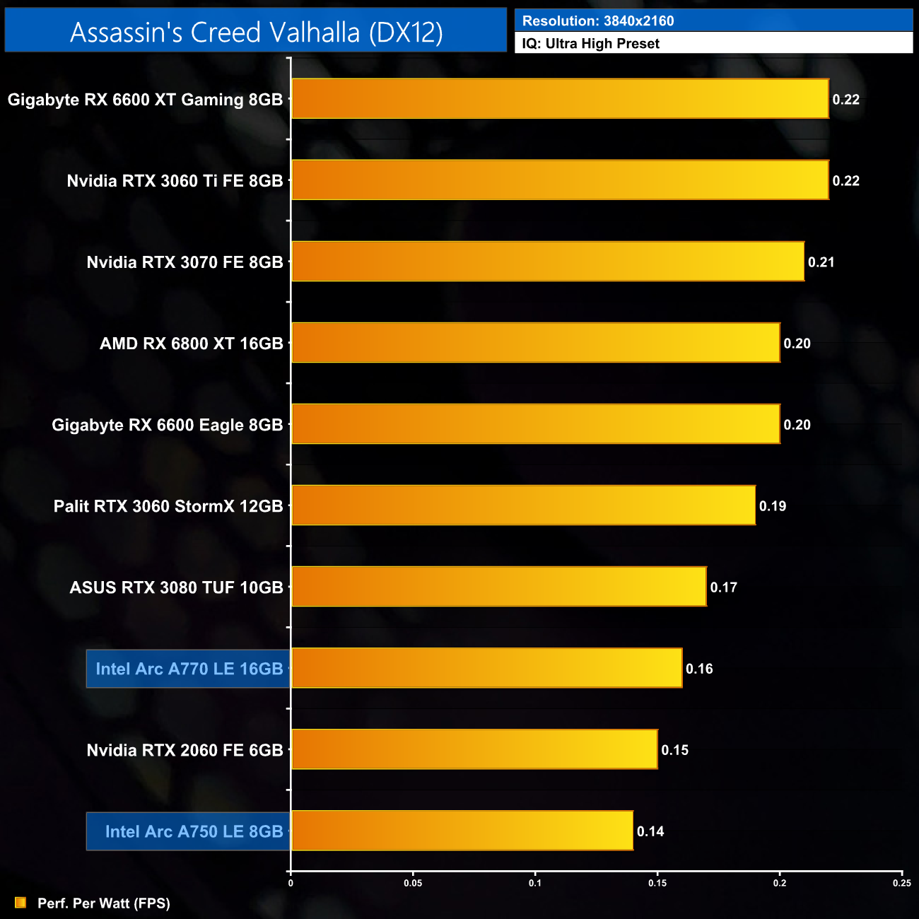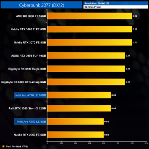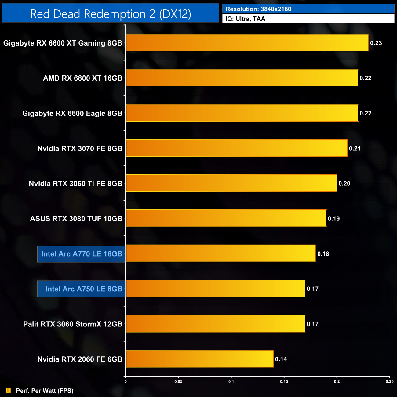 The picture doesn't change much at 4K, with the A770 still one of the least efficient cards we've tested today. It's probably low on the list of priorities for Arc at this moment, but RDNA 2 is head and shoulders above in terms of overall performance per Watt.