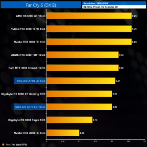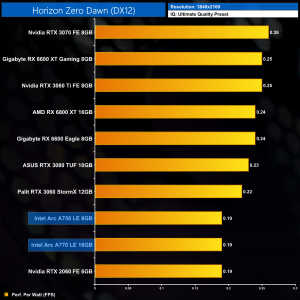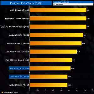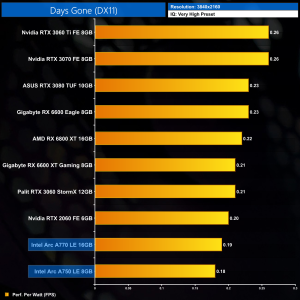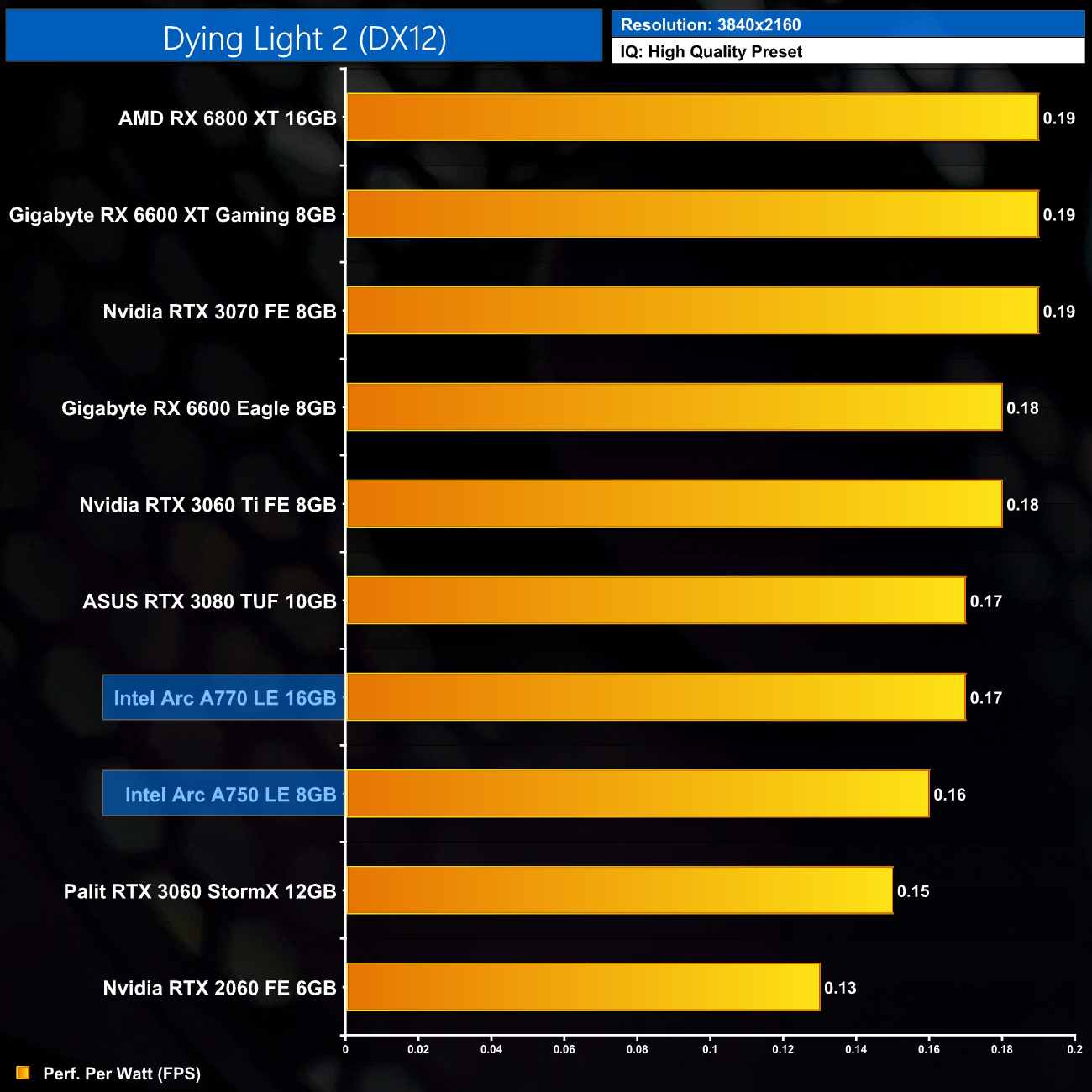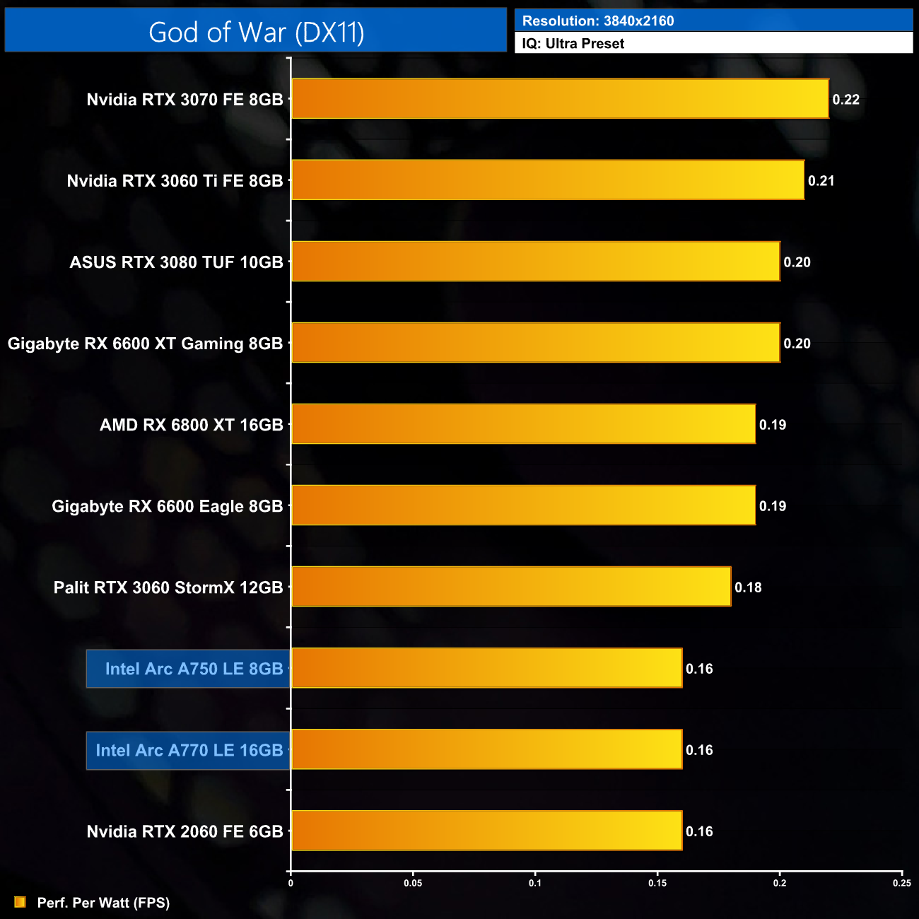 The picture doesn't change much at 4K, with the A770 still one of the least efficient cards we've tested today. It's probably low on the list of priorities for Arc at this moment, but RDNA 2 is head and shoulders above in terms of overall performance per Watt.