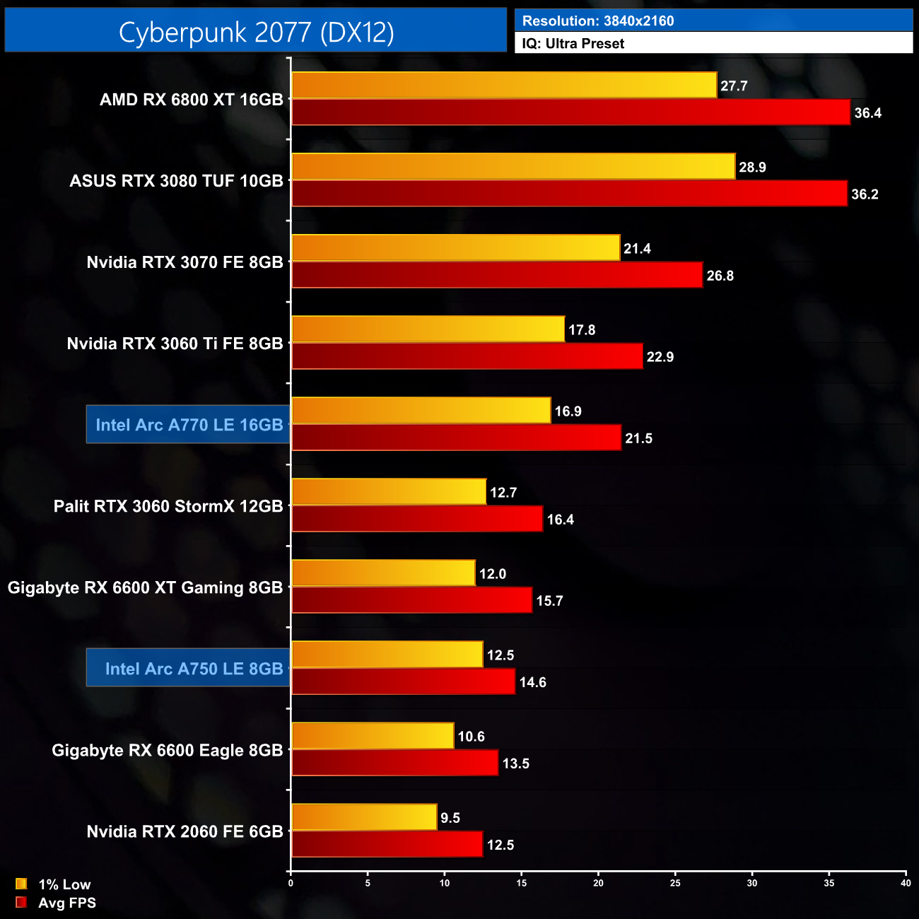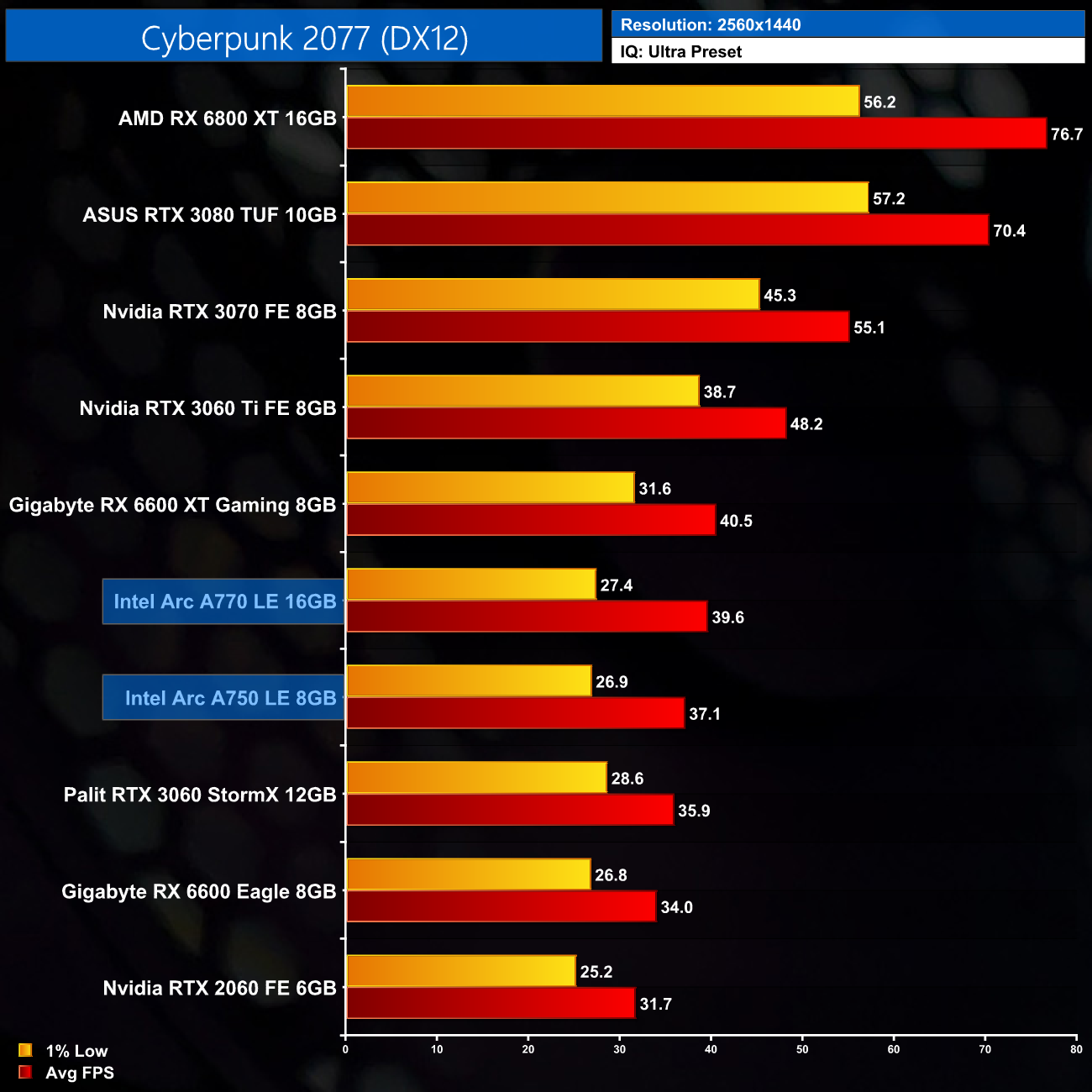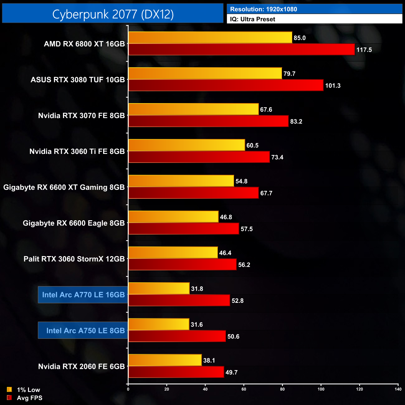 Cyberpunk 2077 brings us to the first of several driver-related issues we will discuss today, with more shown in the video. Frame time consistency is simply very poor at 1080p, resulting in 1% low performance that is significantly worse than even the RTX 2060. Weirdly, this does improve – relatively speaking – at 1440p, but this game with Ultra settings is still too heavy for this calibre of GPU at the higher resolution.