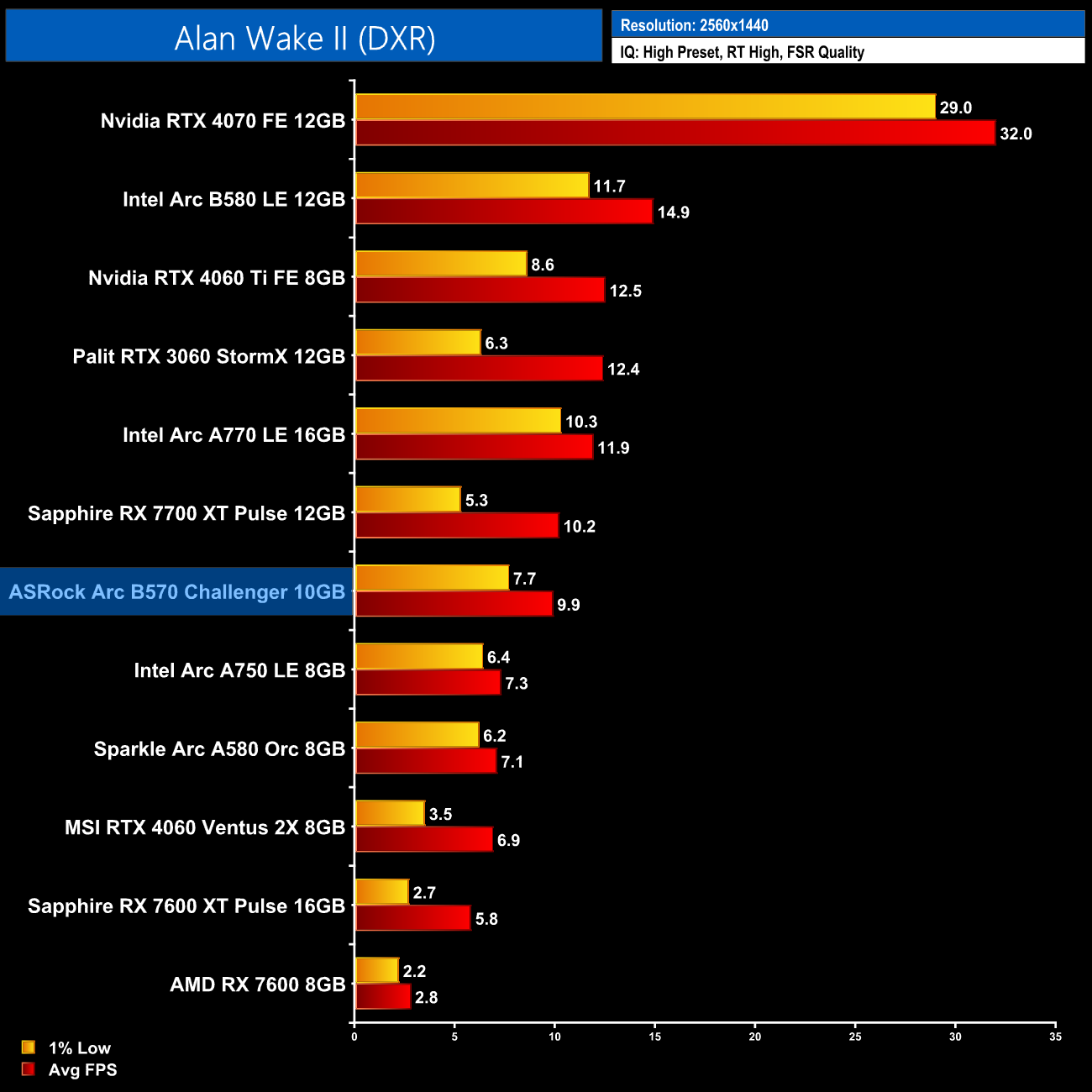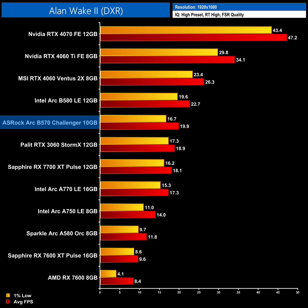 As for ray tracing, we start with Alan Wake 2, and even with quality upscaling you're not going to be enabling the High preset here – it's just too much for this class of GPU to handle, with the B570 barely hitting 20fps on average.