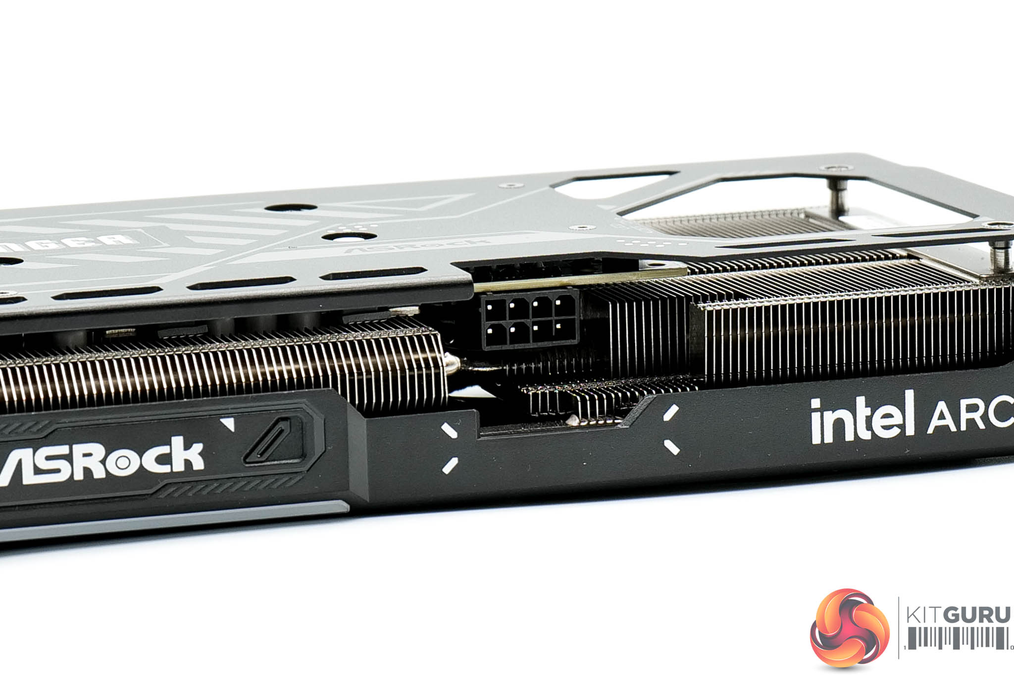 The front side of the card is home to the ASRock and Intel Arc logos, plus there's a small blue/green LED strip which you can see in our video review.