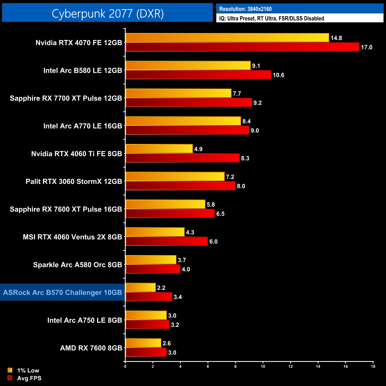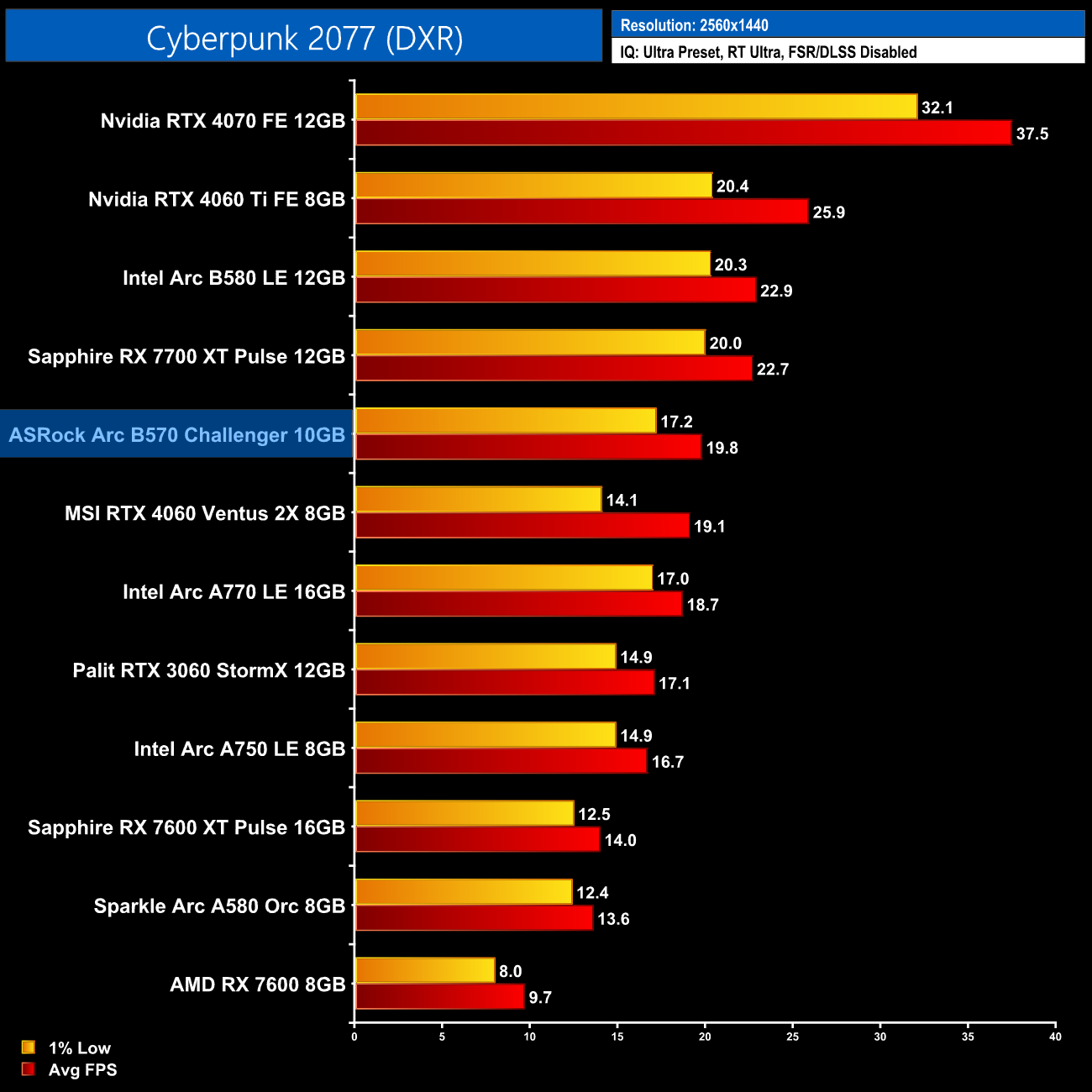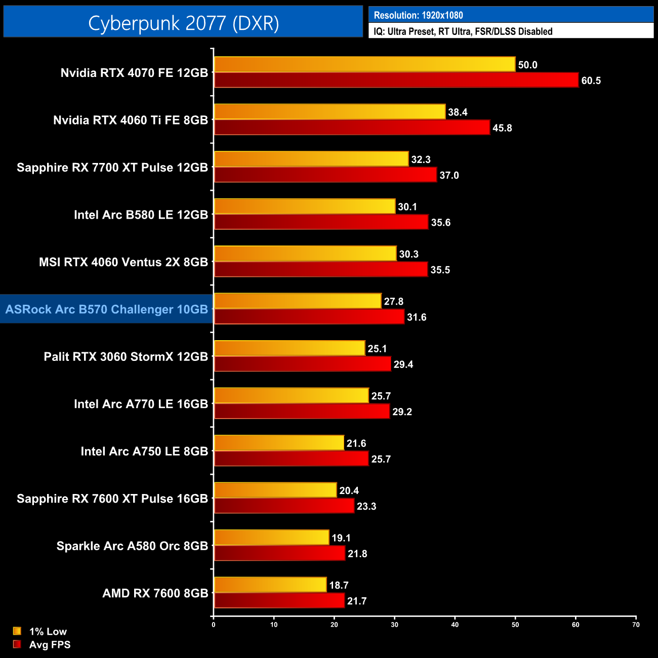 Cyberpunk 2077 is much more performant on the B570, though do note I'm not using Path Tracing here. But at 1080p using the RT Ultra preset, but with no form of upscaling, we're looking at around 32fps on average, so the B570 actually crushes even the RX 7600 XT.