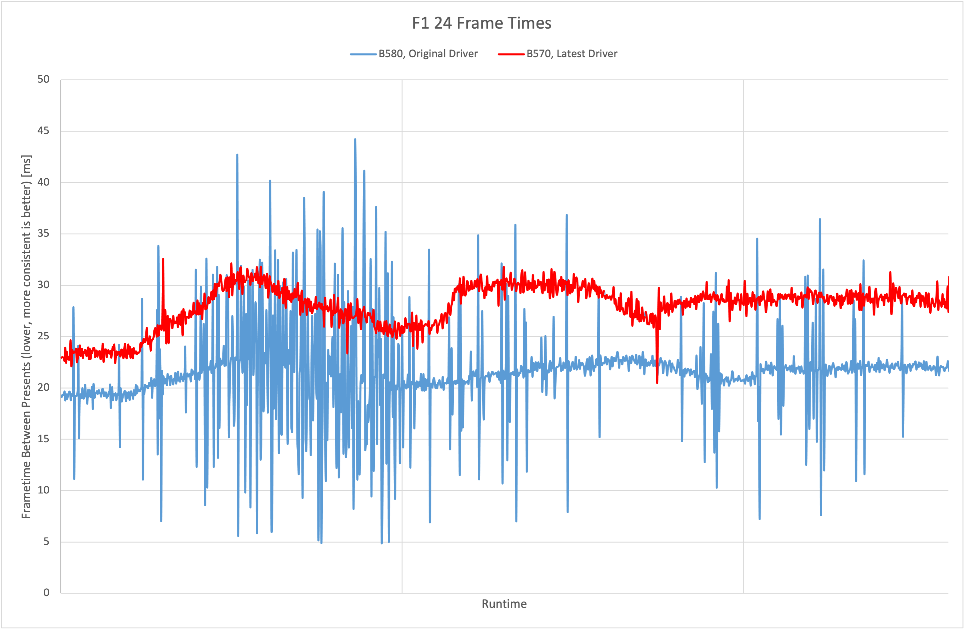 It is, however, good to see that the frametimes have been fixed since the B580 launched. Above you can see a frametime plot comparing the B580, using the launch driver from December, with the B570 using its own launch driver. Aside from a couple of frametime spikes, it's a very consistent experience so credit to Intel for that.