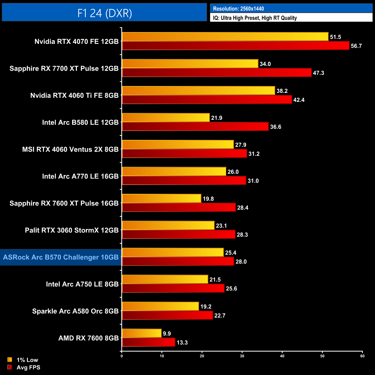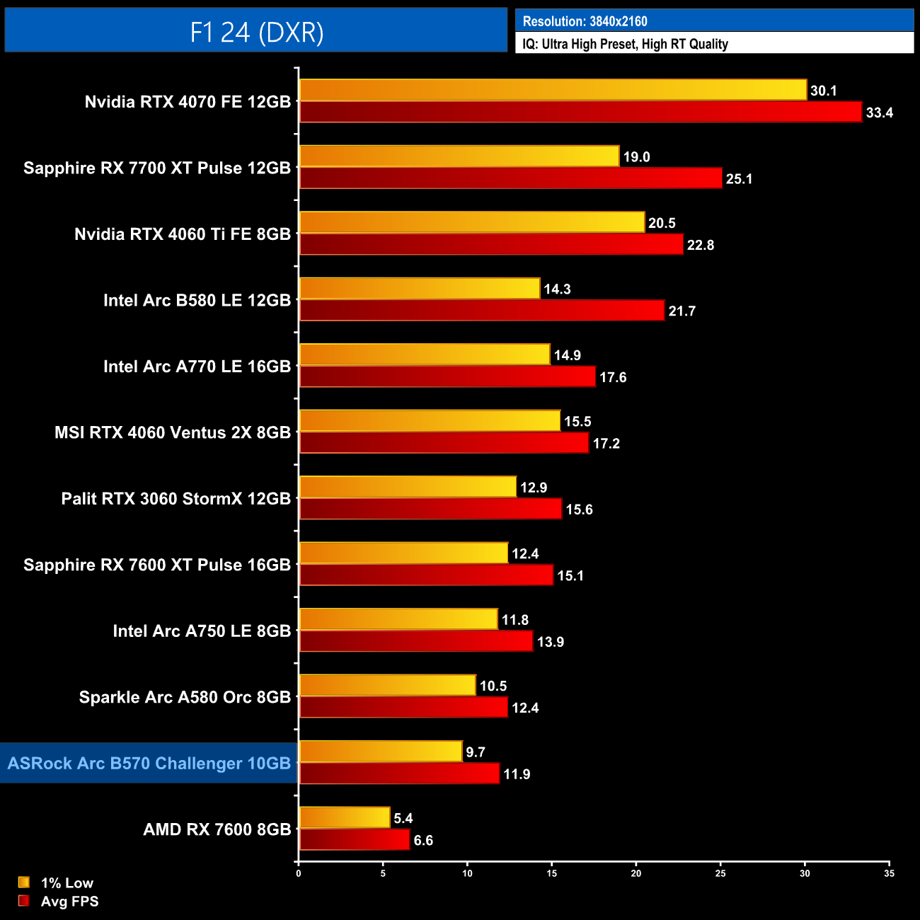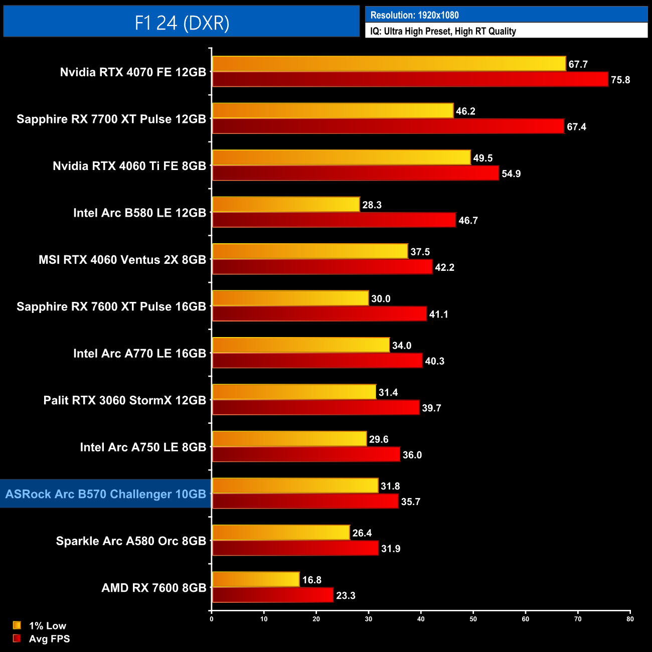 Next up is F1, and we do get playable frame rates at 1080p, though we're not exactly flying at 36fps on average. Still, that's better than what the RX 7600 is able to manage but Intel can't match the RTX 3060 here.