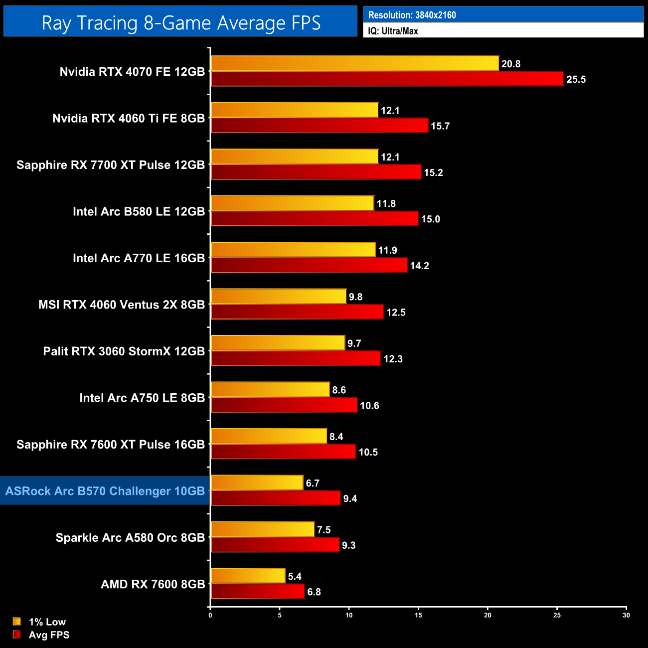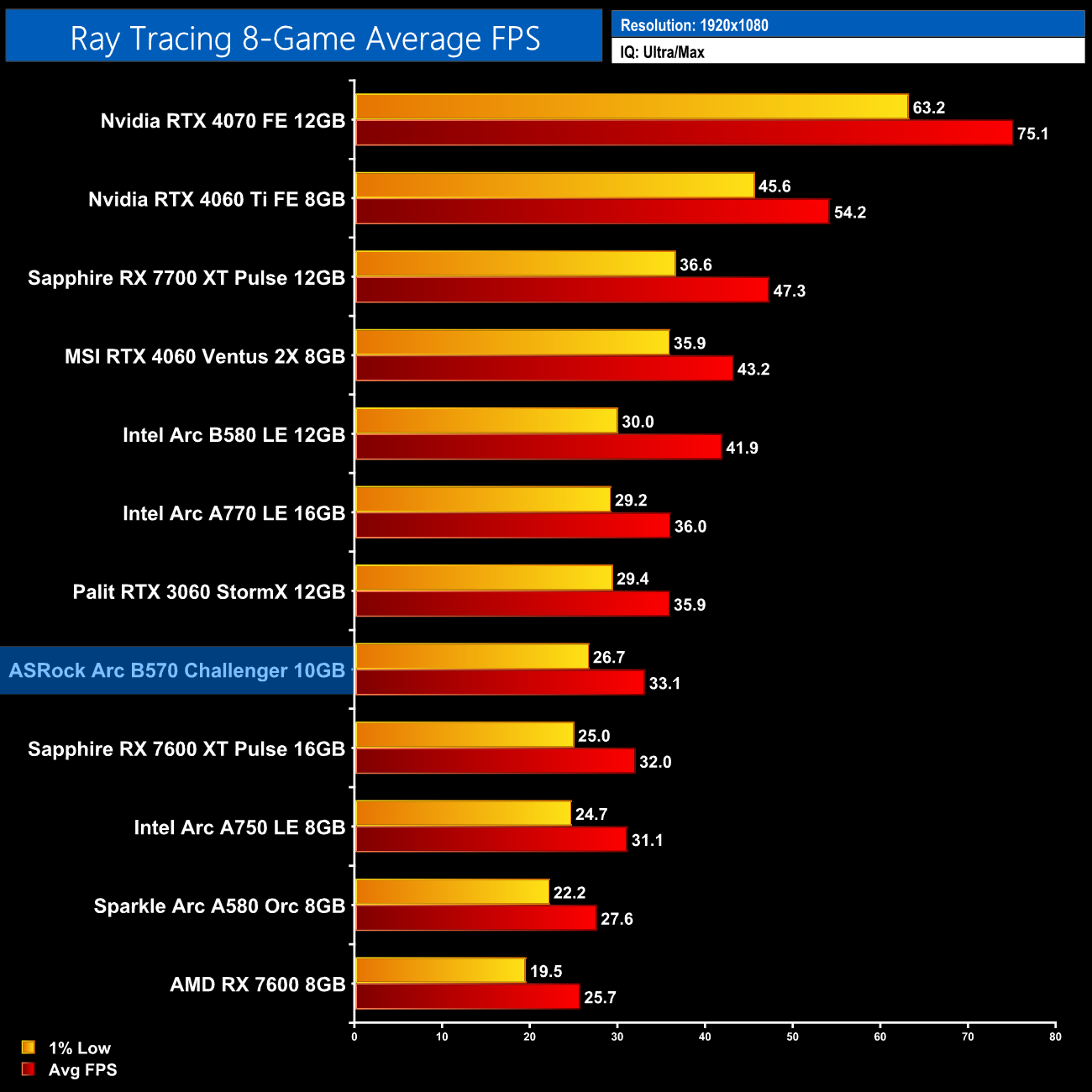 A quick look at ray tracing cost per frame shows the B570 is certainly competitive, but it can't match the B580 here which really is quite the performer when it comes to ray traced games.