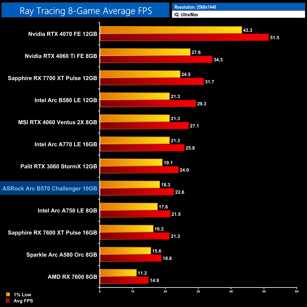 Overall ray tracing performance is not as impressive as we saw from the B580. Granted, the abysmal performance in Ratchet and Clank does pull the average down, but we're looking at the B570 coming in 21% slower on average than its bigger sibling. That still means it's on par with the RX 7600 XT – a GPU that's a good chunk more expensive – and it's not far off the RTX 3060 12GB.