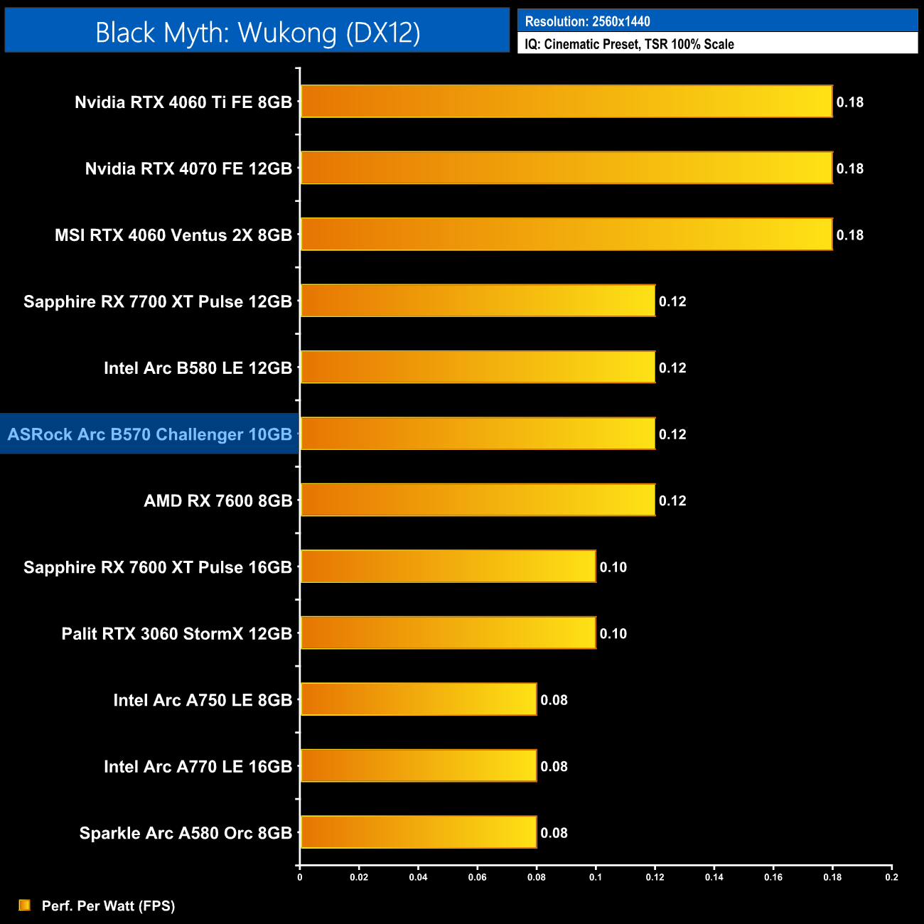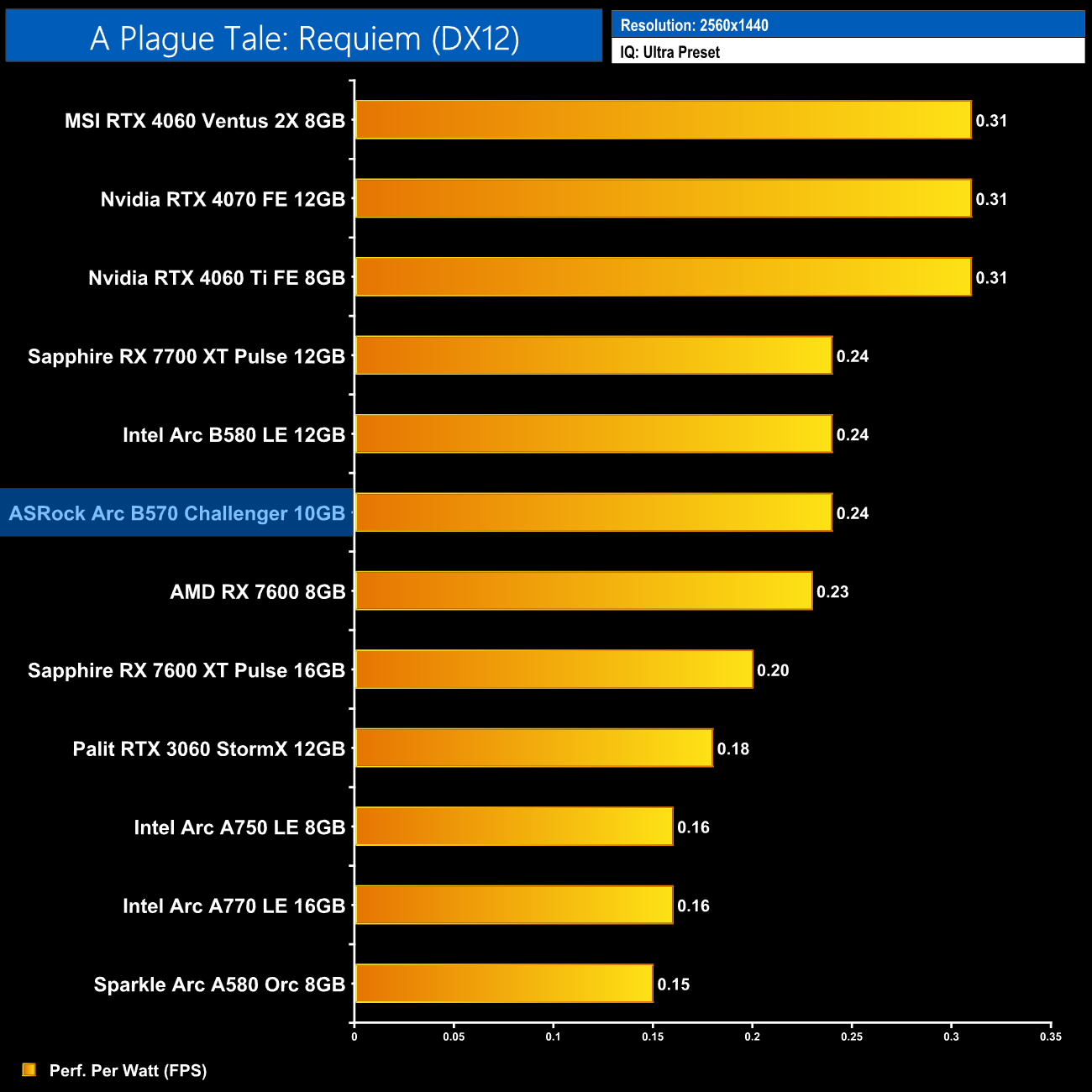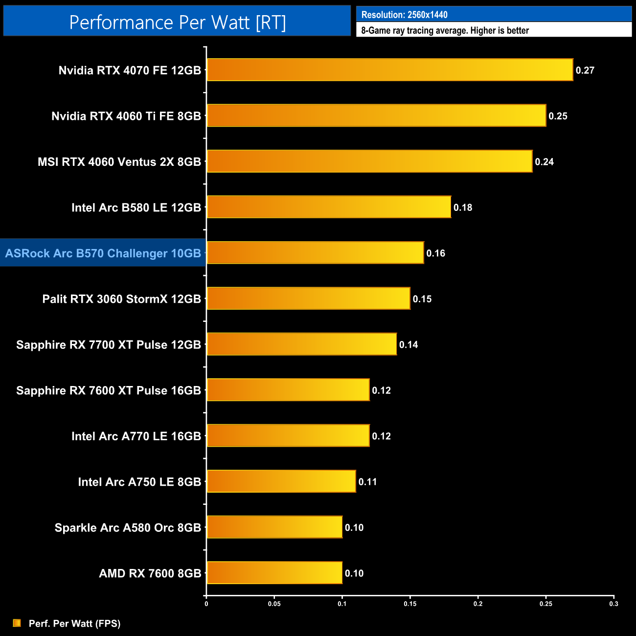 Things stay much the same at 1440p, with the B570 level with the B580 and RX 7700 XT in terms of average efficiency, but the B570 is 18% less performant per Watt compared to the RTX 4060.