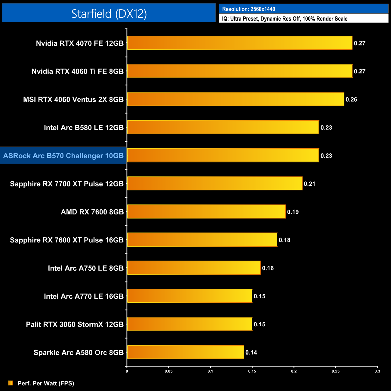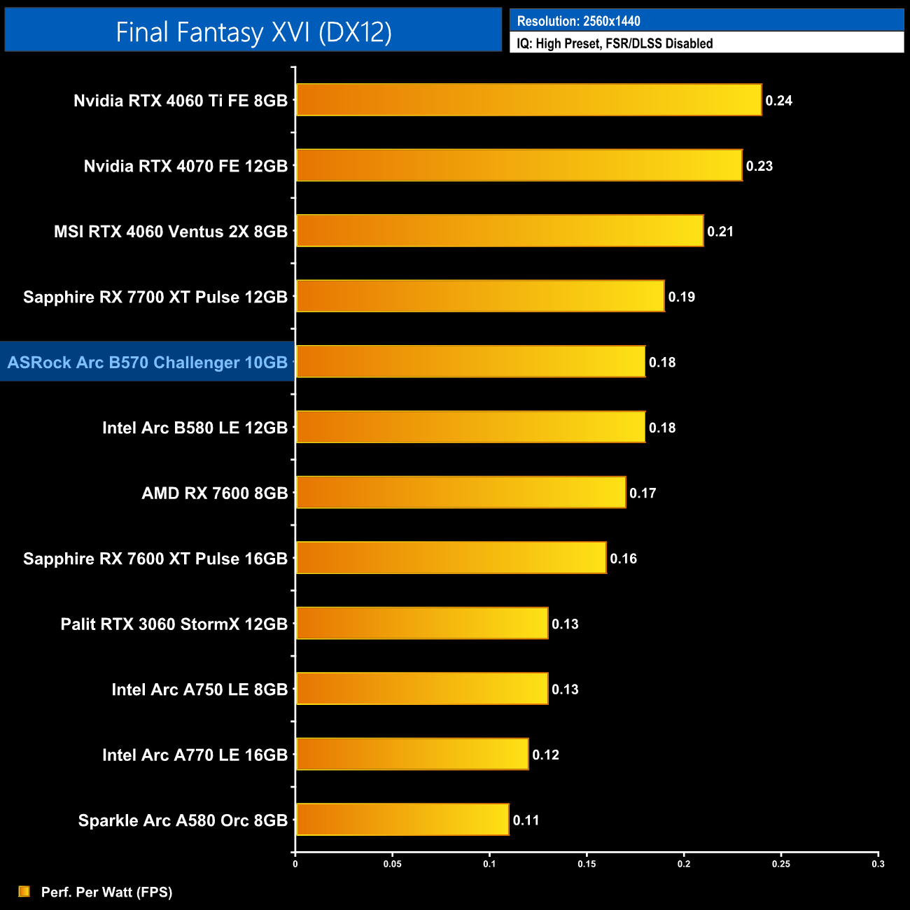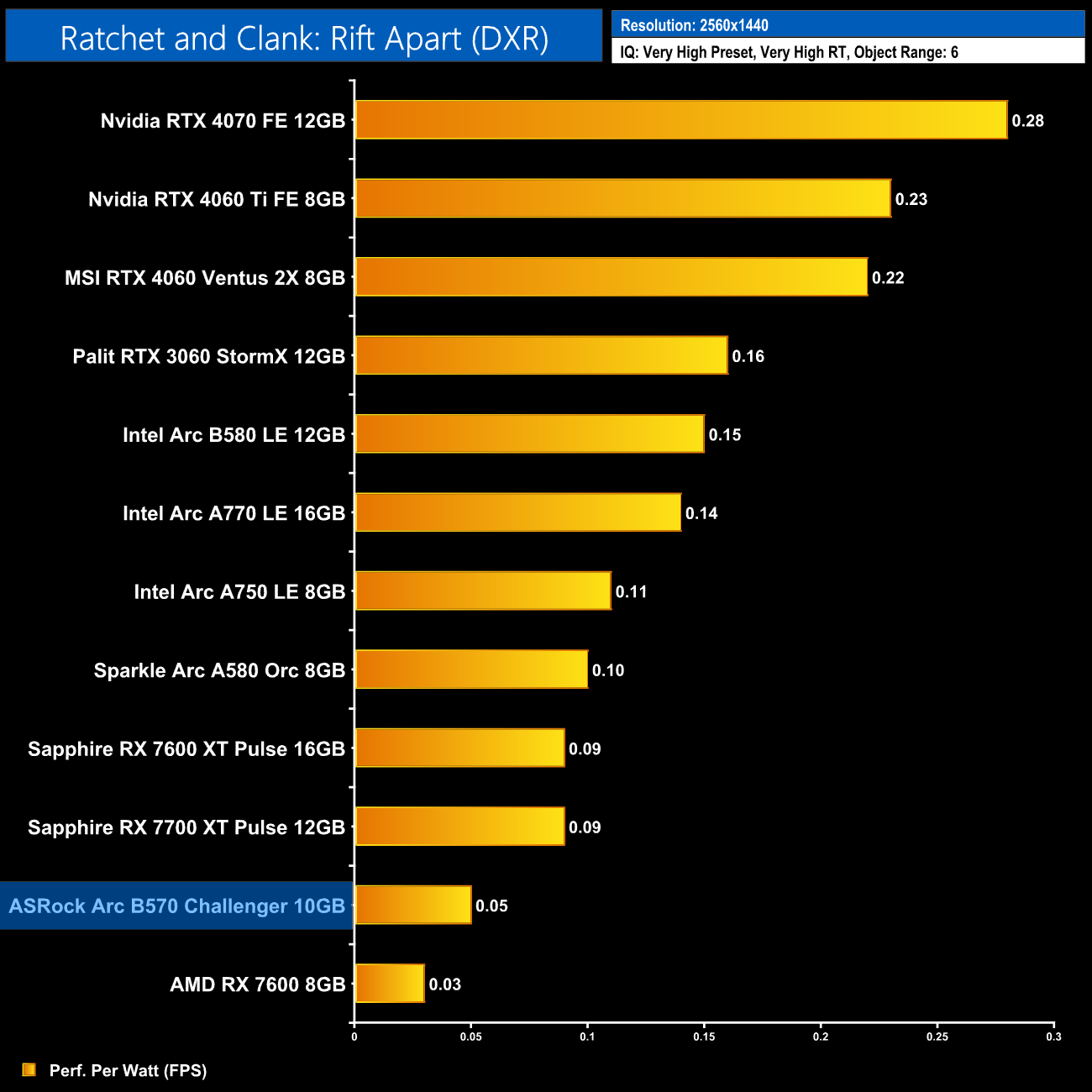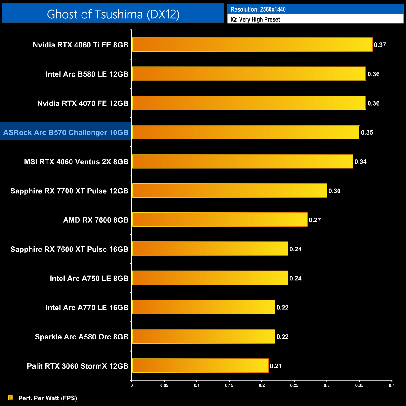 Things stay much the same at 1440p, with the B570 level with the B580 and RX 7700 XT in terms of average efficiency, but the B570 is 18% less performant per Watt compared to the RTX 4060.