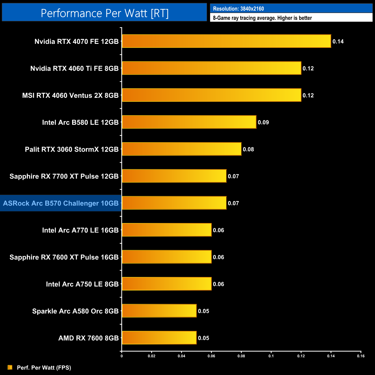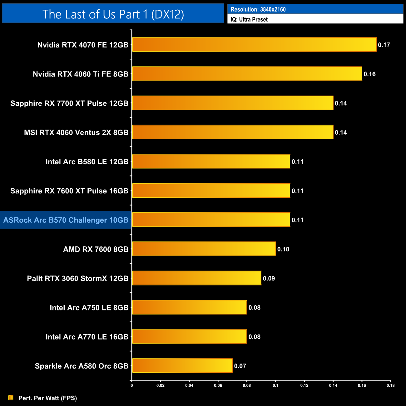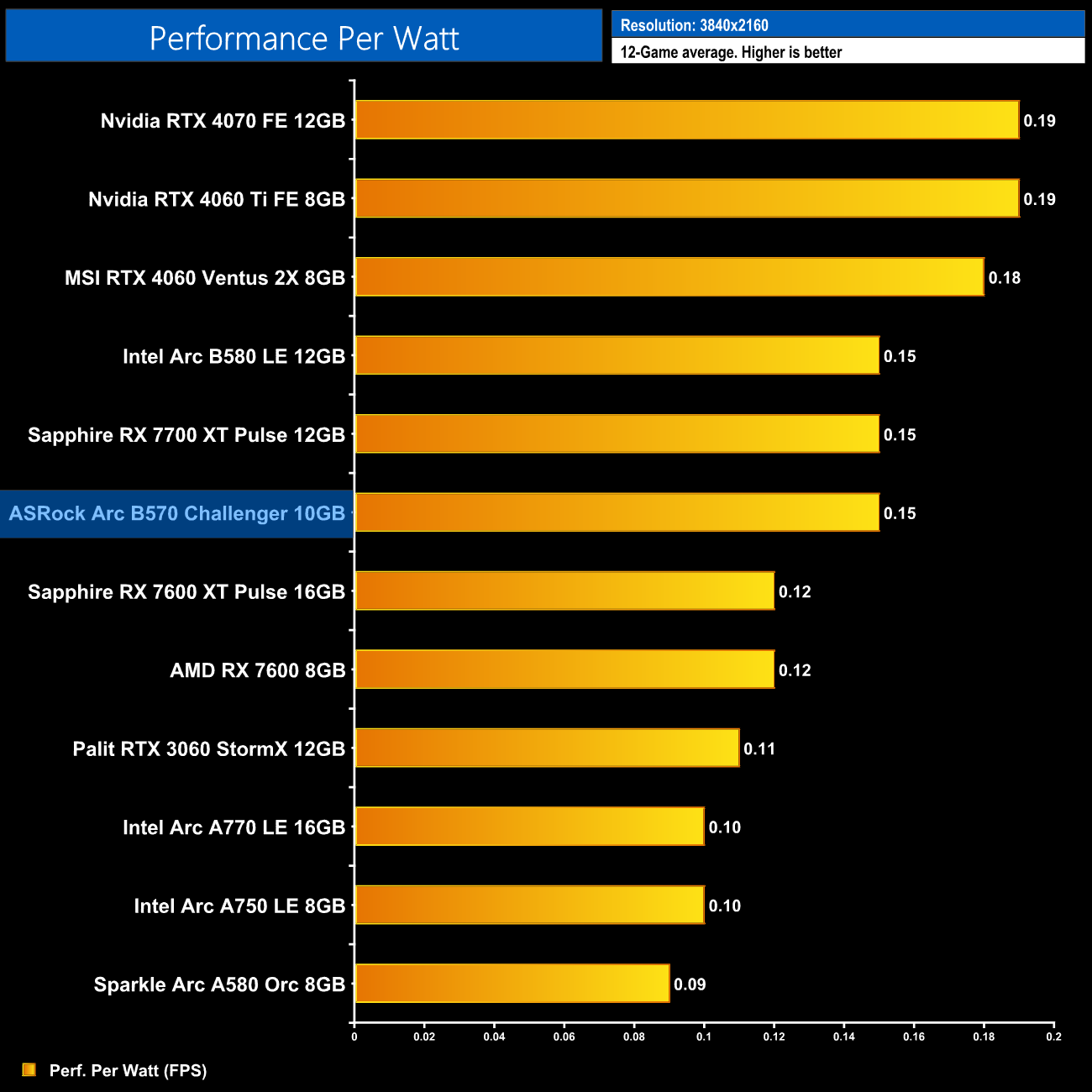 Using the graphics card-only power draw figures presented earlier in the review, here we present performance per Watt on a per-game basis for all twelve games we tested at 2160p (4K).