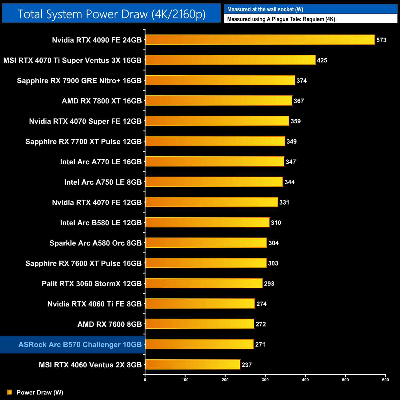 We measure system-wide power draw from the wall while running A Plague Tale: Requiem for 30 minutes (4K resolution).