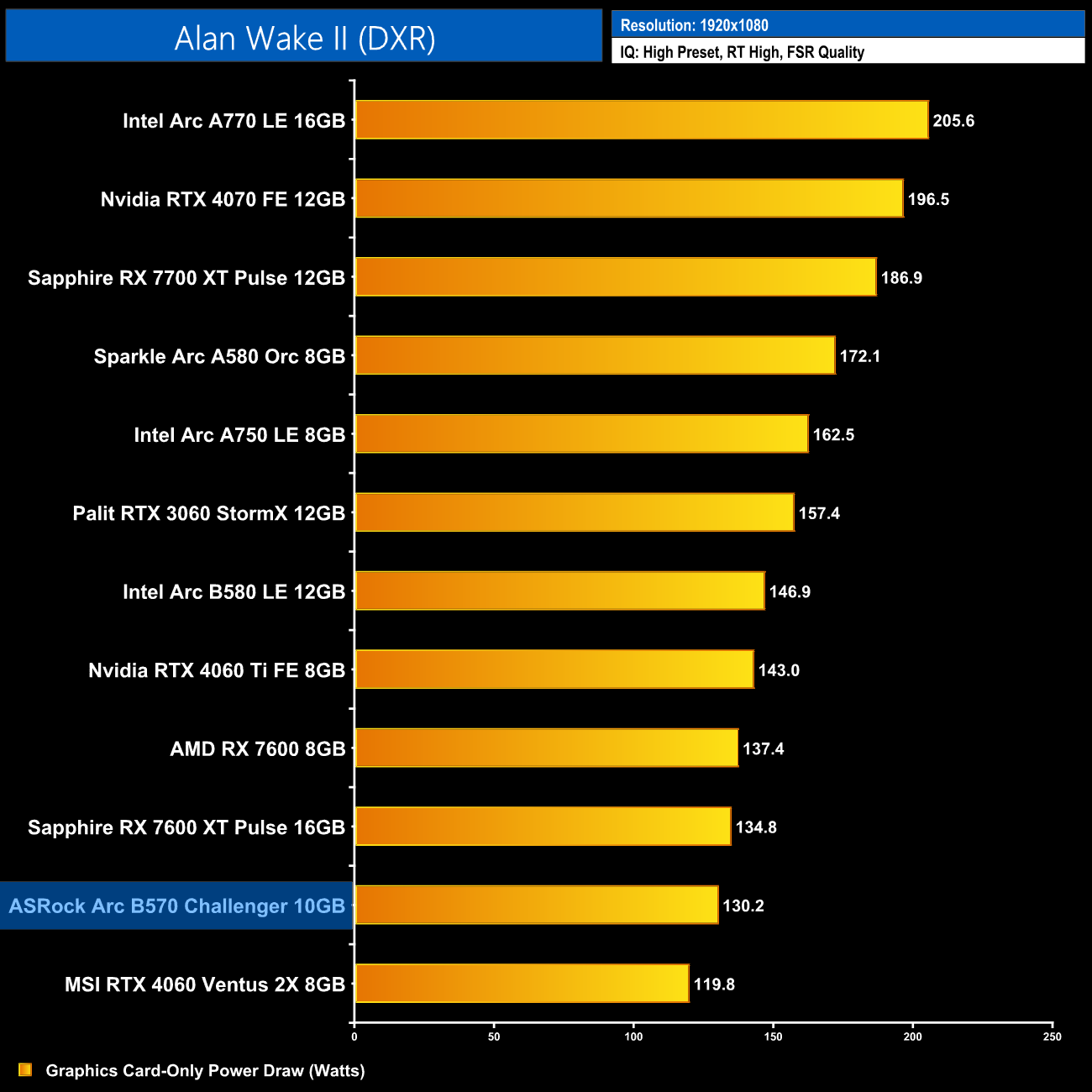 As for ray tracing, we start with Alan Wake 2, and even with quality upscaling you're not going to be enabling the High preset here – it's just too much for this class of GPU to handle, with the B570 barely hitting 20fps on average.