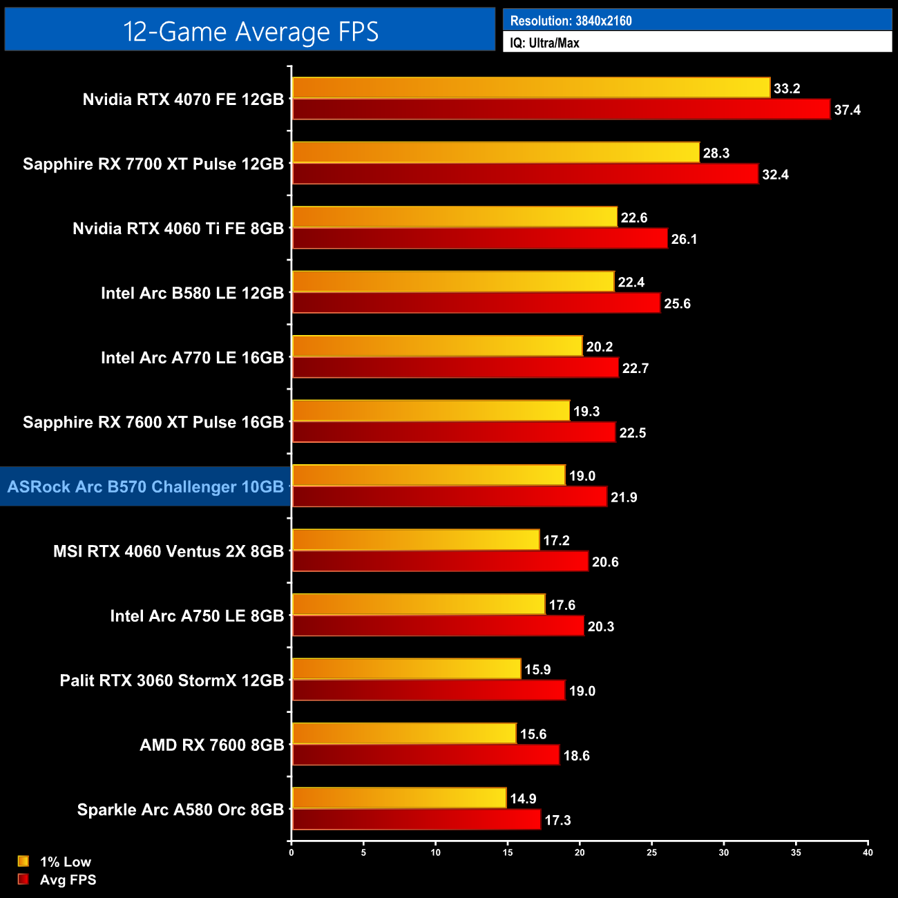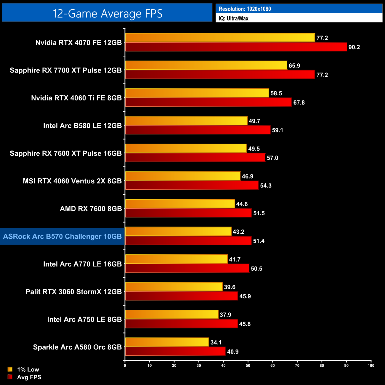 Over the twelve games we tested, the Arc B570 managed an average frame rate of 51fps at 1080p. That makes it 13% slower than the B580, 5% behind the RTX 4060, but dead level with the RX 7600. It's also a hair faster than the A770, and it's 12% faster than the RTX 3060 12GB.