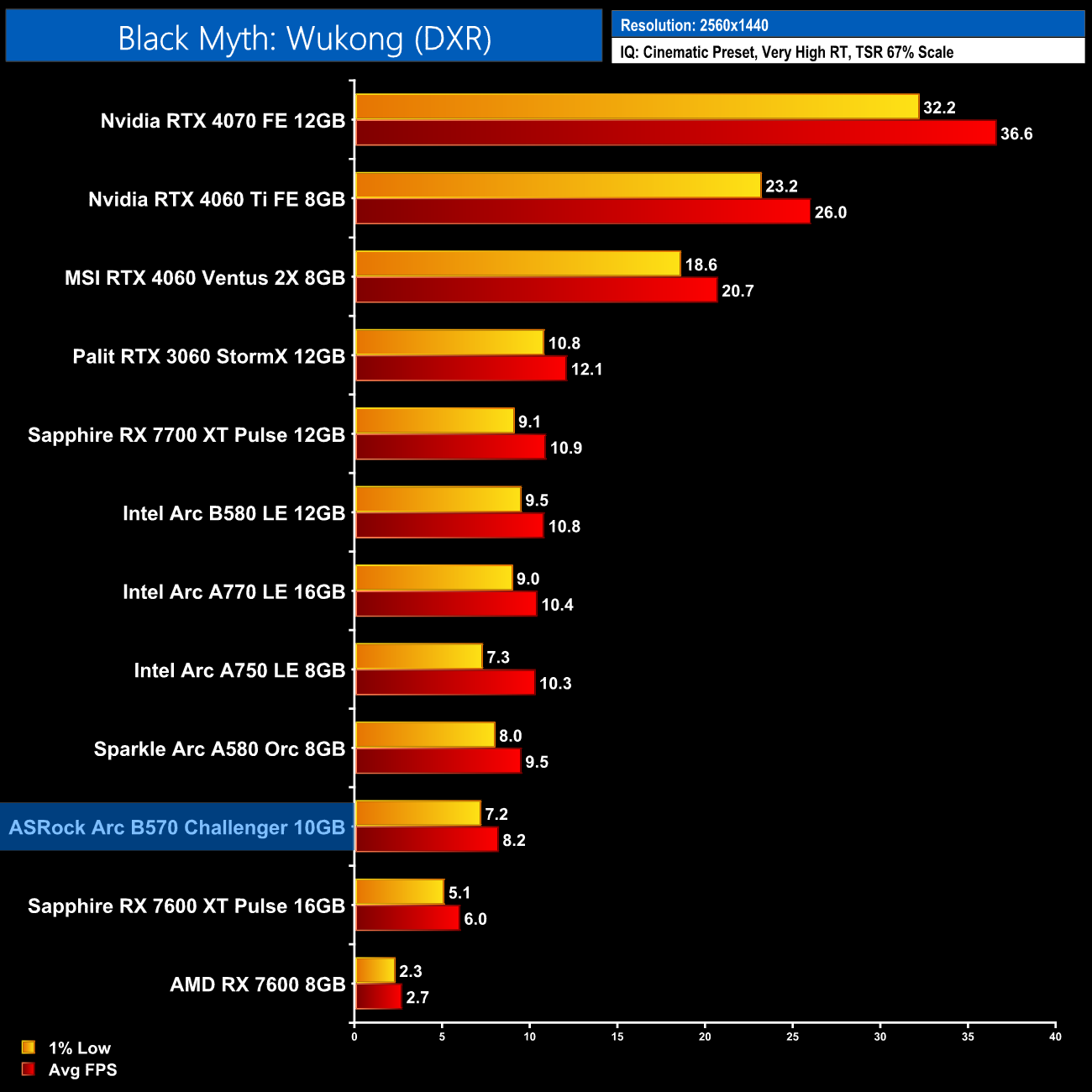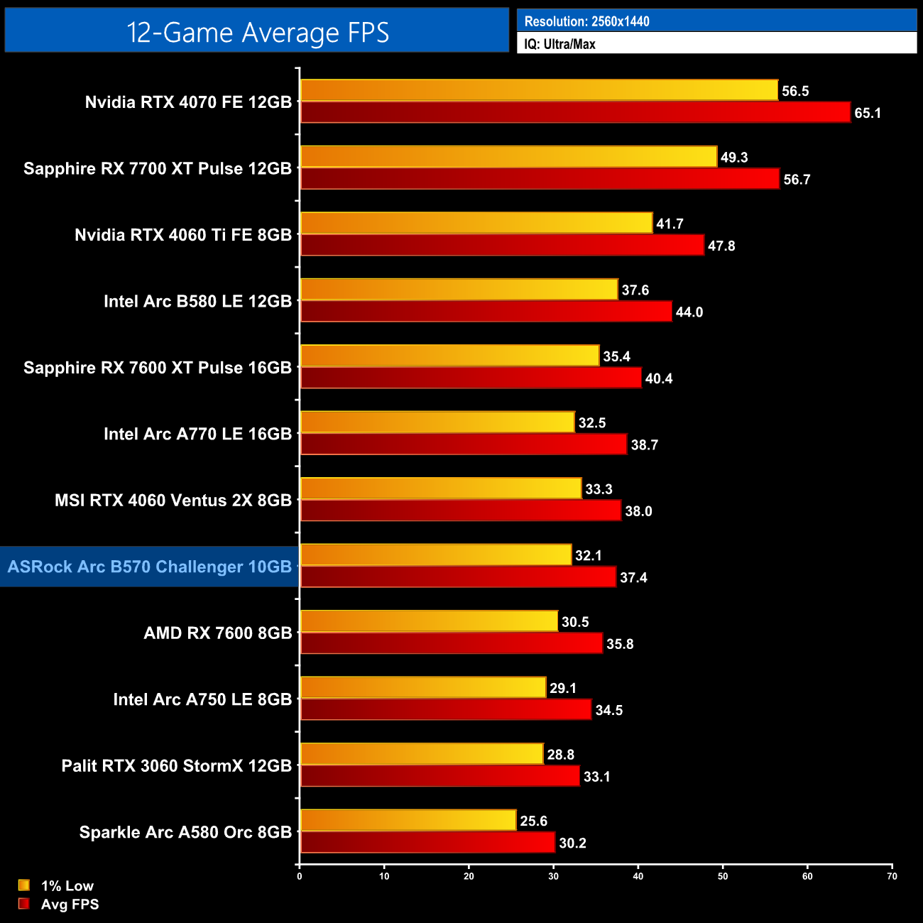 At 1440p we still get a solid 56fps, too, putting the B570 within just 1% of the RX 7600.