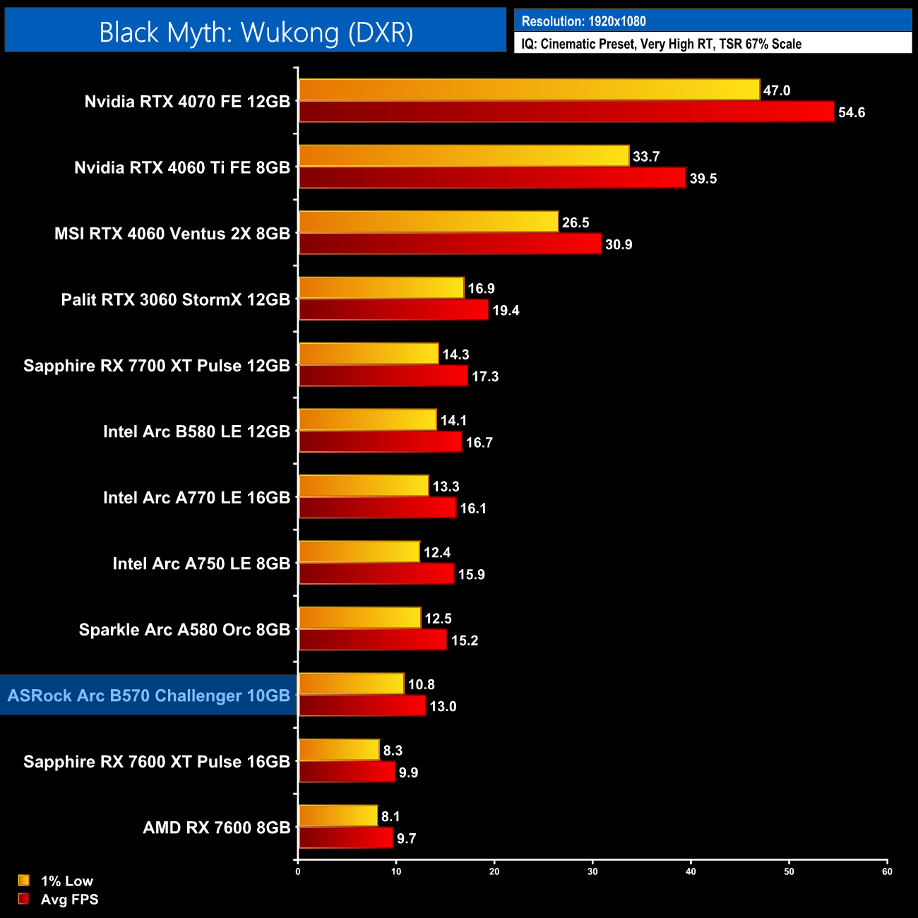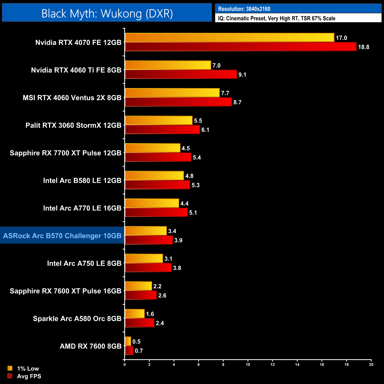 Black Myth: Wukong is even worse, this game is clearly best placed to played on Nvidia GPUs and the B570 falls well down the chart, averaging just 13fps, again even with upscaling enabled.