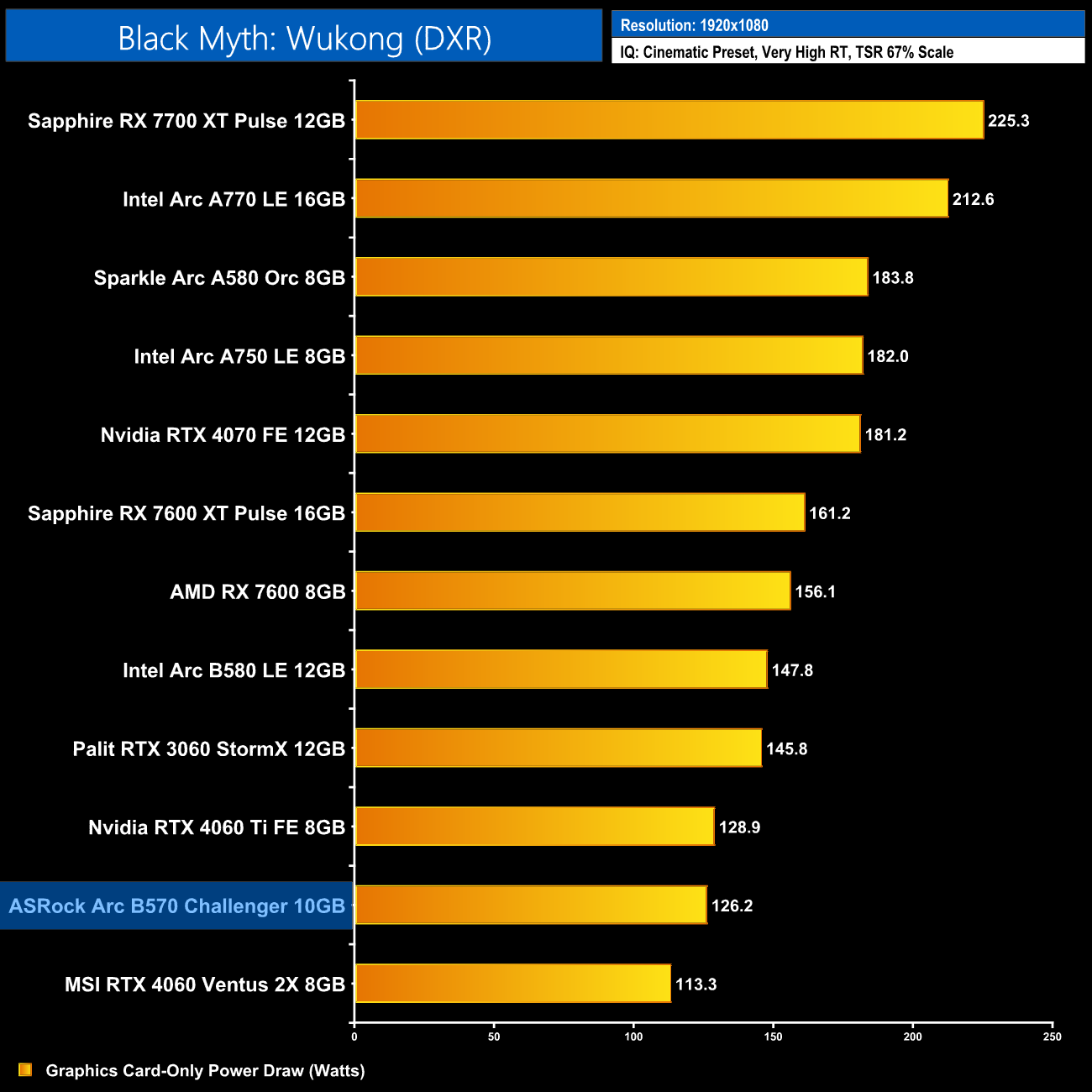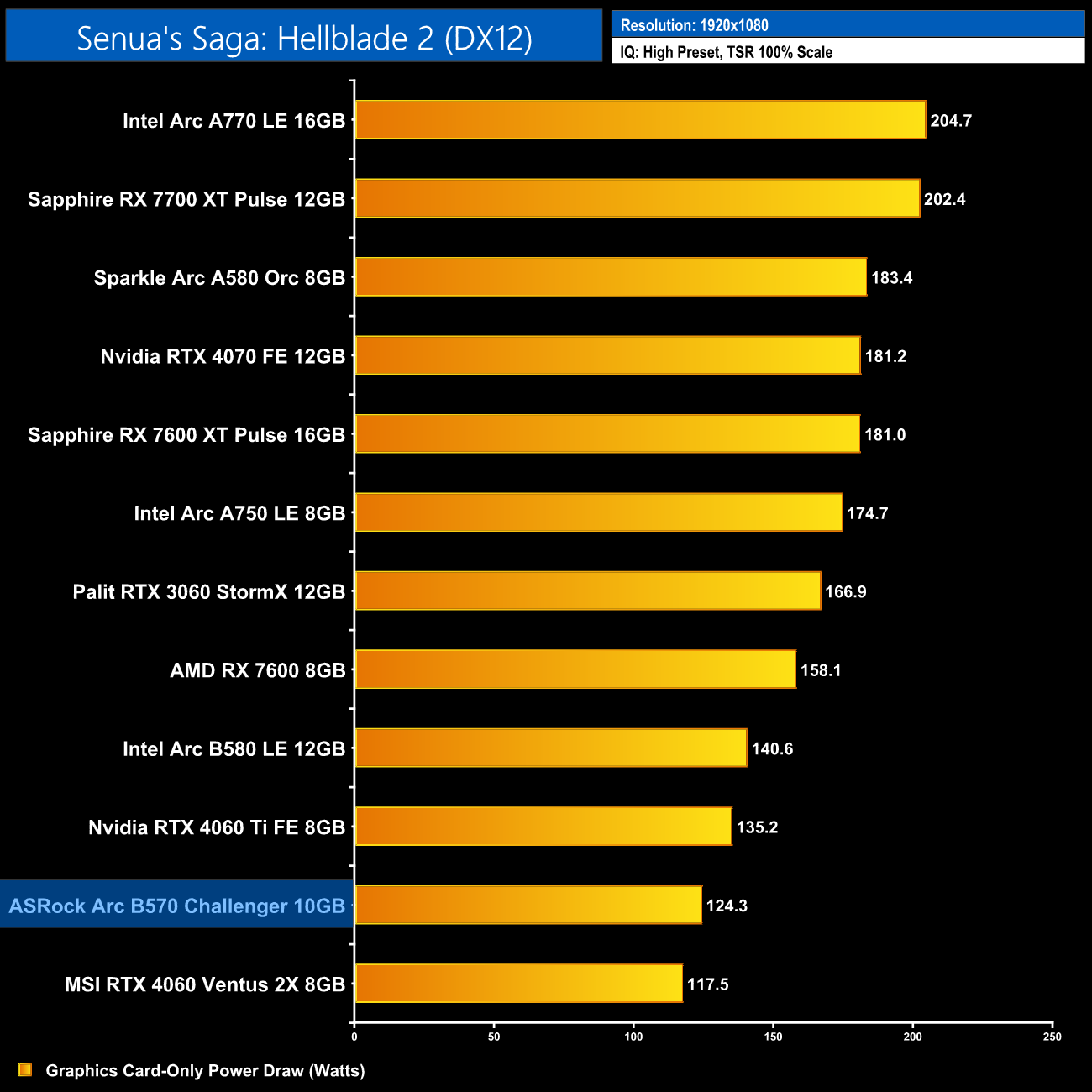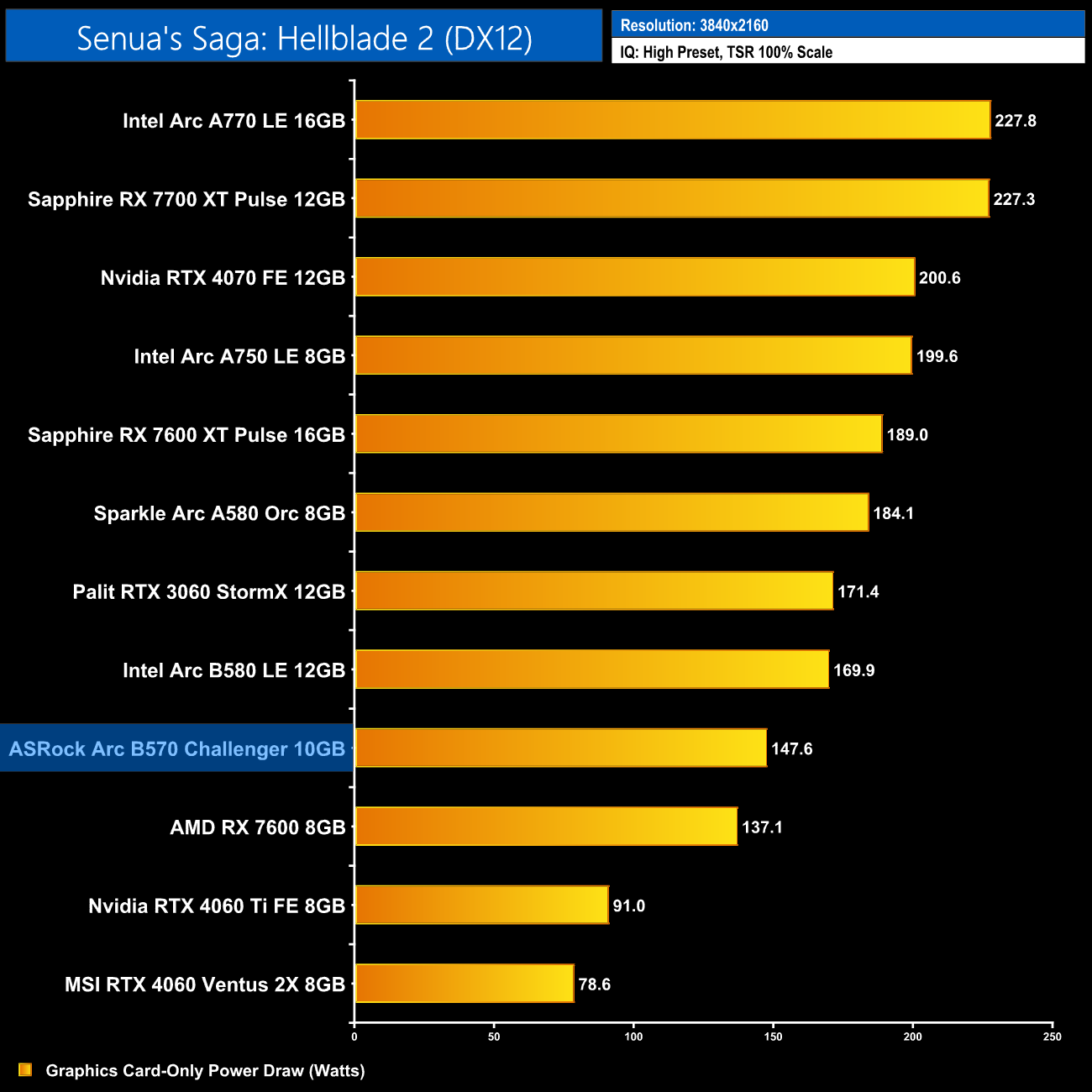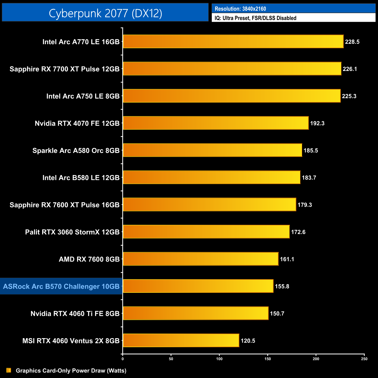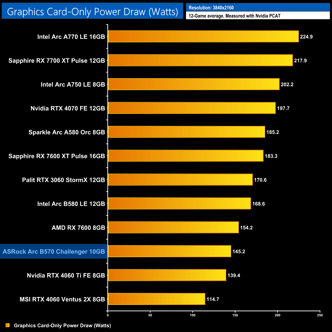 Lastly, total system power draw shows us what we already knew – the B570 is a very low-power graphics card, with the system pulling just over 270W at the wall. Only the RTX 4060 drew less.