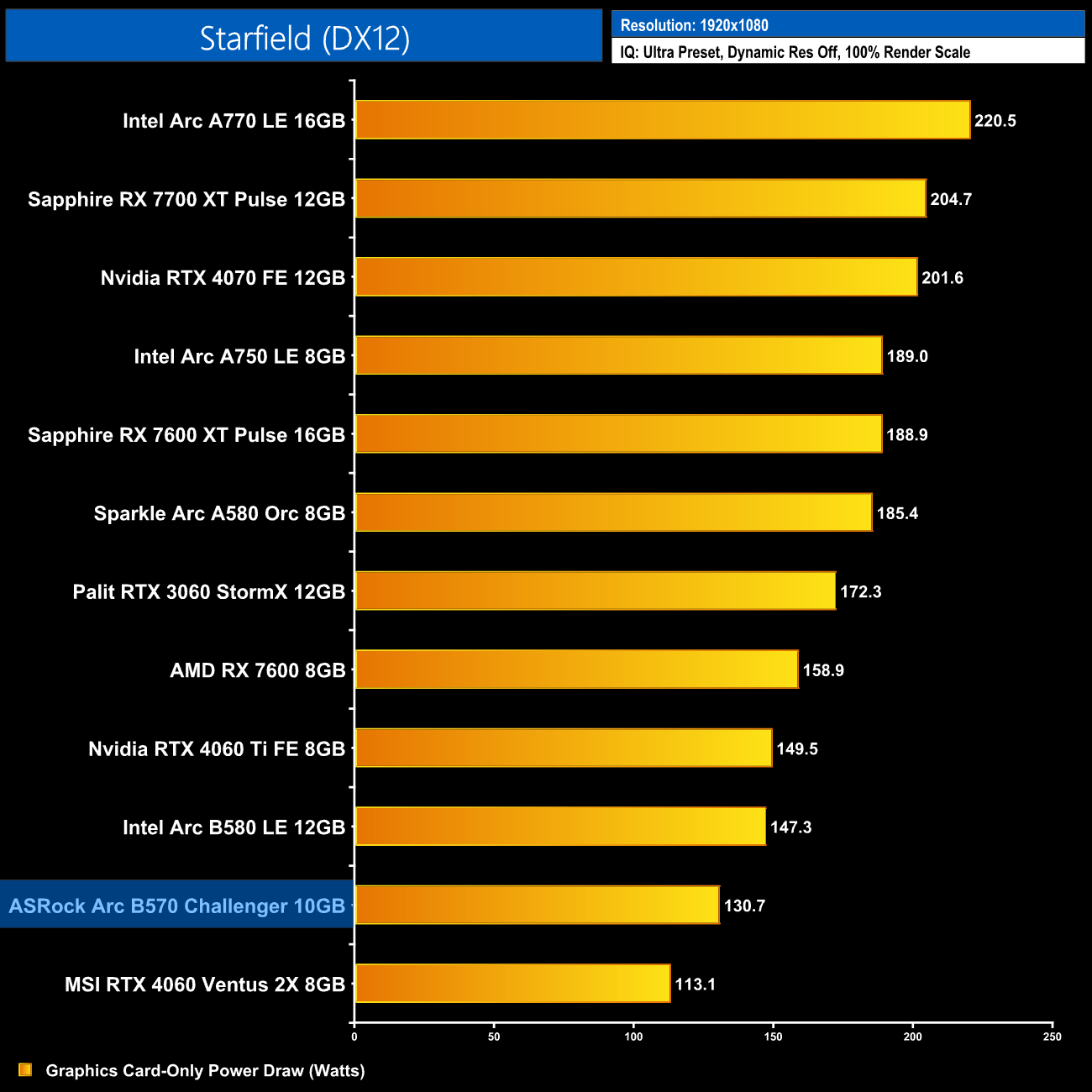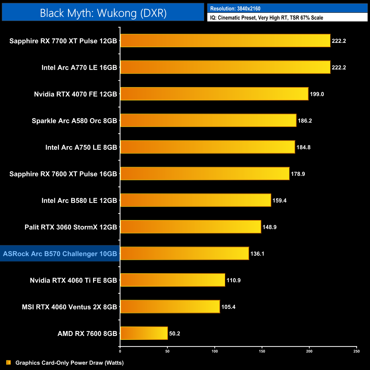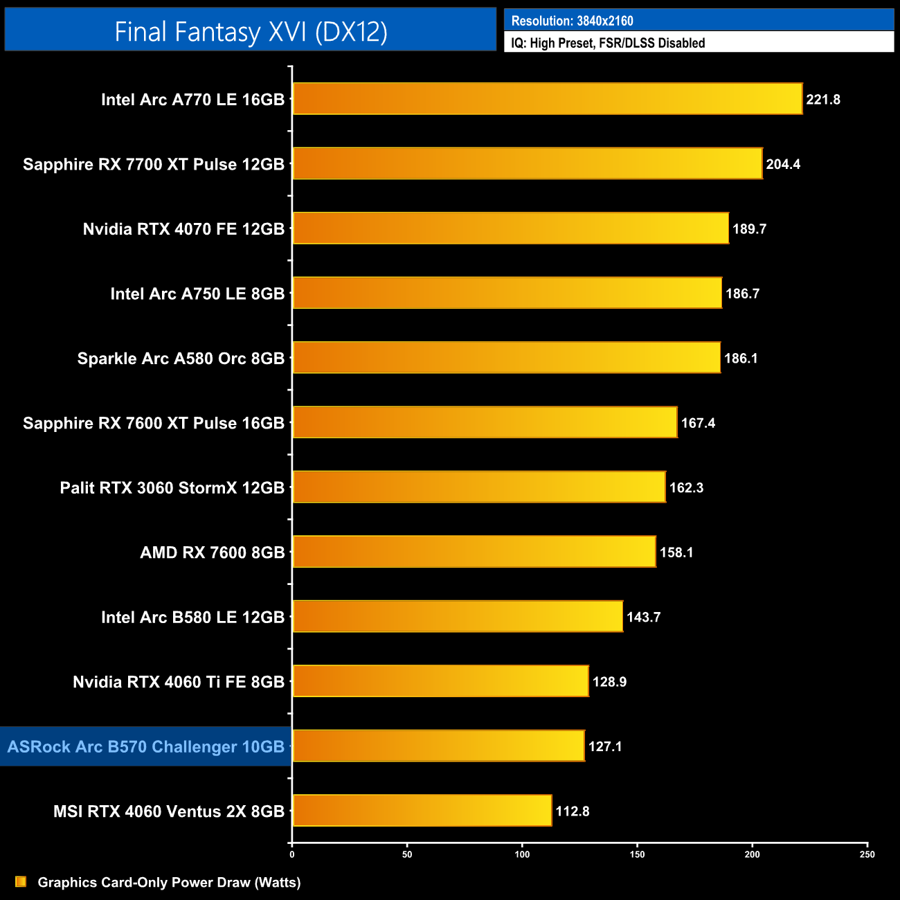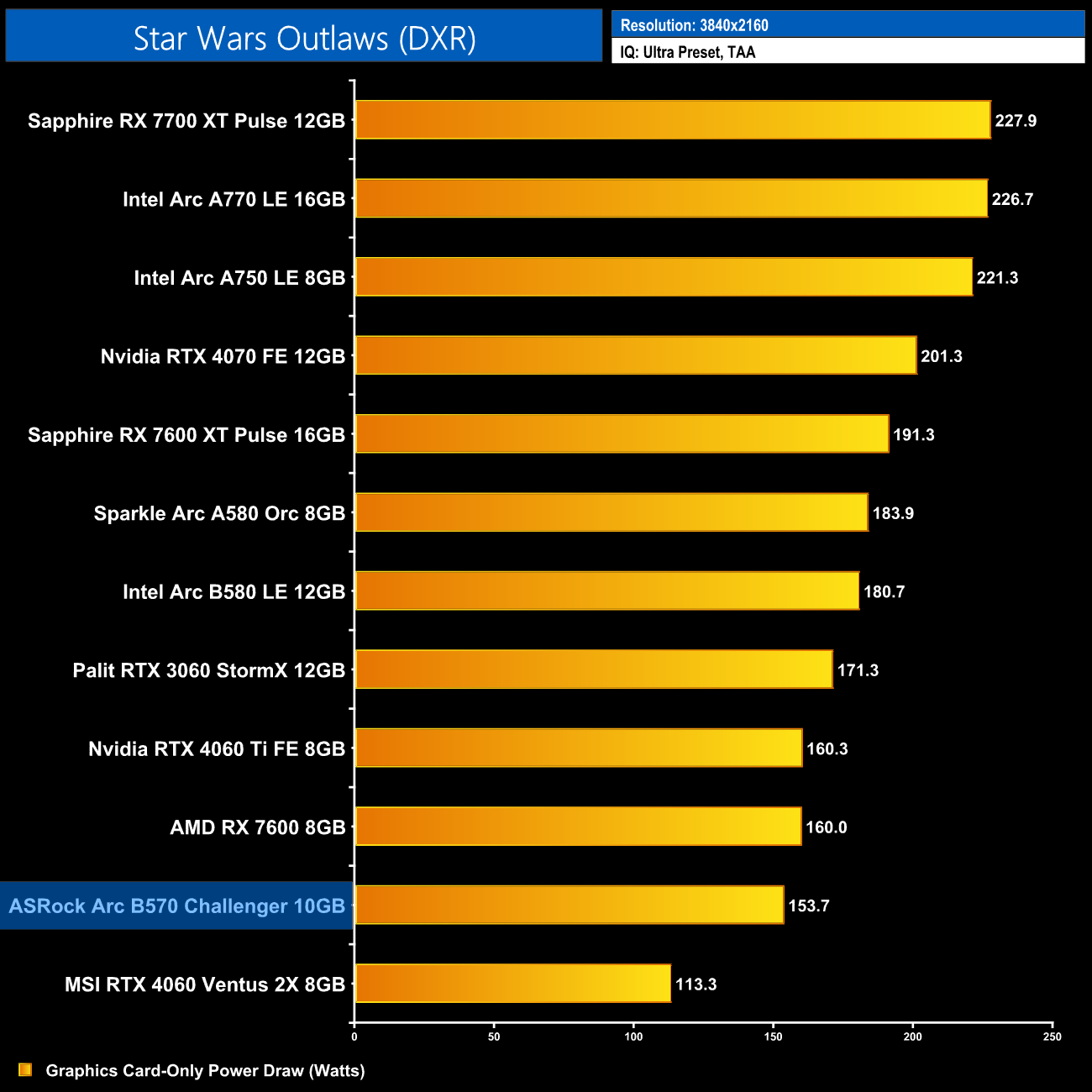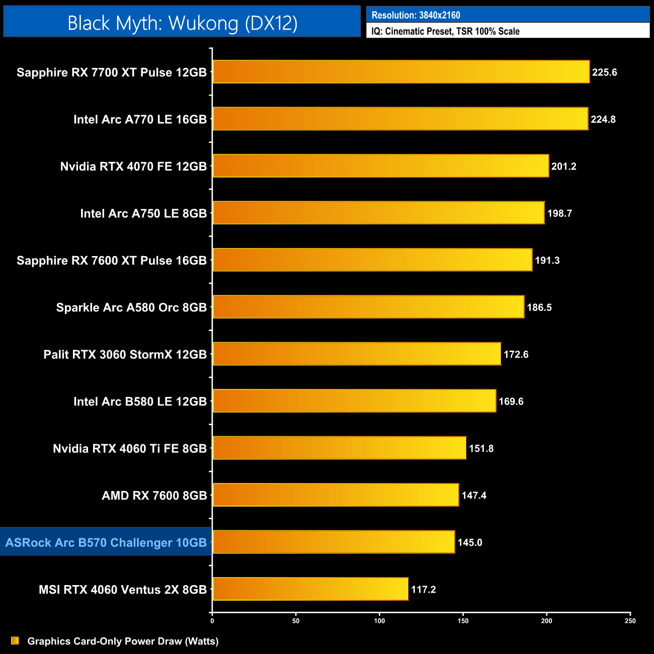 Lastly, total system power draw shows us what we already knew – the B570 is a very low-power graphics card, with the system pulling just over 270W at the wall. Only the RTX 4060 drew less.