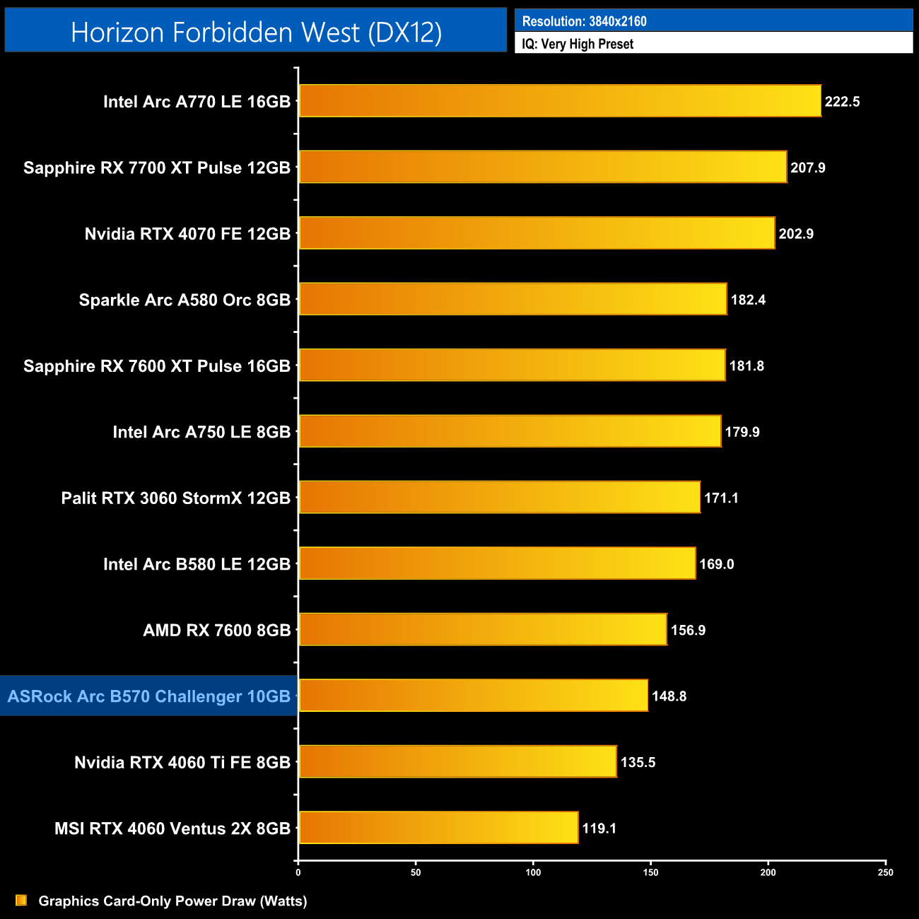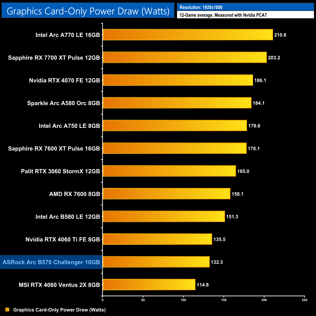 As for power draw of the graphics card, Intel states a TBP of 150W, but as with the B580, in practice the actual power draw is much lower. Averaged over the twelve games I tested, the Challenger drew 132.3W, making it a very low-power GPU indeed.