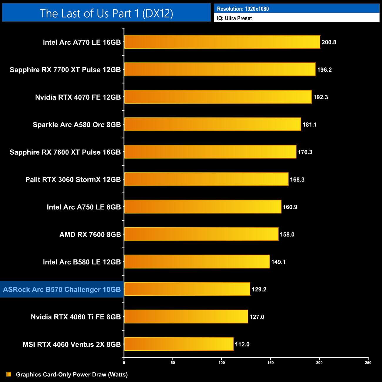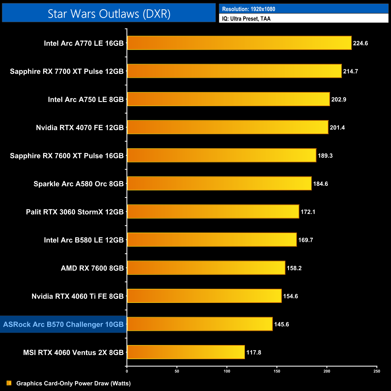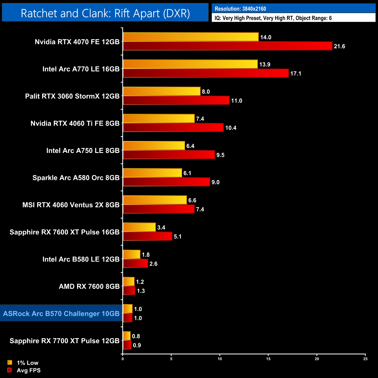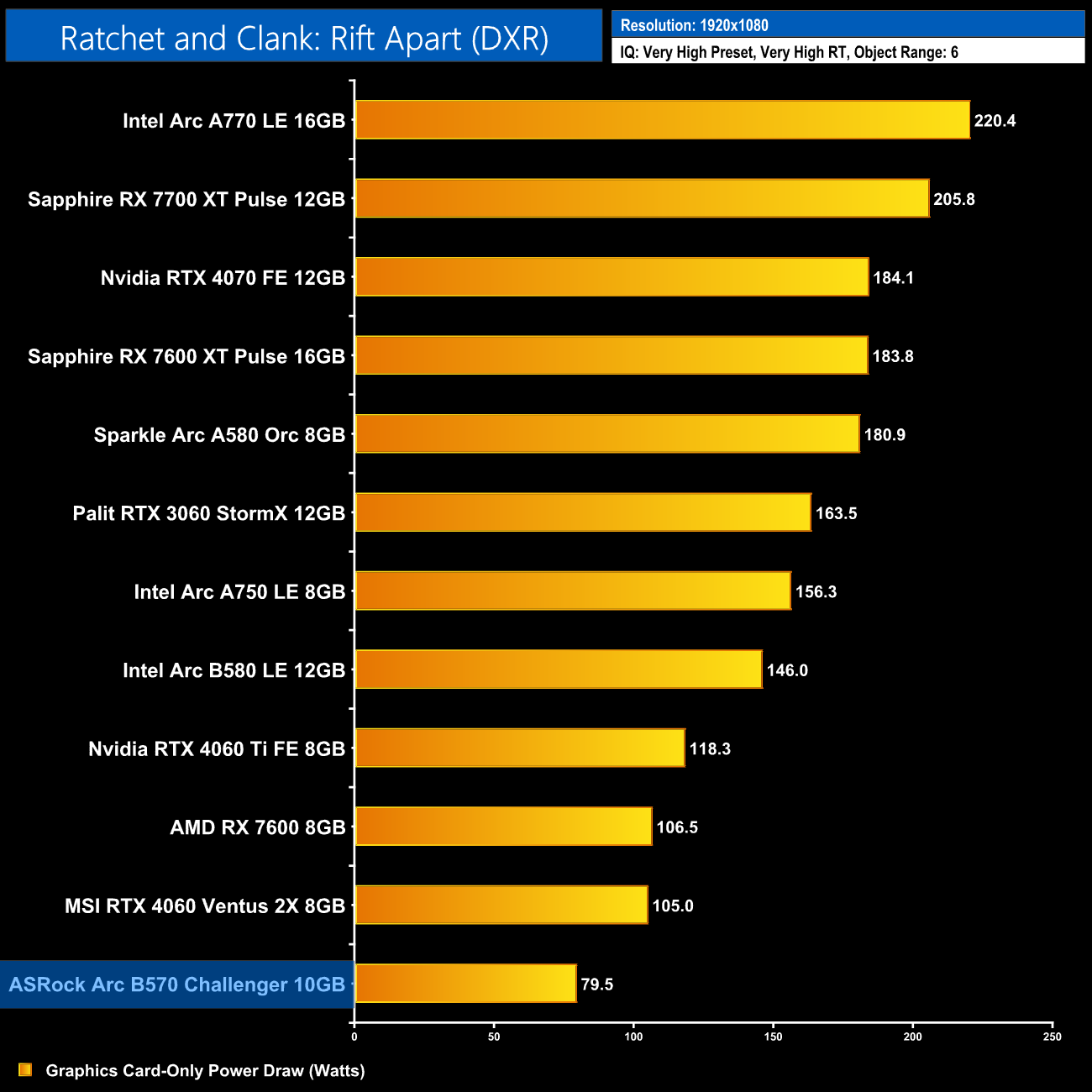 Ratchet and Clank remains seemingly completely broken on Battlemage GPUs. The B570 proved even worse than the B580 and was a stuttery mess the whole time, barely getting above 10fps at times. Interestingly, when looking at GPU power draw, I noticed it was very low for the B570, barely 60-70 Watts, perhaps suggesting there's some sort of bandwidth issue at play as the GPU is being starved, but it's hard to say for sure.
