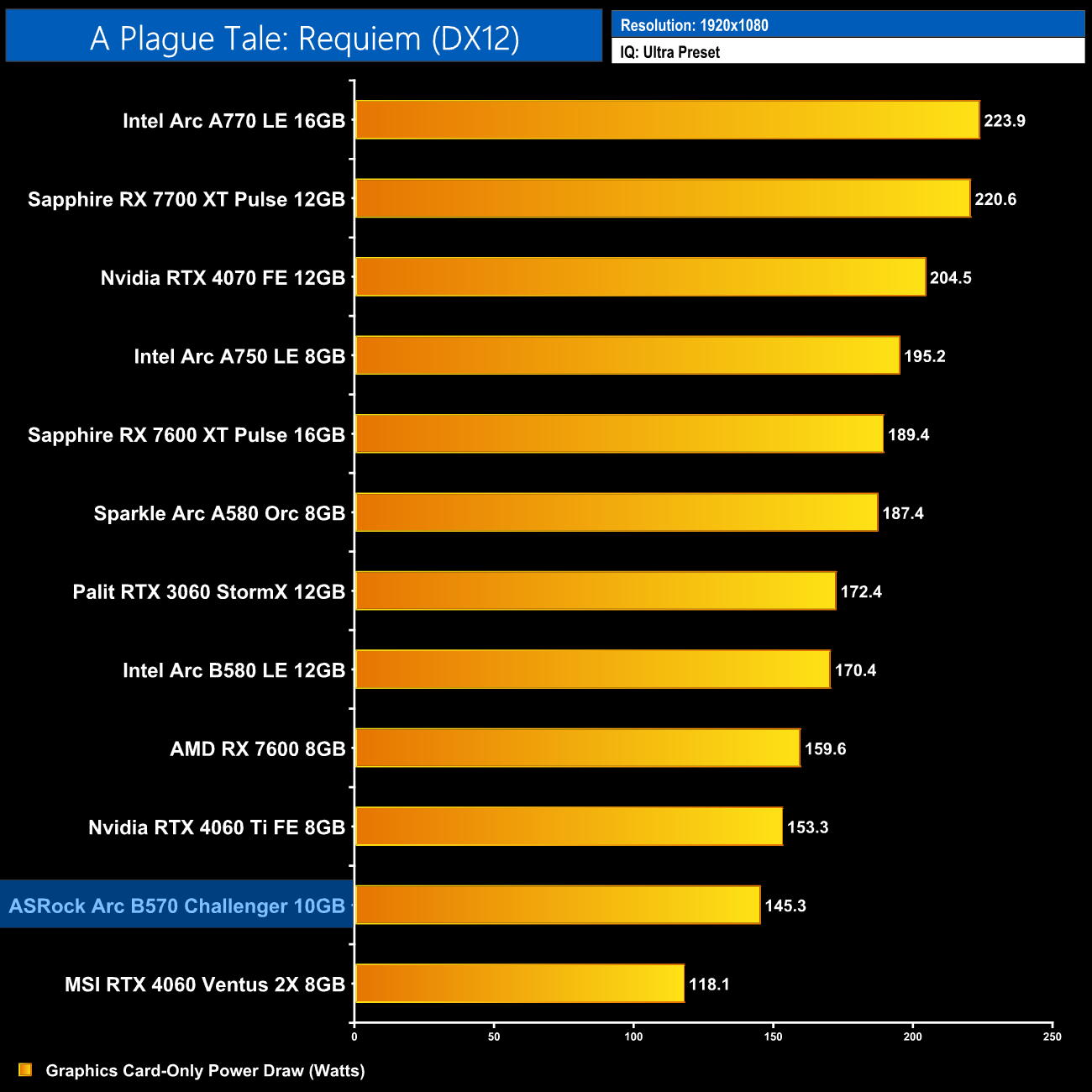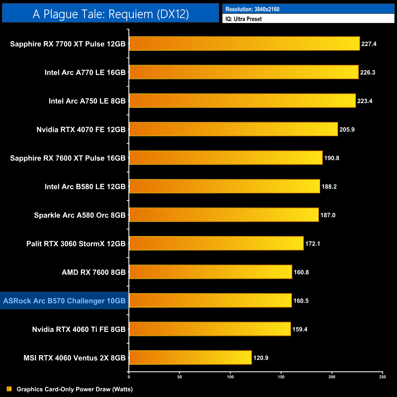 We measure system-wide power draw from the wall while running A Plague Tale: Requiem for 30 minutes (4K resolution).