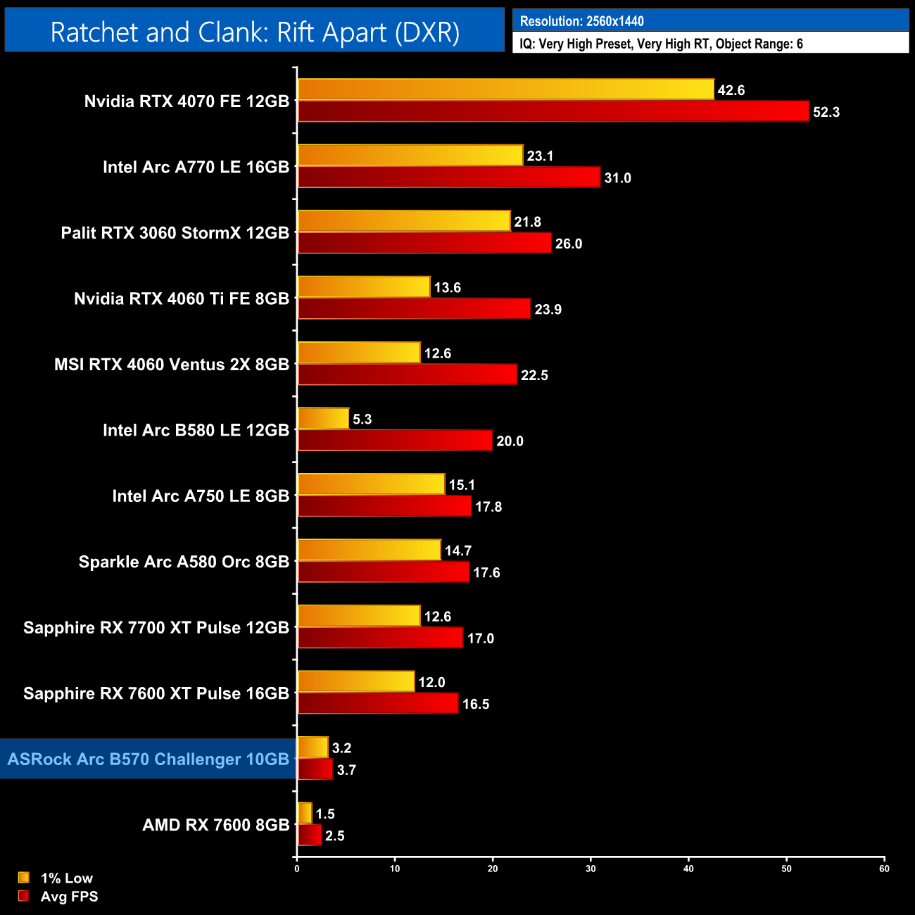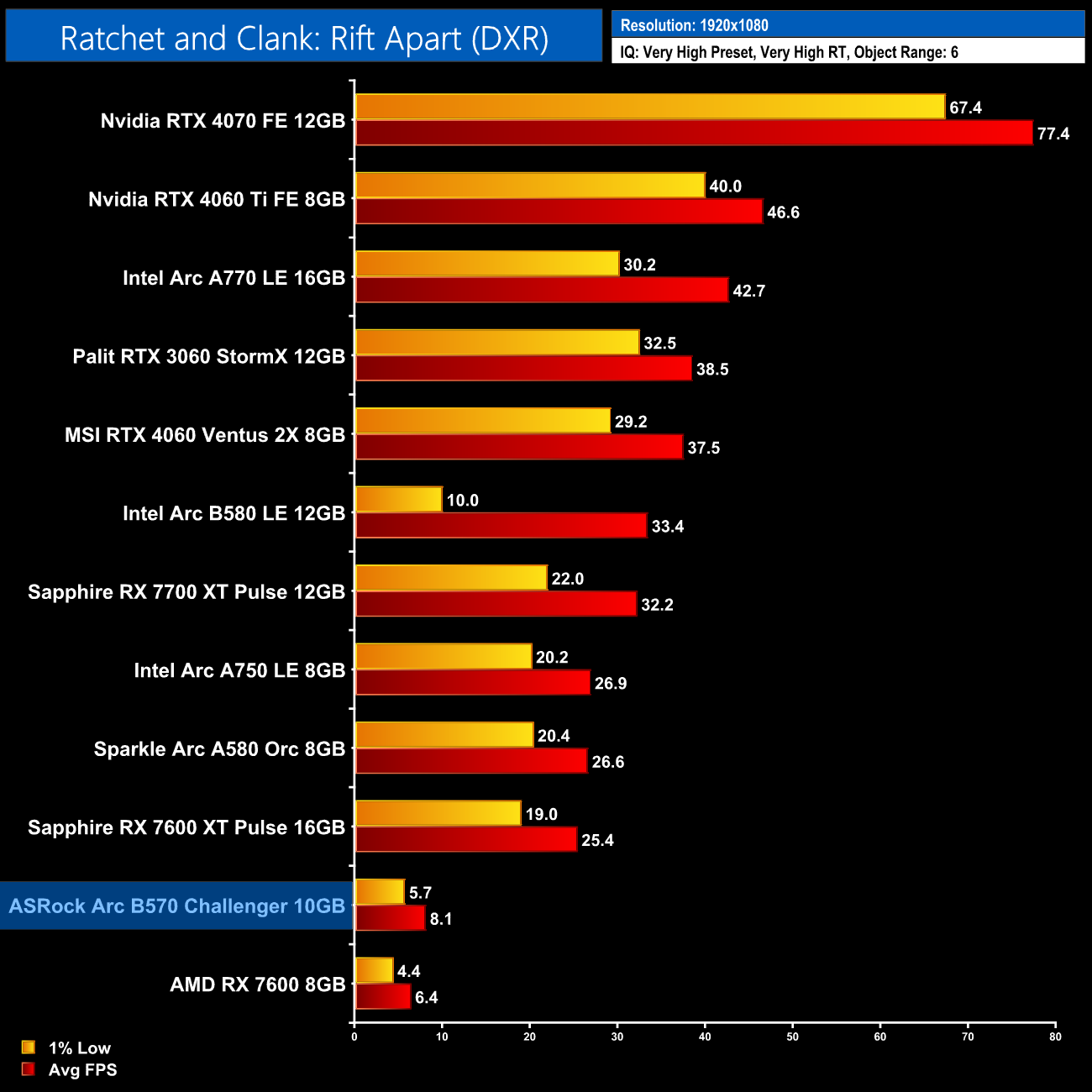 Overall ray tracing performance is not as impressive as we saw from the B580. Granted, the abysmal performance in Ratchet and Clank does pull the average down, but we're looking at the B570 coming in 21% slower on average than its bigger sibling. That still means it's on par with the RX 7600 XT – a GPU that's a good chunk more expensive – and it's not far off the RTX 3060 12GB.